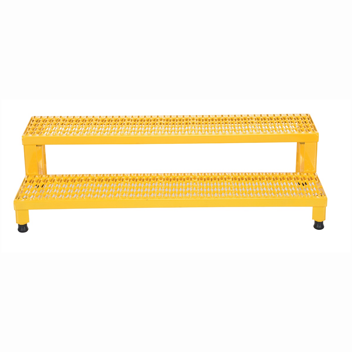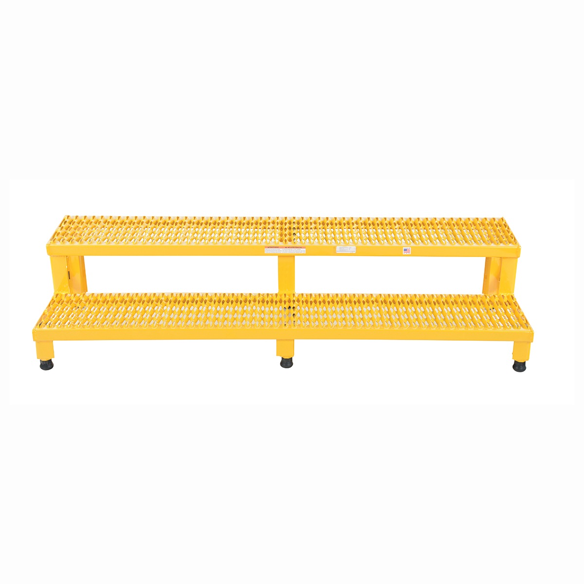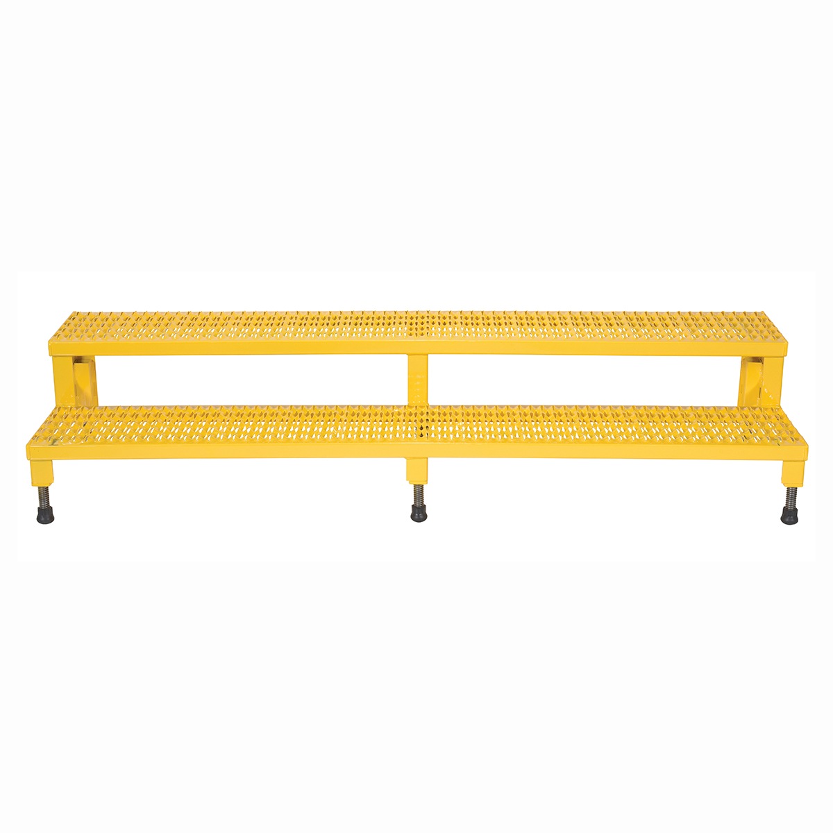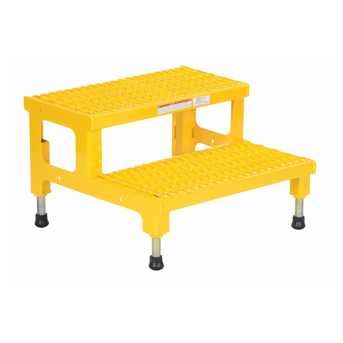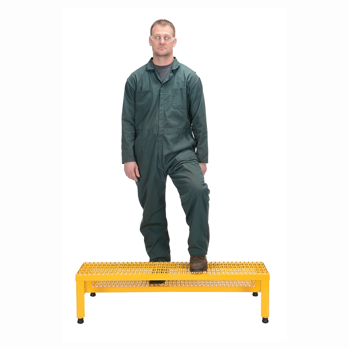 The Adjustable Step-Mate Stand can be used as either a comfortable worker platform or a semi-permanent step. The serrated surface ensures safe footing. The legs adjust individually by screwing them into or out of the leg base. The unit has a welded construction