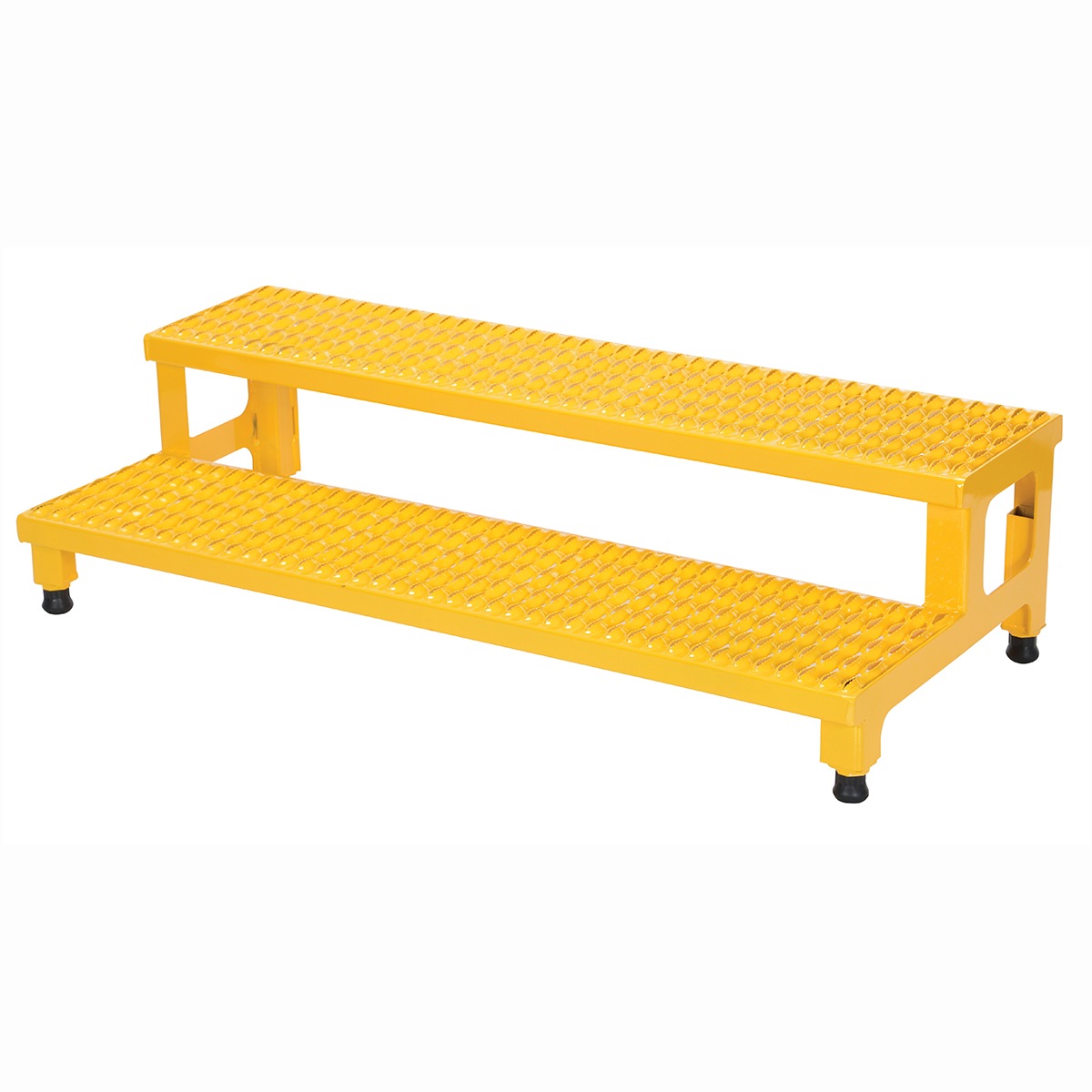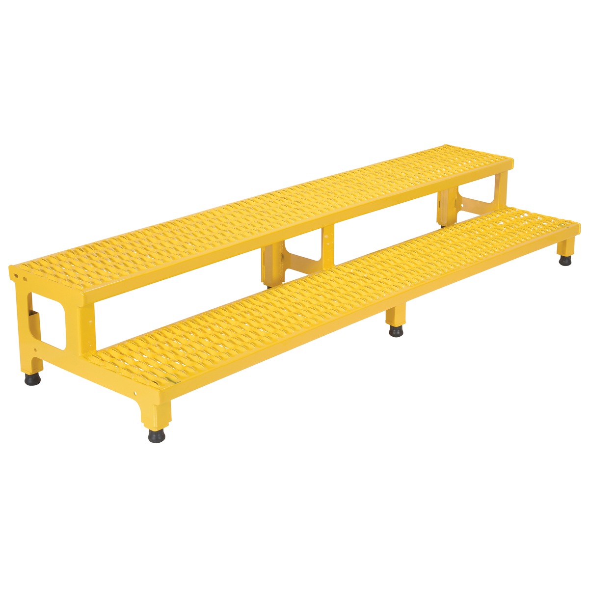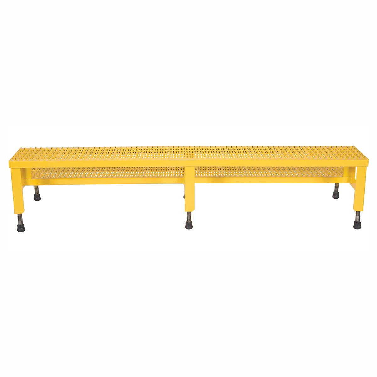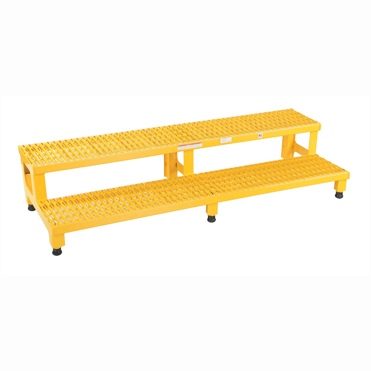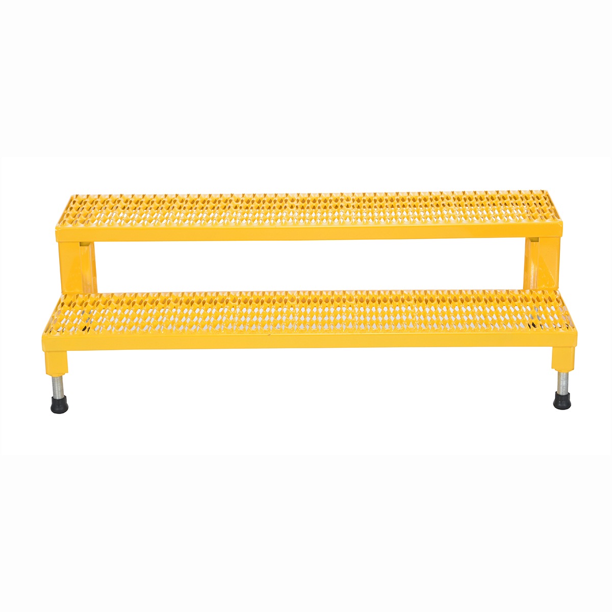 The Adjustable Step-Mate Stand can be used as either a comfortable worker platform or a semi-permanent step. The serrated surface ensures safe footing. The legs adjust individually by screwing them into or out of the leg base. The unit has a welded construction