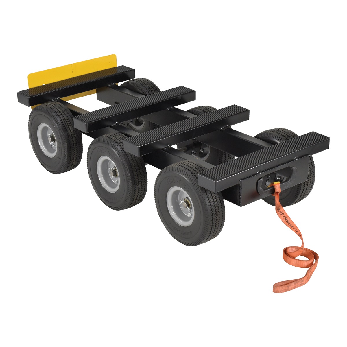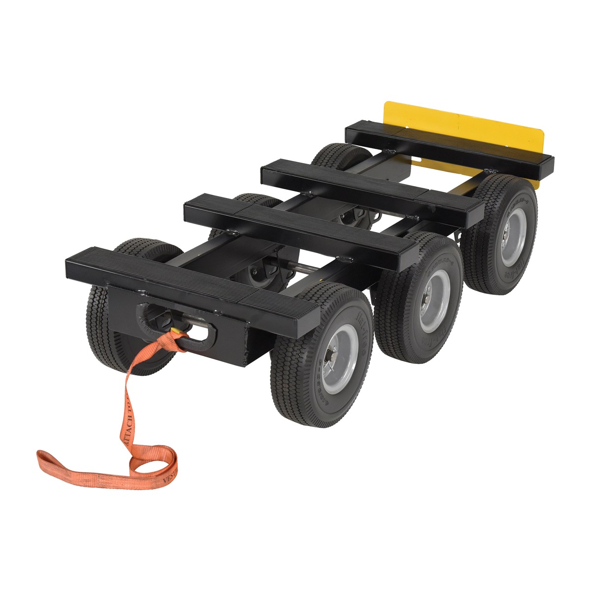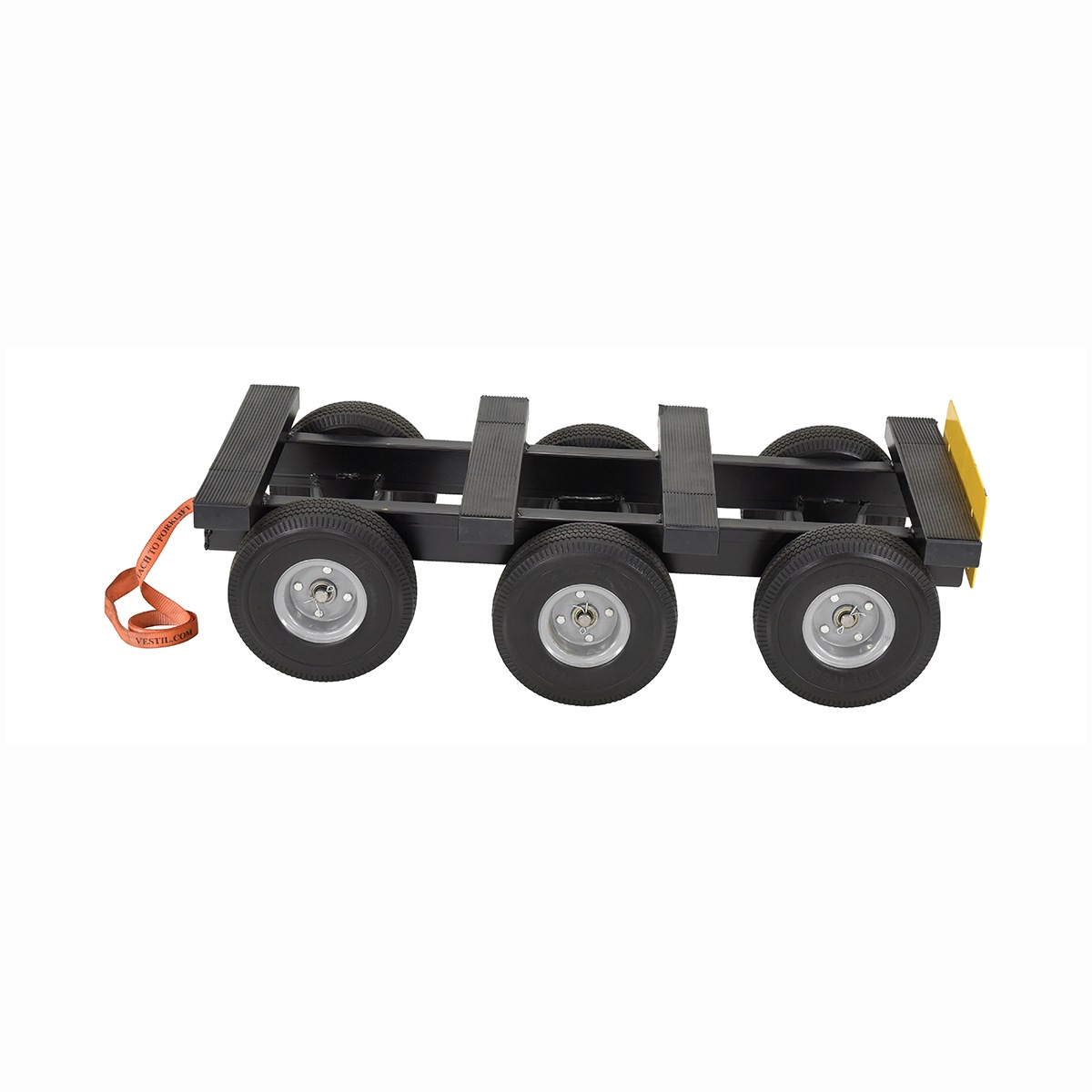 A six wheel dolly can be a major benefit in many conditions. The large oversized wheels give the unit, and any material on board, a smooth vessel to move goods in between areas. Yellow adjustable plate fitted to the rear of the unit. The plate acts as a barrier for items that fit snuggly on the dolly. When the plate is down, it makes room for any oversized products that are too long to fit perfectly square onto the platforms of the dolly. The front of the dolly is an open design that makes it easy to secure any sort of pulling device that may be used. Also included is a strap that can be used to pull the unit, by mechanical or manual means.