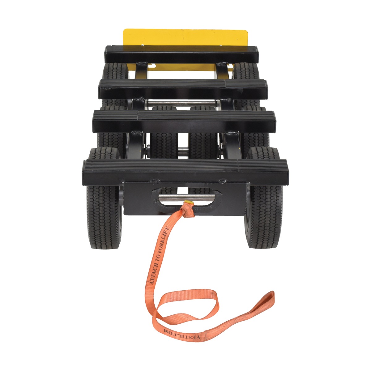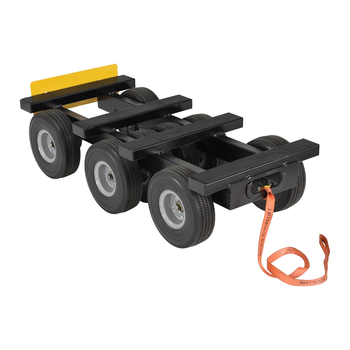 An eight wheel dolly can be a major benefit in many conditions. The large oversized wheels give the unit and any material on board, a smooth vessel to move goods in between areas. Yellow adjustable plate fitted to the rear of the unit. The plate acts as a barrier for items that fit snuggly on the dolly. When the plate is down, it makes room for any oversized products that are too long to fit perfectly square onto the platforms of the dolly. The front of the dolly is an open design that makes it easy to secure any sort of pulling device that may be used. Also included is a strap that can be used to pull the unit, by mechanical or manual means. The eight wheel unit provides added capacity to the unit by including two extra wheels to center of the dolly for a more solid foundation.