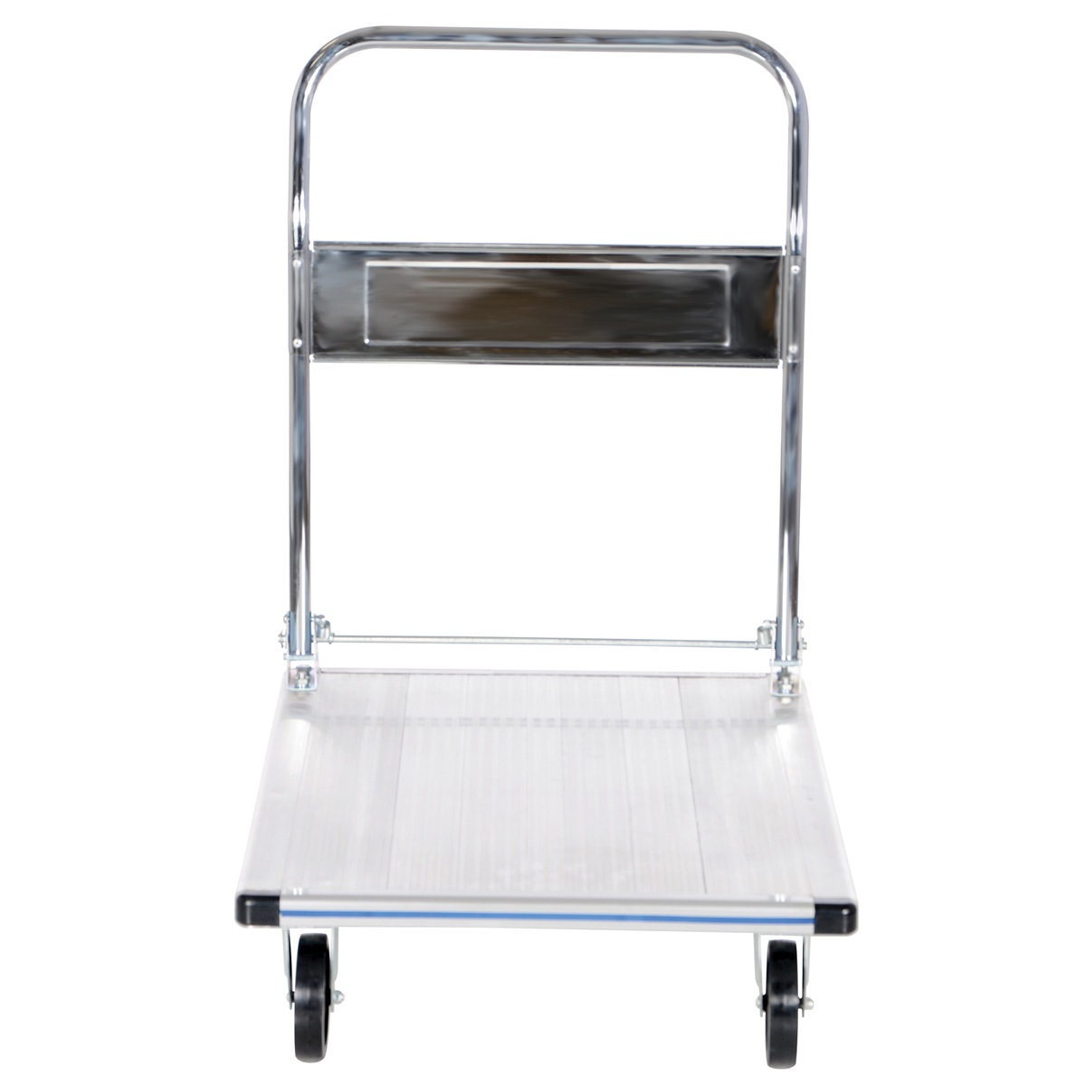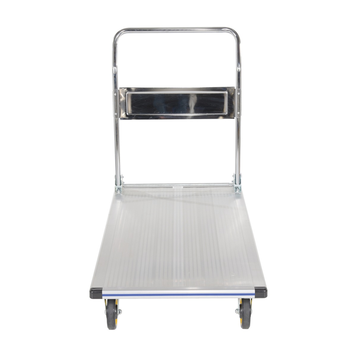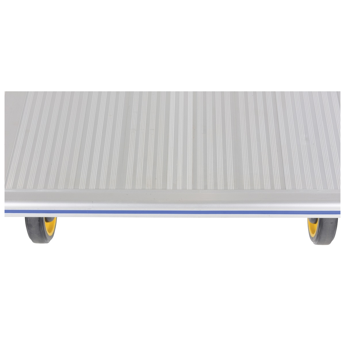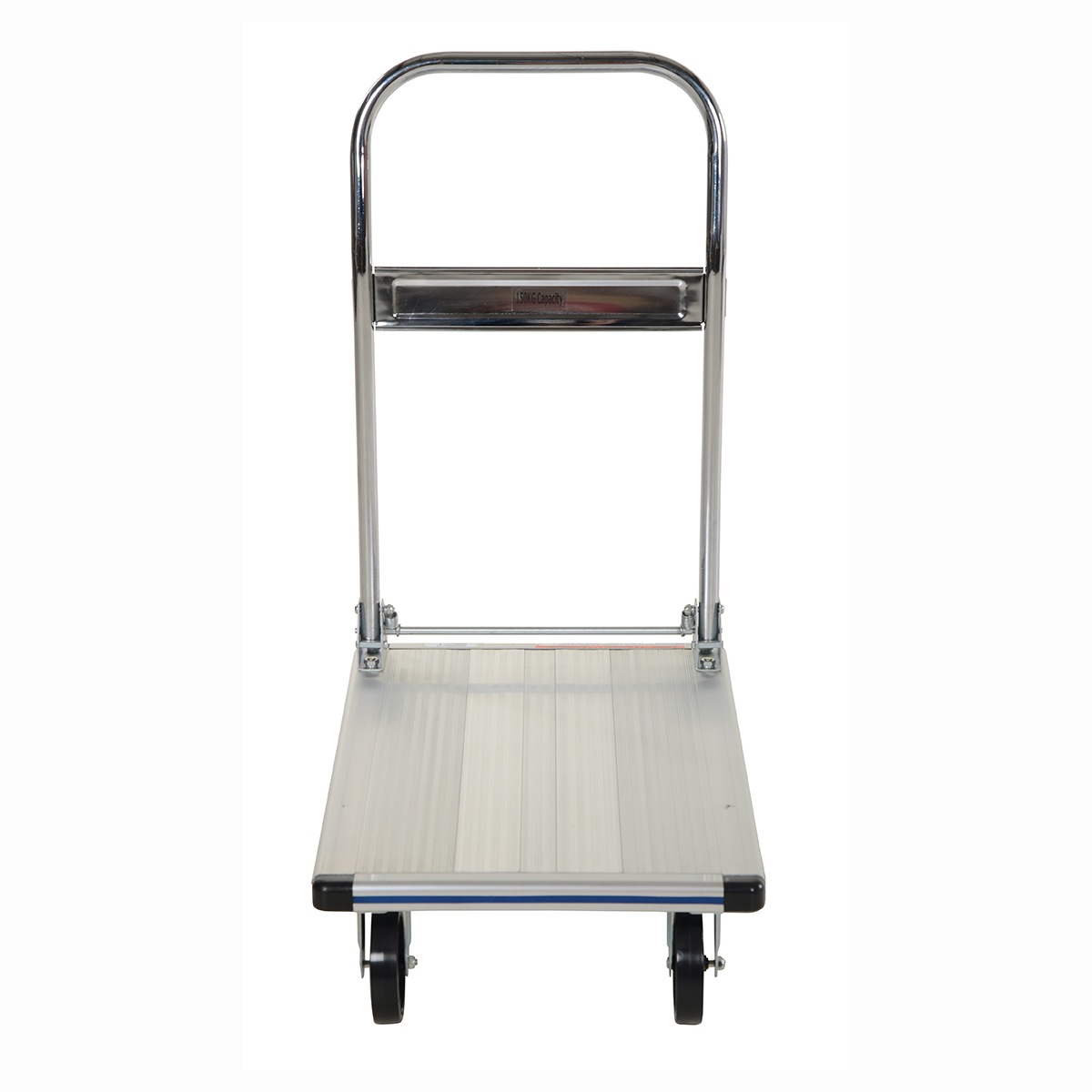 Use this Aluminum Folding Handle Platform Truck with non-marking casters for safe transportation of stacks of paper, small parts and other lightweight equipment. Ideal for maintenance rooms, offices, schools, hospitals, etc. Plastic corner protectors enhance durability and protect surroundings. The unit has a rugged aluminum construction with single handle design.