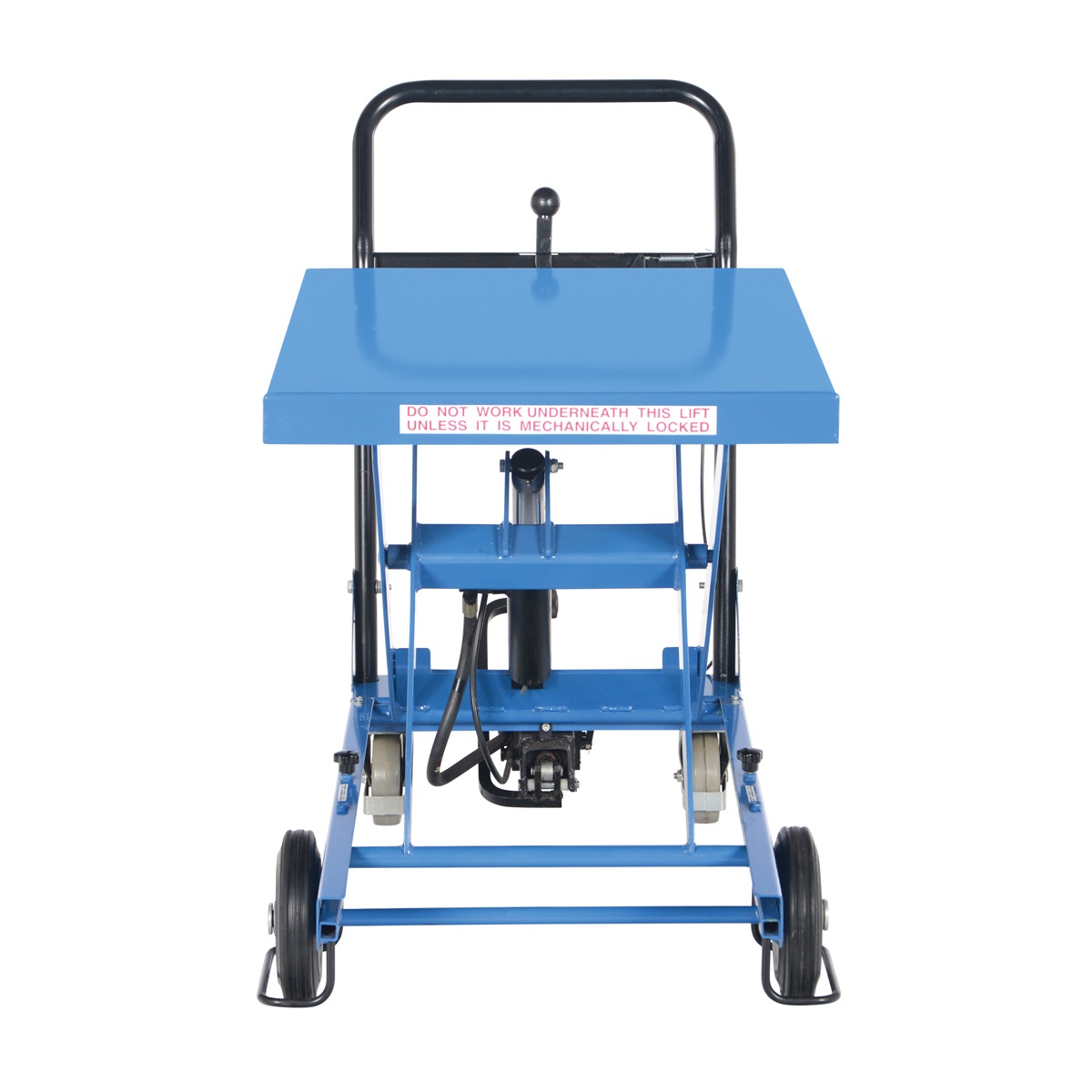 The Premium Scissor Lift Cart is constructed of heavy duty steel and designed to withstand the most demanding industrial environments. The simplicity and compactness of these products make them ideal for lifting and transporting loads, order-picking, die handling, and for use in support of assembly operations. There is little exertion required to maneuver the deck due to the high quality foot-actuated, single speed hydraulic pump for raising and a quick release hand lever for lowering. The hydraulic system is equipped with an overload protection valve. Each cart has safety stops to prevent an empty deck from lowering while performing maintenance. A unique tilt-up table top allows for safe and easy maintenance. The two rigid front casters and two rear swivel polyurethane casters with brake provide a high degree of maneuverability; each swivel wheel is protected by guards and is equipped with brakes. Features an internal safety velocity fuse in each cylinder.