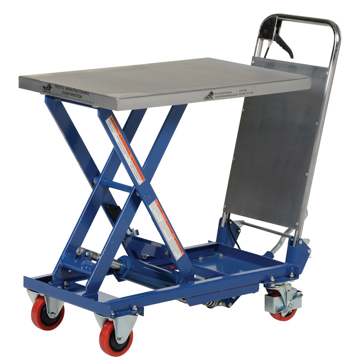 The Hydraulic Elevating Cart minimizes worker bending and lifting through its ergonomic design and portability. Material can be easily loaded onto a cart from a table, lowered to a safe transporting height, and raised to unload at destination. The foot pump includes a soft-lowering down valve. The unit moves easily on four polyurethane casters; two swivel with brakes and two rigid. Features a single-speed foot pump. Features an internal safety velocity fuse in each cylinder.