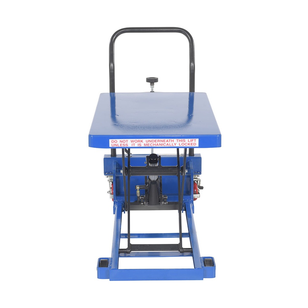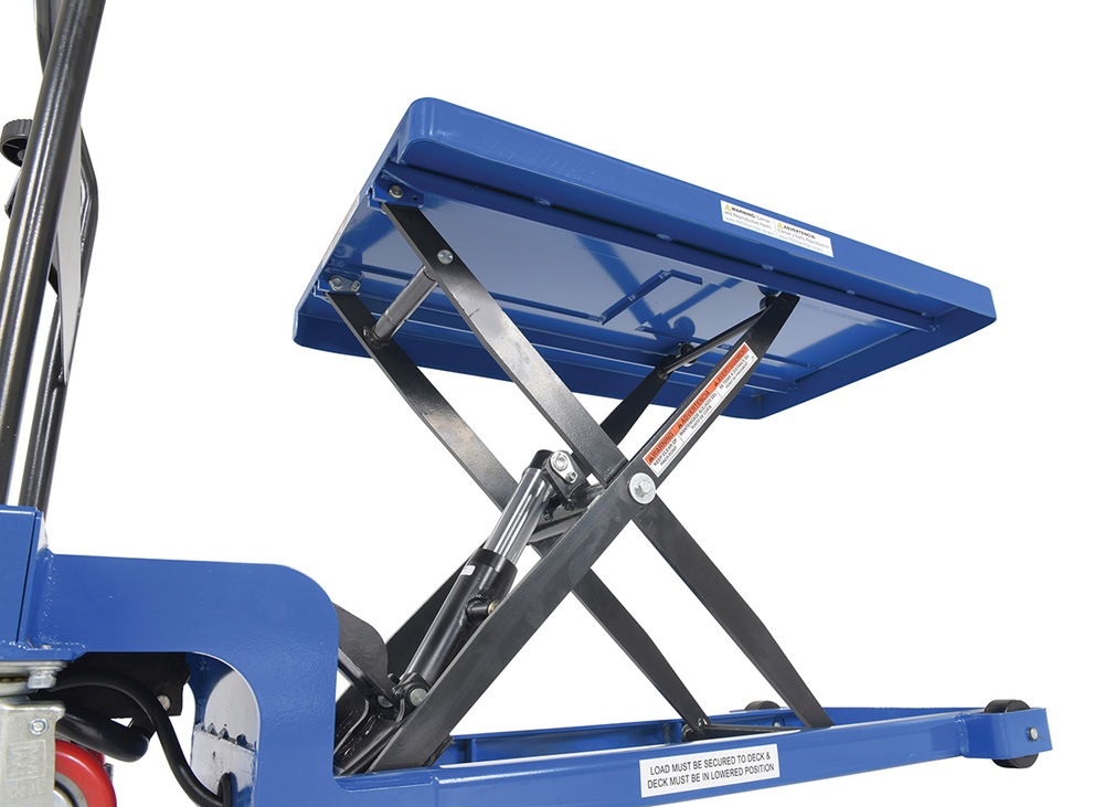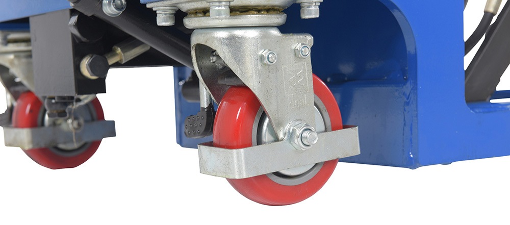In areas of congestion a low profile scissor cart is a must. With a two speed foot pump, the platform is easily raised/lowered to the desired position. Not only is this design extremely efficient but also ergonomically friendly. With a raised steering handle the user can maintain a proper working posture during transit. The sleek steel design, with a powder coated finish for baked in added toughness, is simple to clean and limits needless scuffs or abrasions. Mold on rubber casters with brakes roll easily over a variety of surfaces.