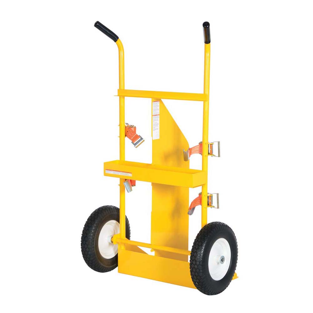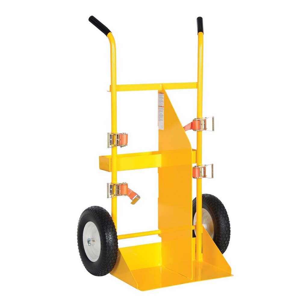 The Welding Cylinder Torch Cart is designed for transporting cylinders and cutting torch. Includes two (2) tank compartments with heavy-duty ratchet straps. Convenient open-top storage tray. Brackets are included for holding cutting torch and hose. Sturdy handles and large wheels for tilt-n-go portability. Welded steel construction with powder coat finish. Not designed for use as a storage means for gas cylinders.