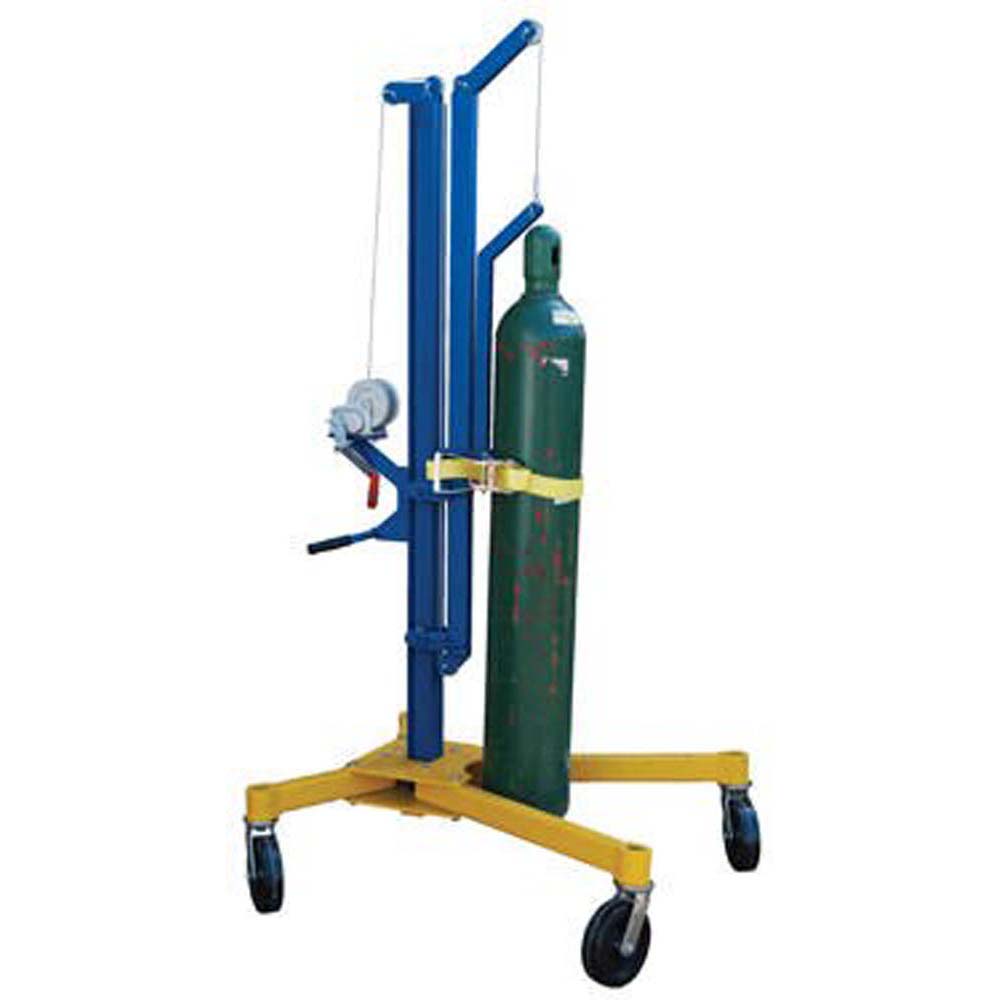 Perfect for transporting gas cylinders and loading them onto a truck. This unit raises cylinders by simply turning a mechanical hand crank to the desired height. Maximum cylinder diameter 11-1/2″ x 56″ tall. Cylinder is held in place with a tough polyester webbing strap that guards against damage and slipping.