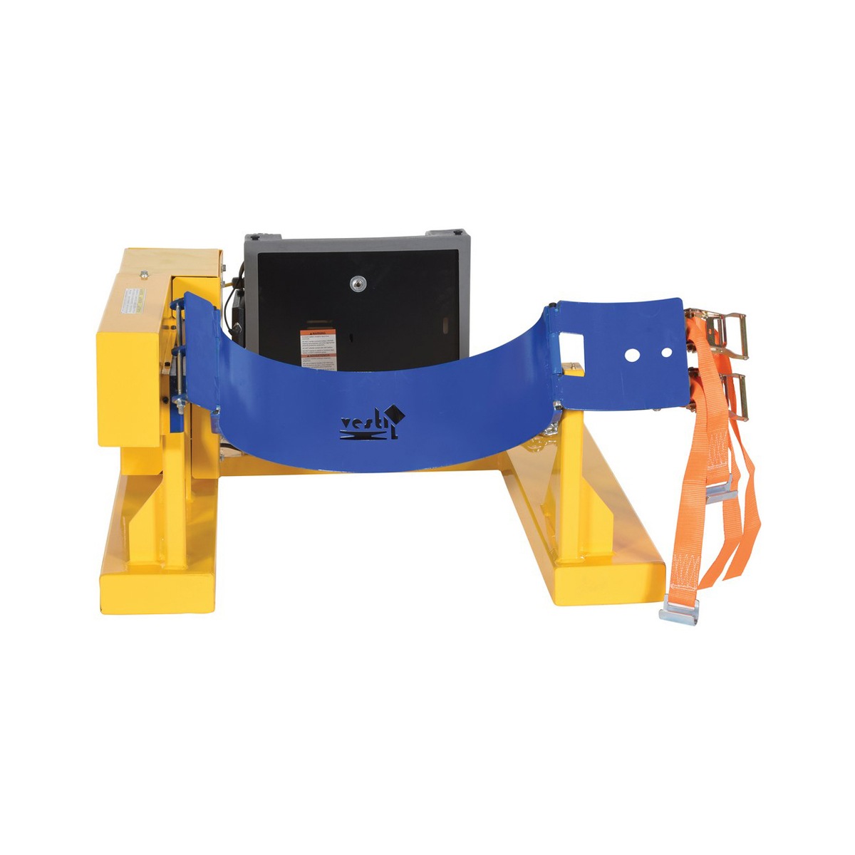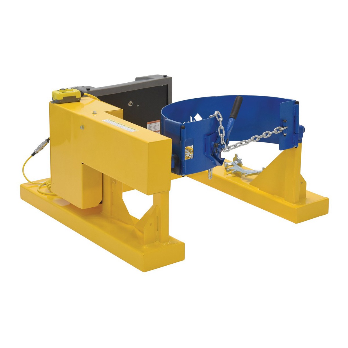 This Fork Truck Drum Carrier/Rotator allows you to easily transport and rotate steel drums using a fork truck. Drums are held securely in place by a durable chain locking system. Carrier/Rotator is provided with a chain to allow the drum to be rotated from the fork truck operator’s seat. This DC powered unit includes batteries, on-board charger, battery charge indicator gauge and hand held control on a long coil cord. Drum must be full to rotate at rated capacity.