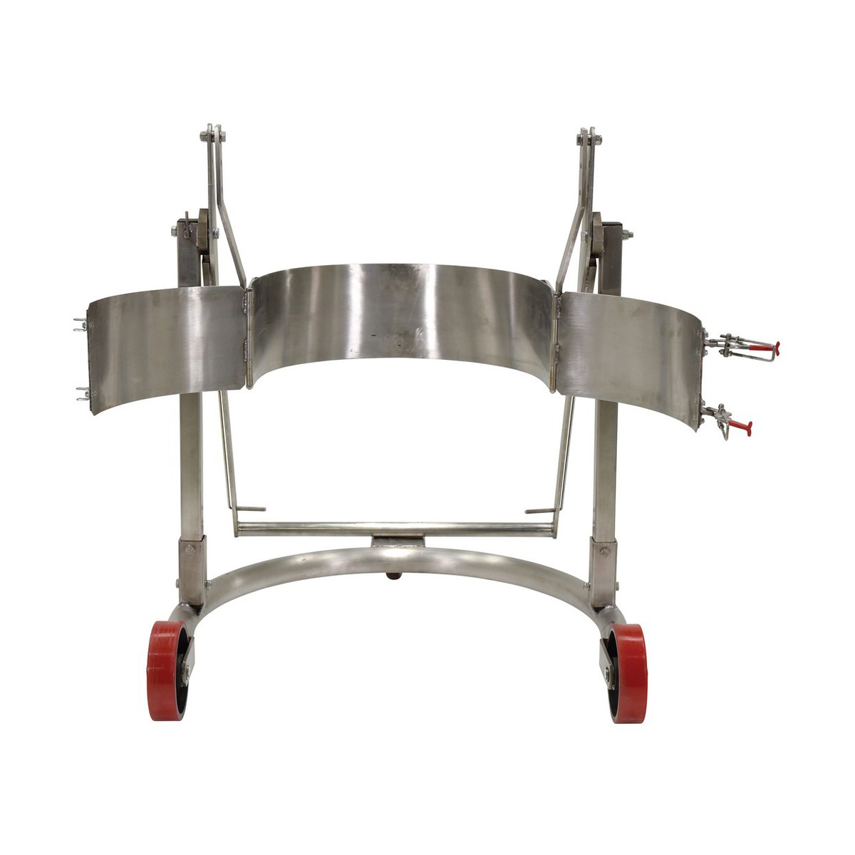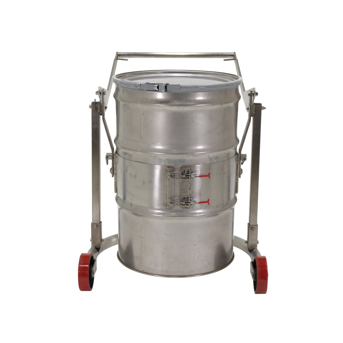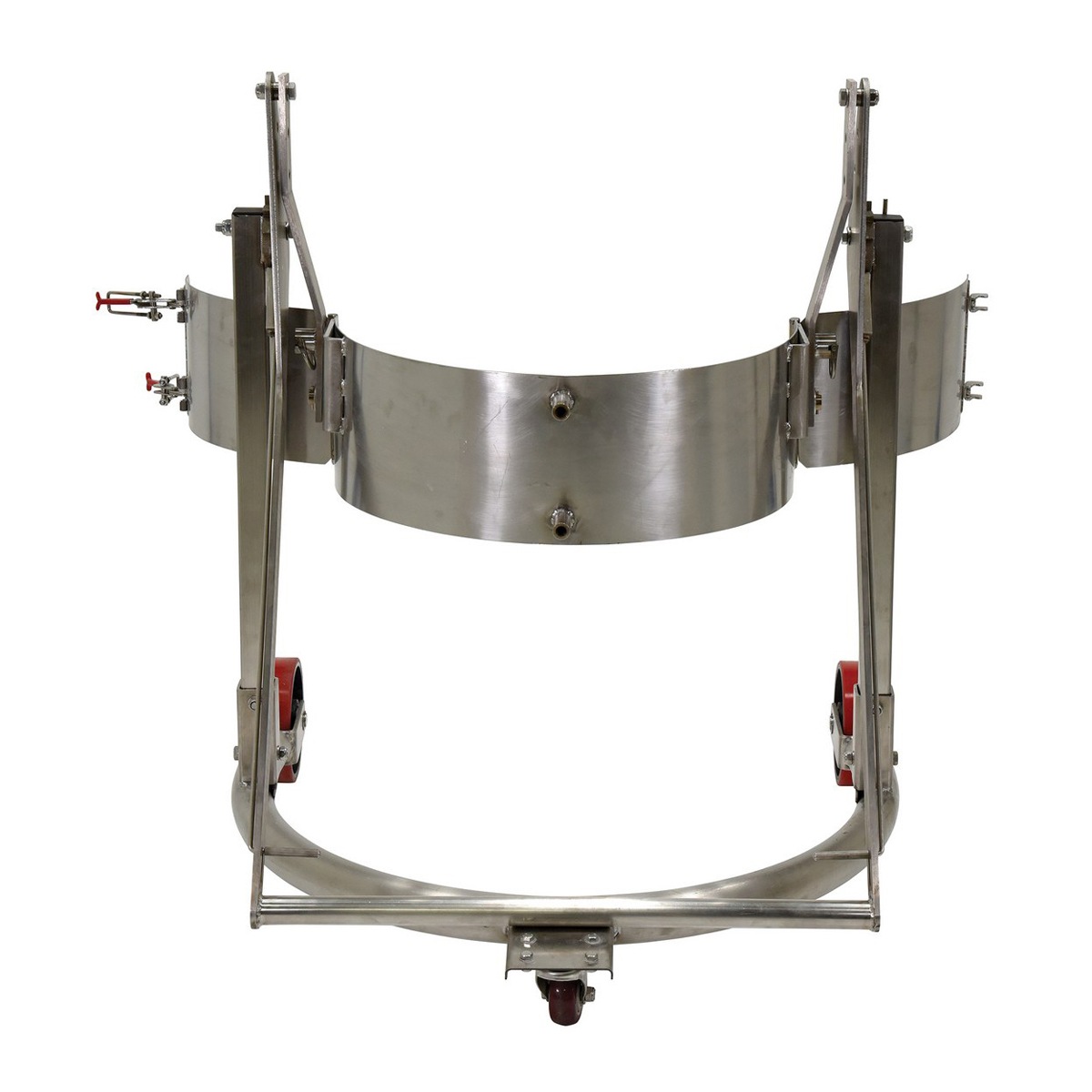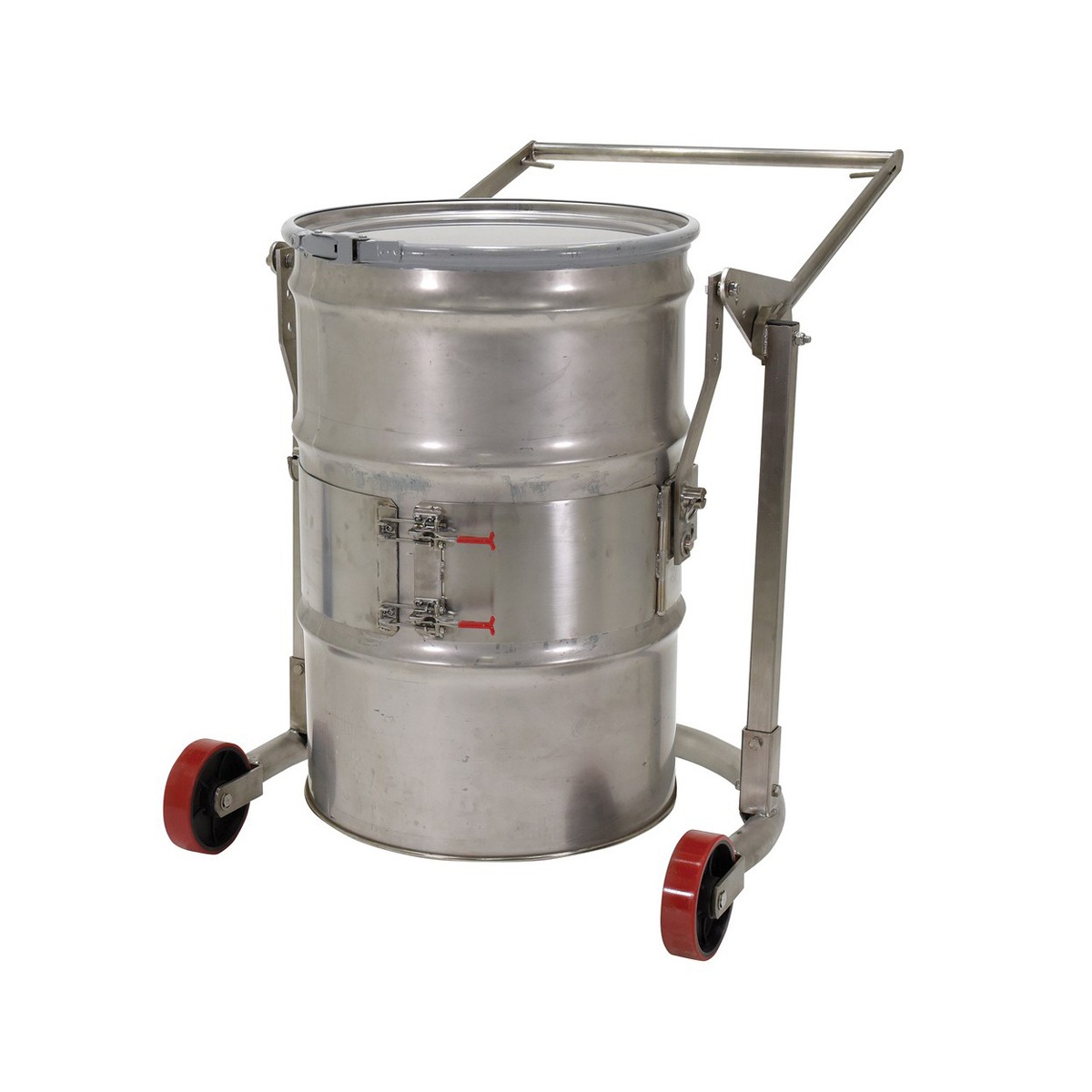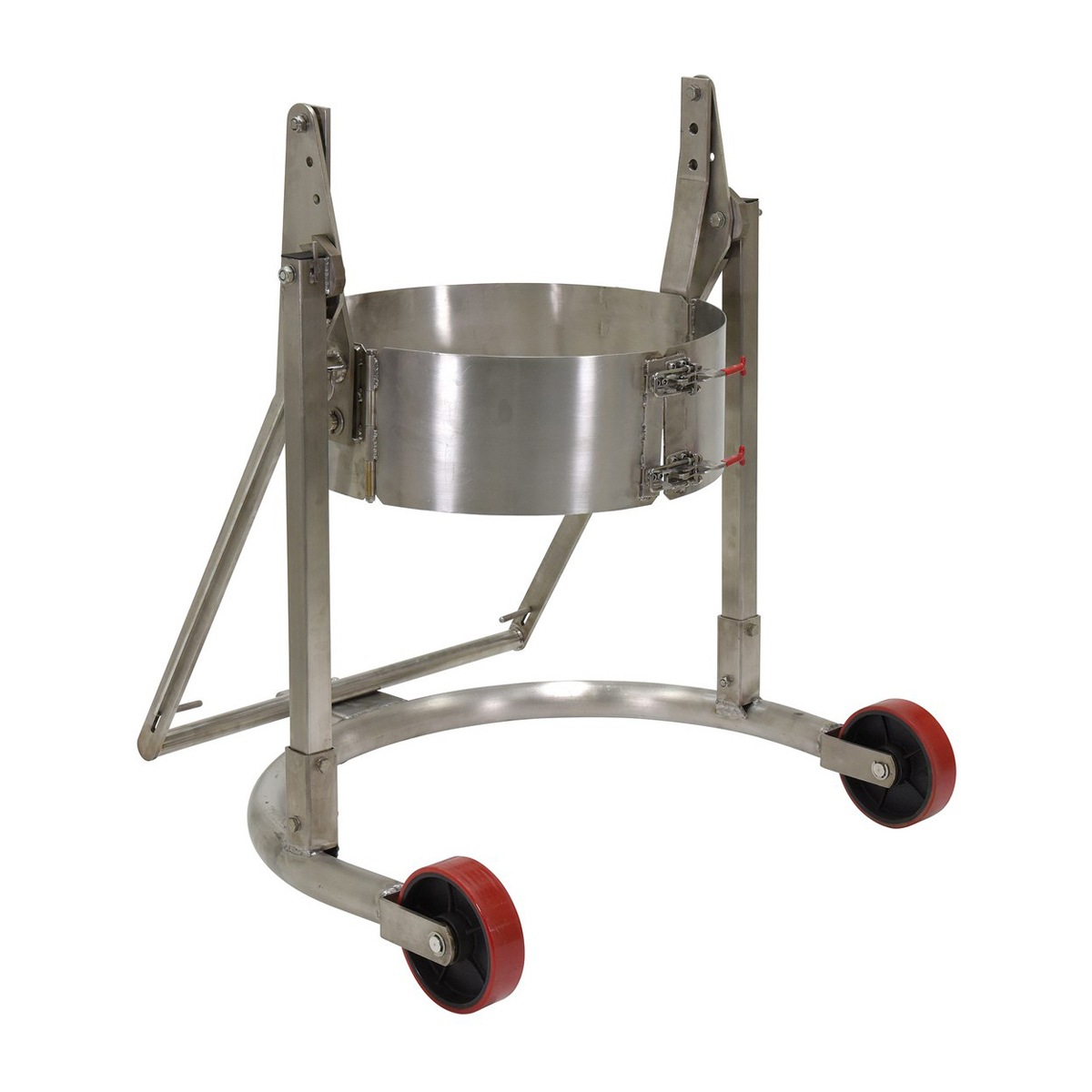 Stainless steel drum carrier/rotator is ideal for raising, transporting, rotating, tilting and draining 55 gallon steel drums. Sturdy handle provides leverage for heavy lifting and easily locks drum in position 5 to 11″ off floor. Dual fingertip operated locks secure the raised drum. 2 position lock, locking feature allows for locking in vertical position to avoid spilling and transporting or horizontal position for draining. Rolls on (2) 8″ front wheels and (1) 4″ rear steerable castor. 304 all stainless steel construction.
