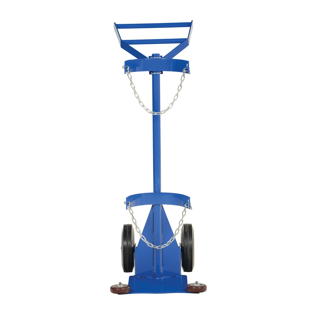 The Cylinder Dolly transports cylinders from workstation to workstation. This deluxe version feature roller guides attached to the nose plate. The hard rubber roller guides allow for easier entry onto the nose plate. Secure the cylinder with the included restraint chains. Tilt unit back and transport.