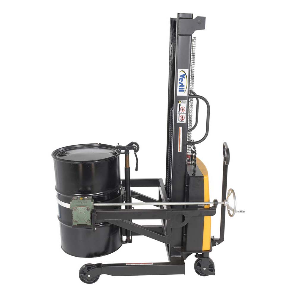 A Portable Drum Lifter/Rotator/Transporter has a DC battery powered lift operation and a manual hand crank gear mechanism rotation (on-board charger standard). For use with steel and fiber drums.