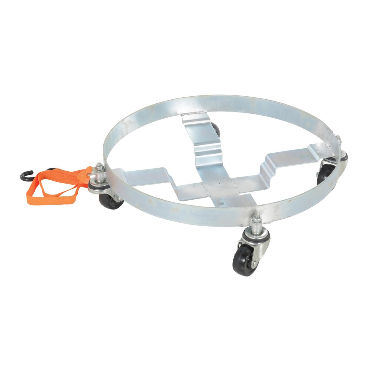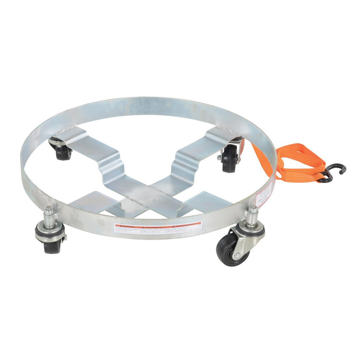 This Multi-Purpose Quad Drum Dolly has a high polished bright zinc finish for corrosion resistance. The dolly comes with a nylon pull strap that helps in transporting down aisles or over thresholds. Rubber-coated hook allows strap to hook on top of drum for storage.