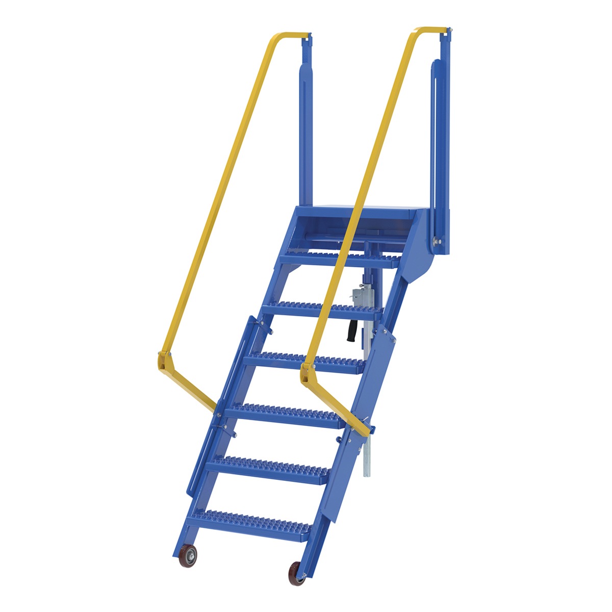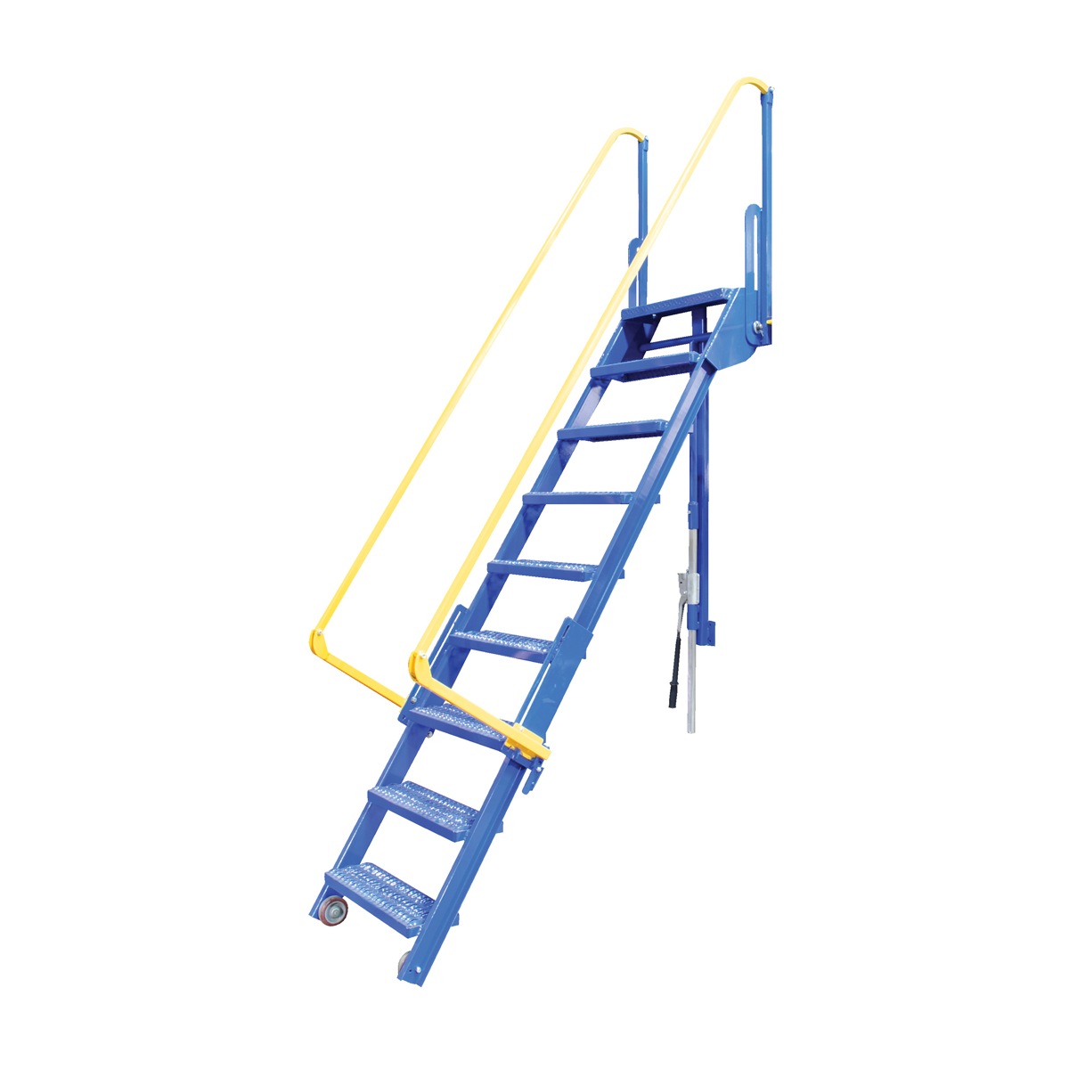 The Mezzanine Ladders are used for infrequent usage to access mezzanines. They are ratcheted into climbing angle and back into stored position. The wheels roll on the ground when ratcheted and the handrails mechanically rise into climb position when ladder locks into position. Quickly extend and retract the ladder. The mezzanine ladder allows for quick installation with mounting bracket provided for bolt-on installation or welded installation. Customer must provide their mezzanine height at time of purchase. Baked-in powder-coated toughness. Meets or exceeds all OSHA requirements. Ships knockdown, some assembly required.