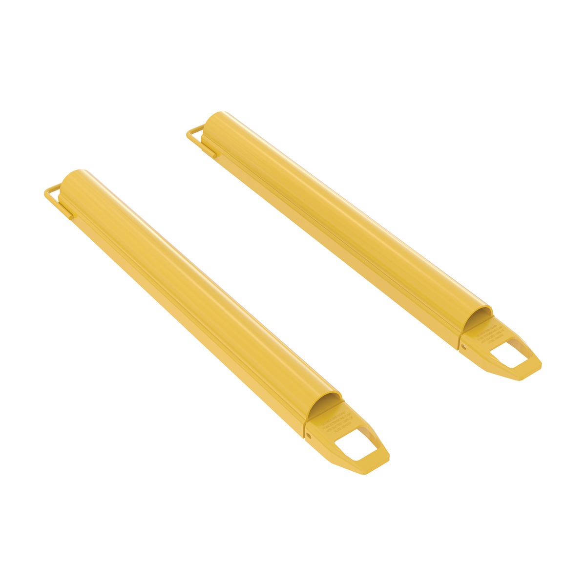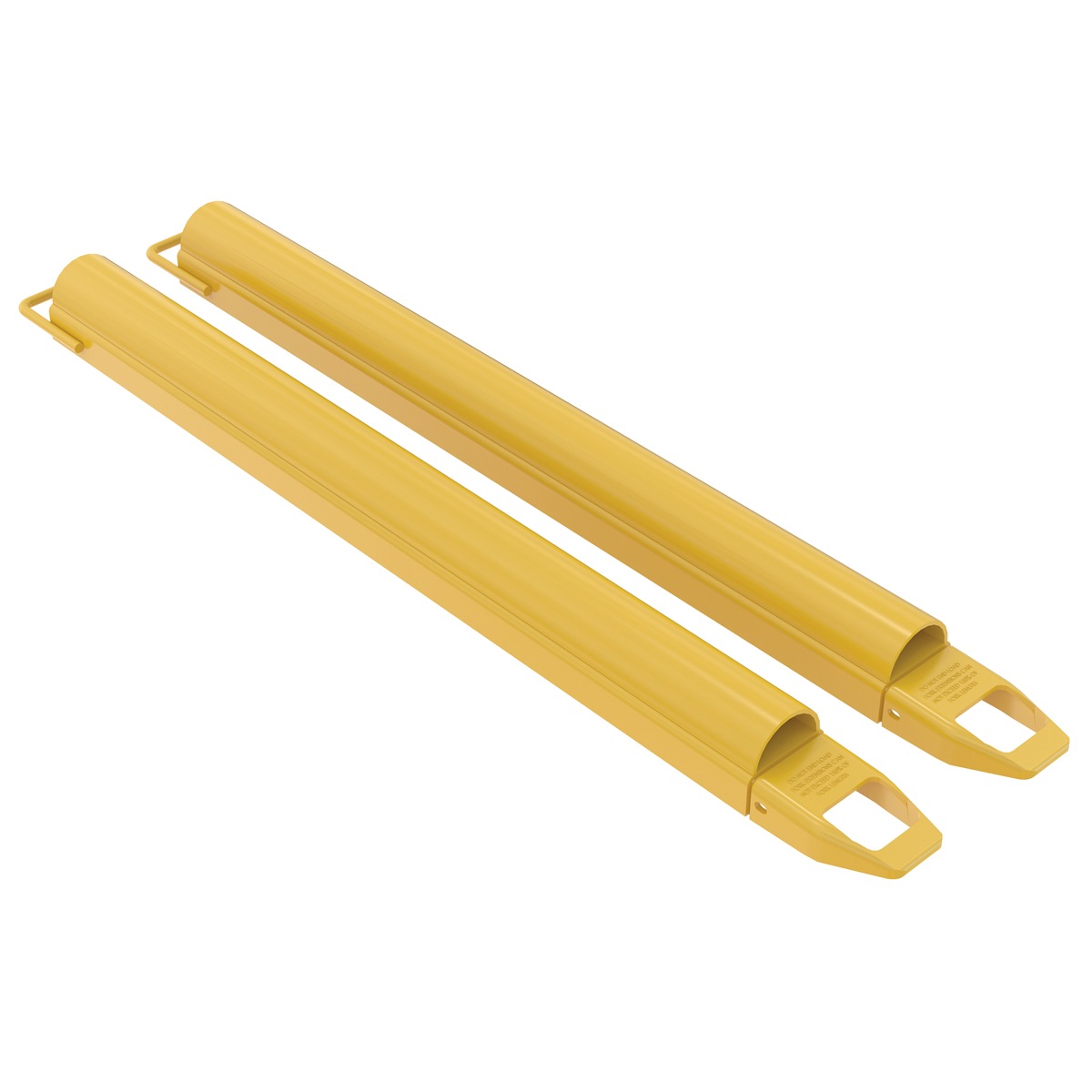 These Round Fork Extensions are ideal for moving around large rolls of material. Powder coat yellow fork. To install, insert loop at the tip of the fork and slide it up at a forty-five (45) degree angle. Then, lay it down over the fork. OSHA regulations require that extensions do not exceed the length of the fork by more than one-hundred and fifty (150) percent.