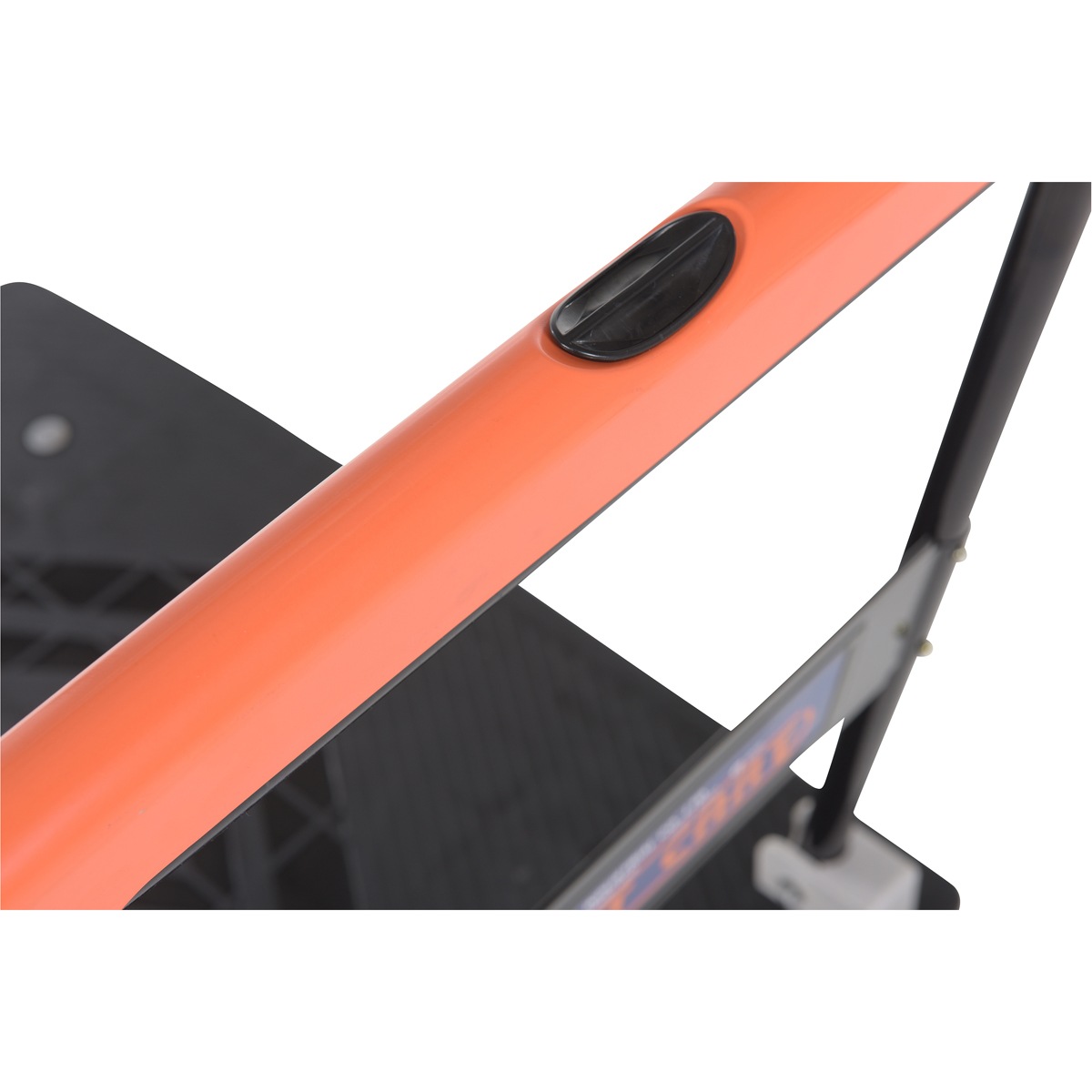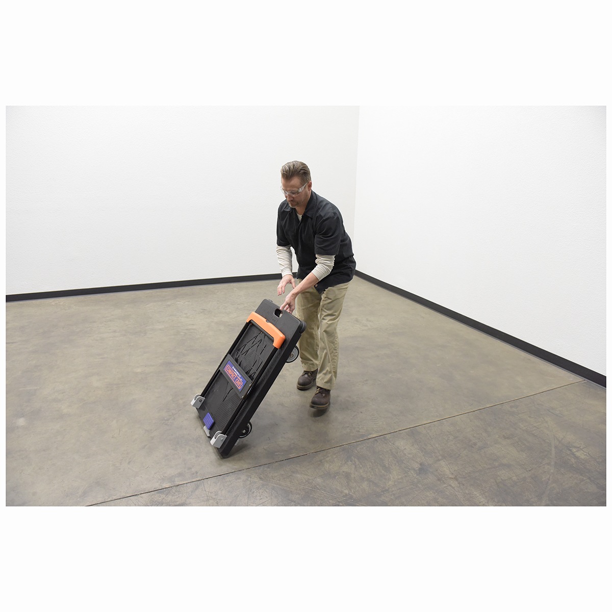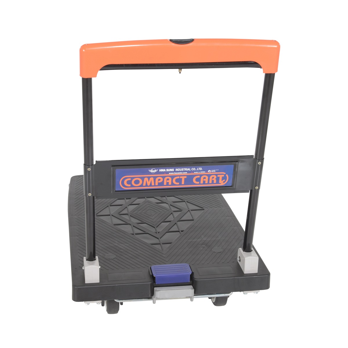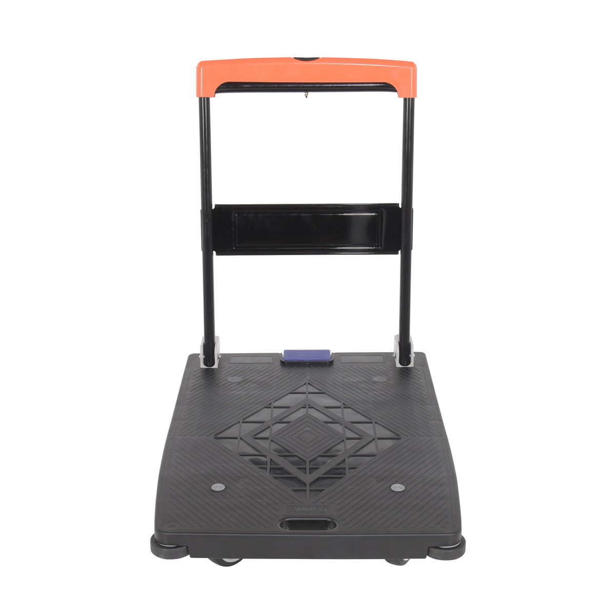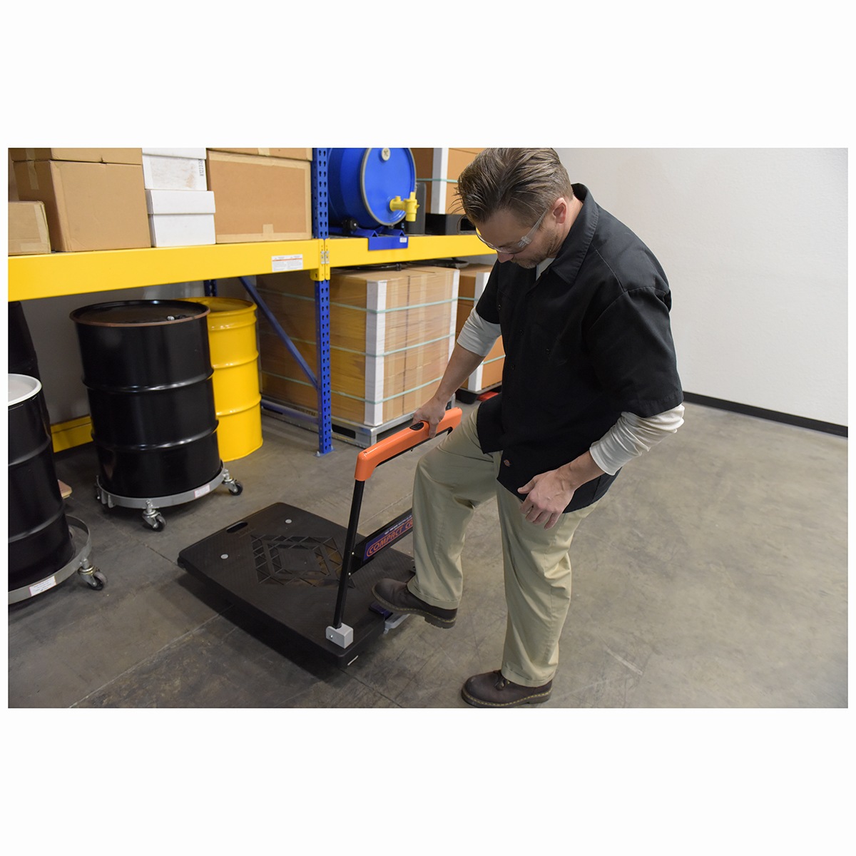 An auto brake platform truck is a new design to a reliable classic. ?With a large platform and a sleek design the unit allows for transference of items both large and small. A unique braking feature is what sets this unit apart from the field. The units brake is automatically engaged when not in use. When driving handle is pressed, the brake is disengaged. During this time, a tab located in the center of the handle can be turned to secure the brake in a disengaged position. This will allow the user to limit applied pressure throughout the entire transference. When pressure (or tab) is released, the brake is re-engaged. Handle can be folded by stepping on the built in foot control on the platform.