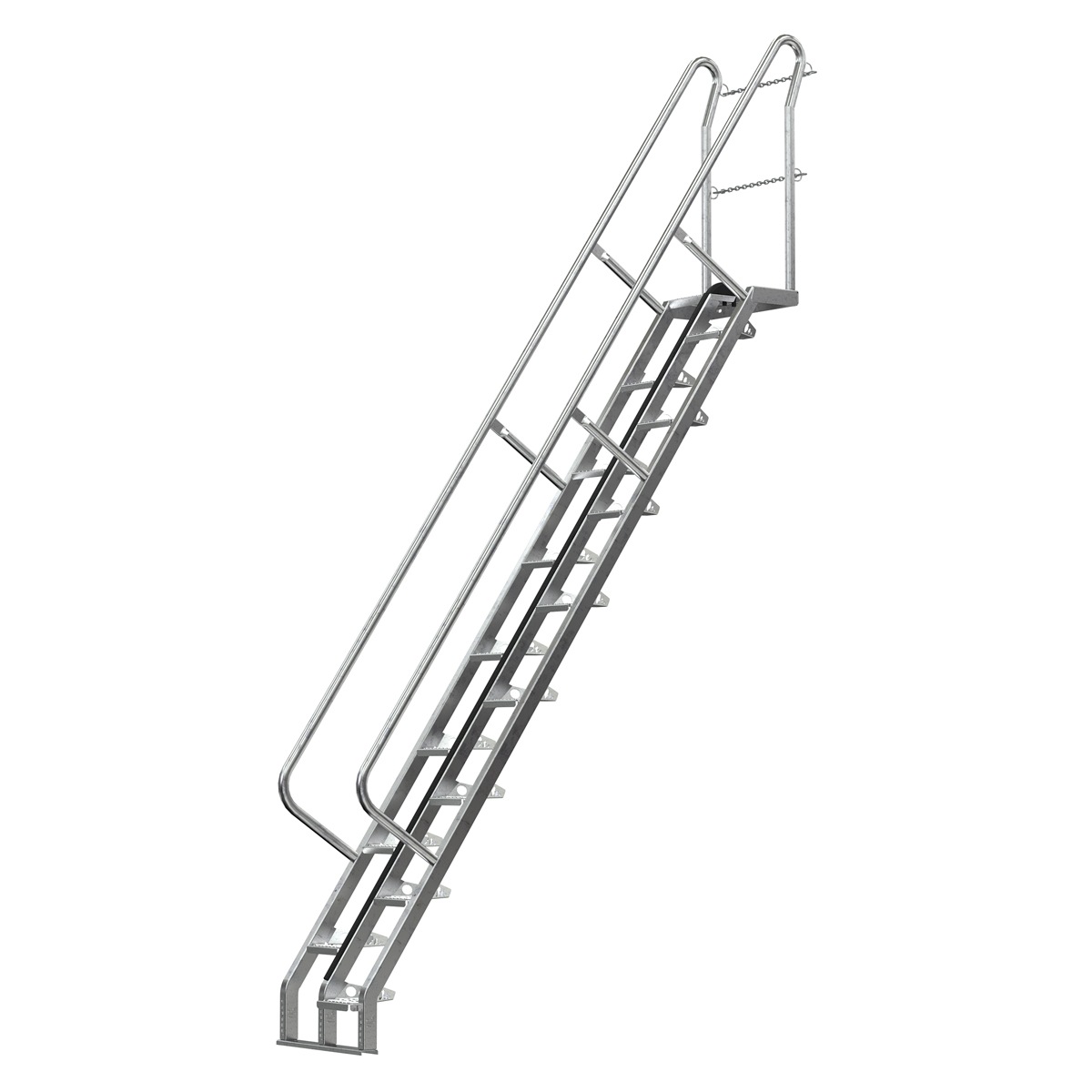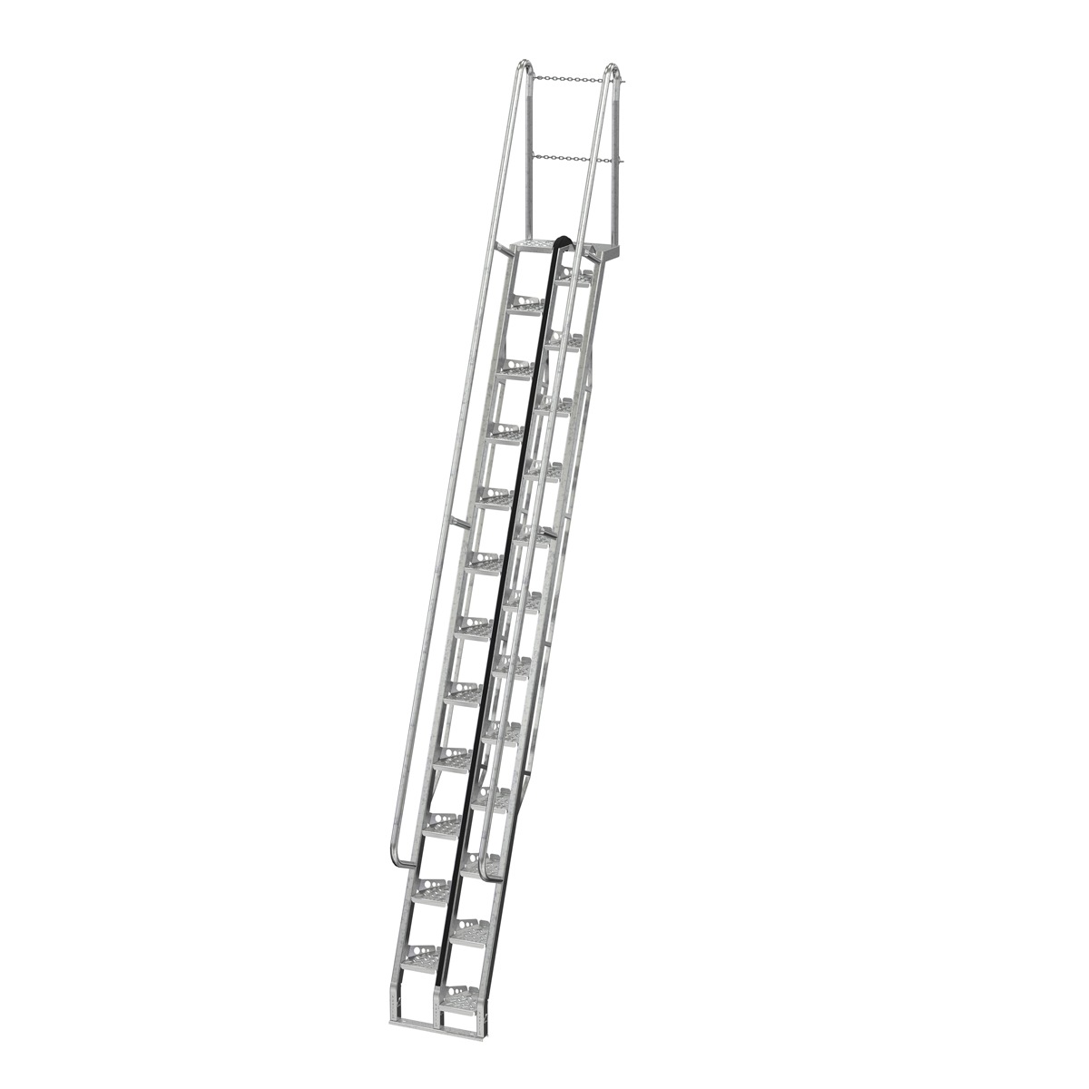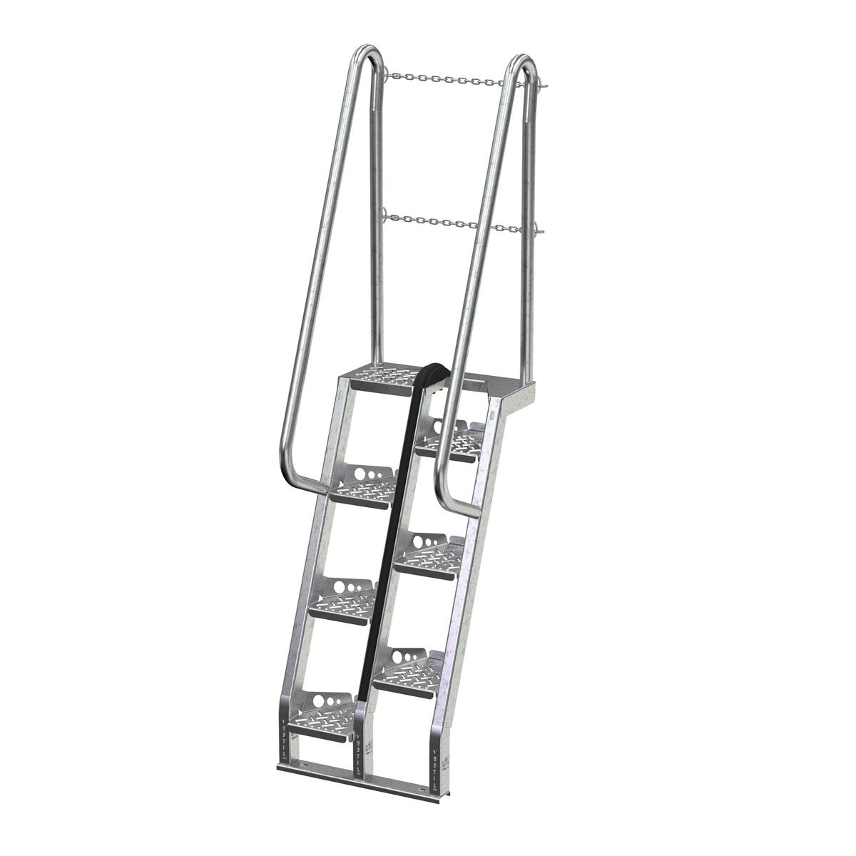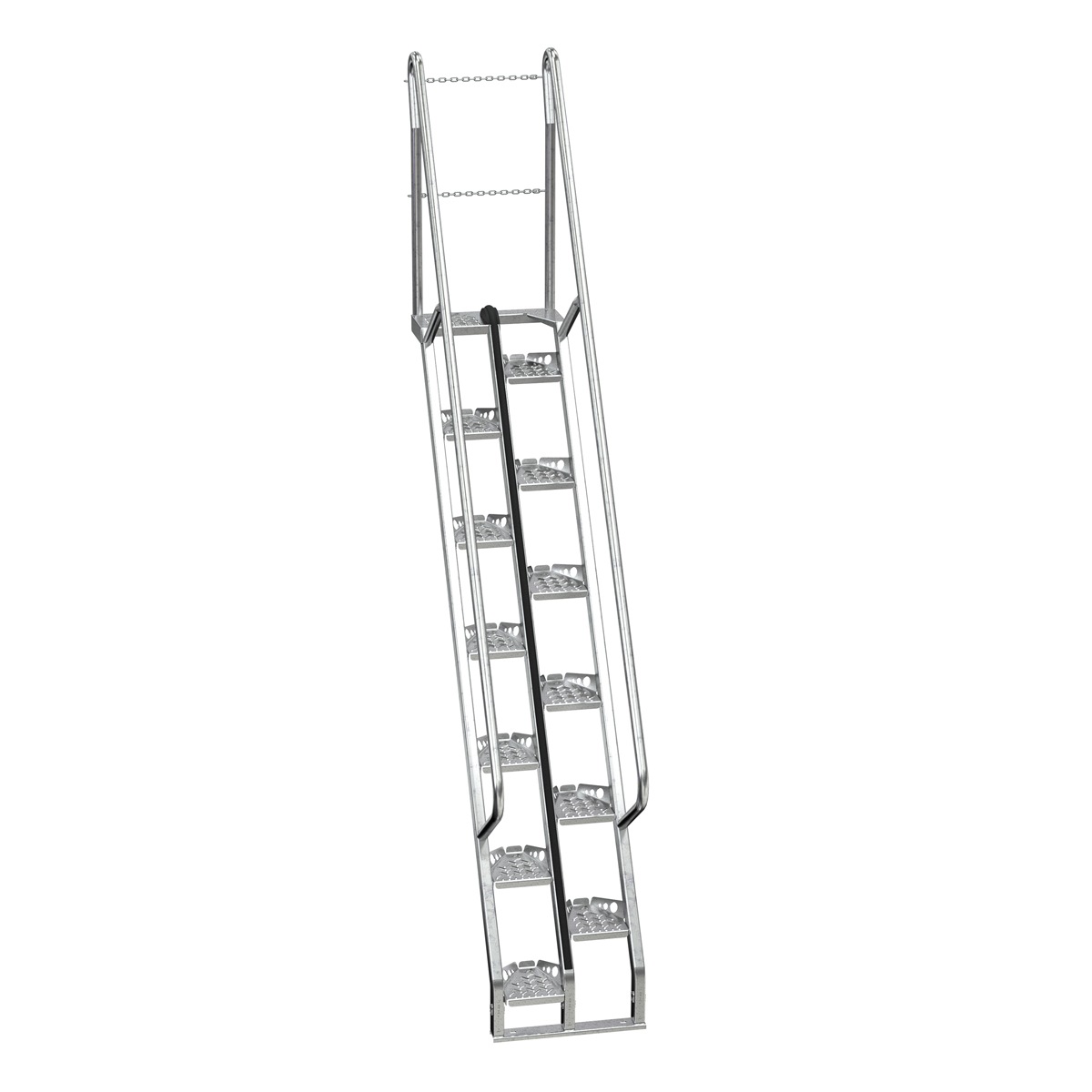 Alternating-Tread Stair design offers a shorter span than traditional steps. Features handrail on each side of unit, dual safety chain at the top of the stair and formed steel steps with raised surfaces for better traction. Welded steel construction with bolt-on handrails. Hot Dip Galvanized Finish