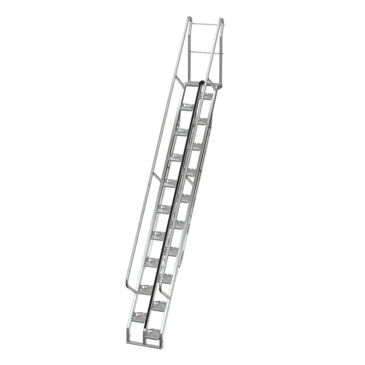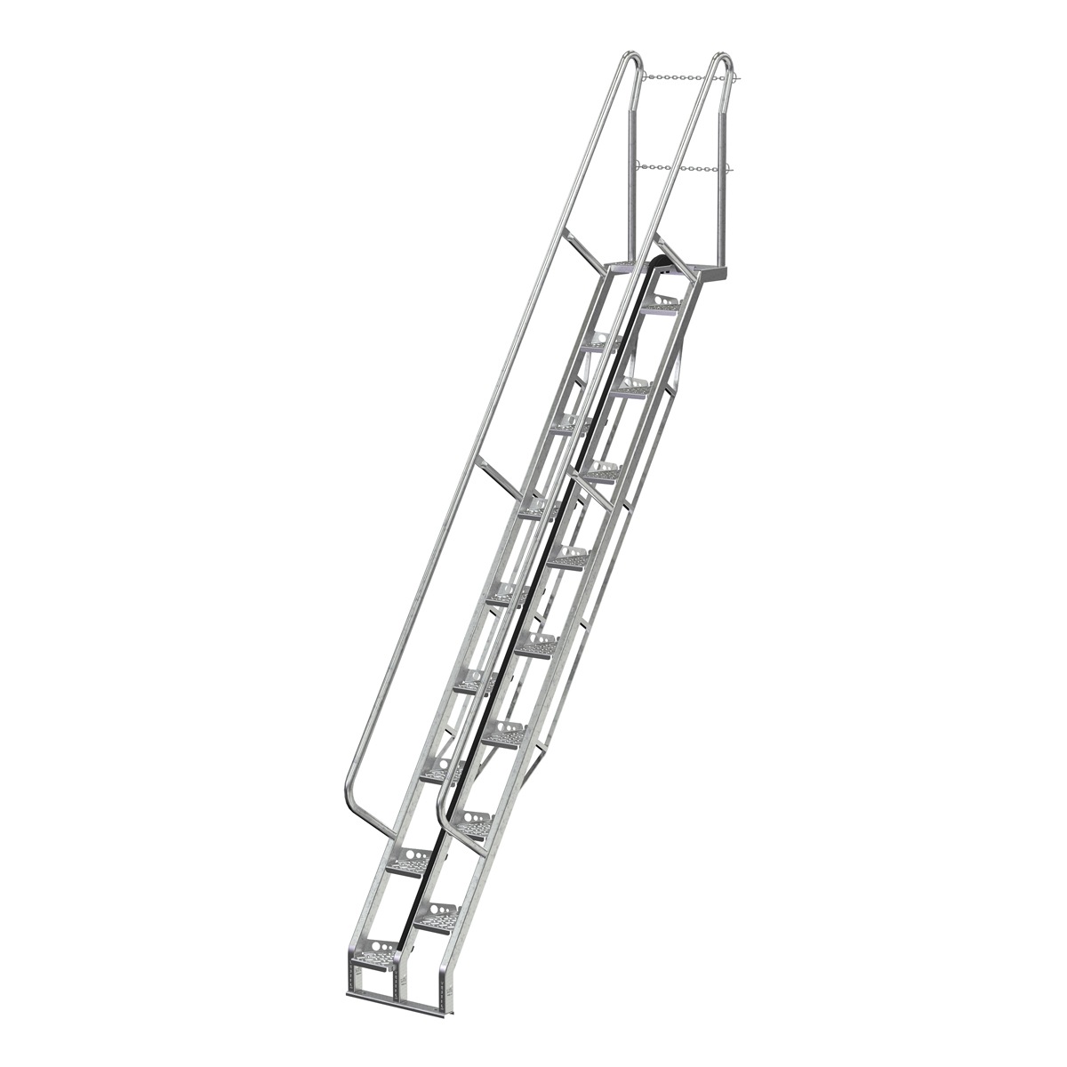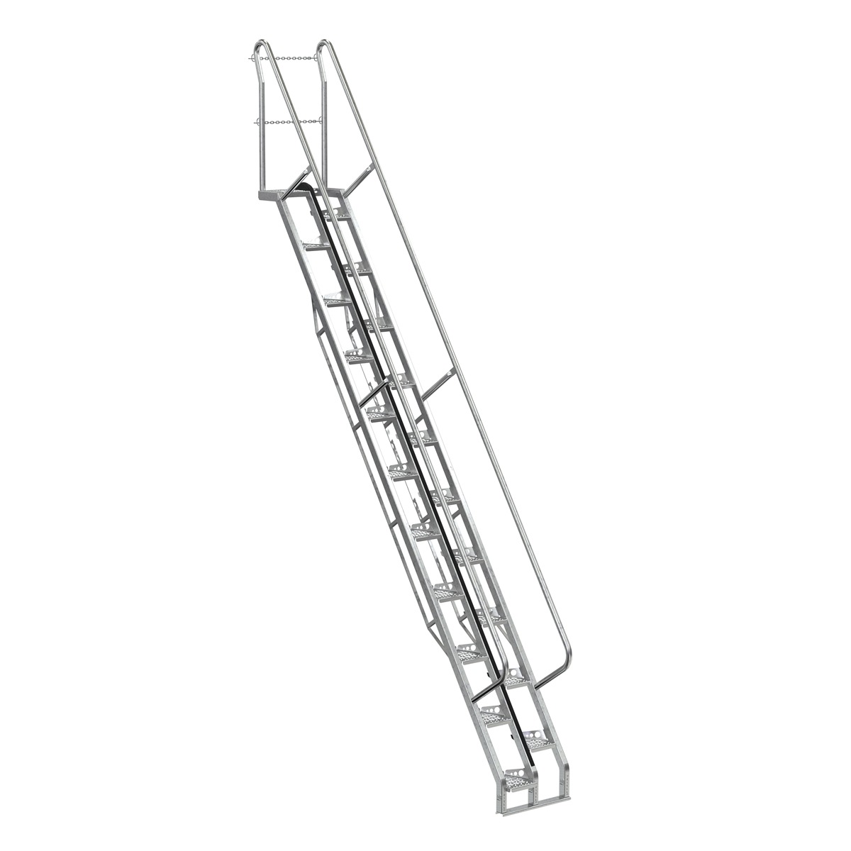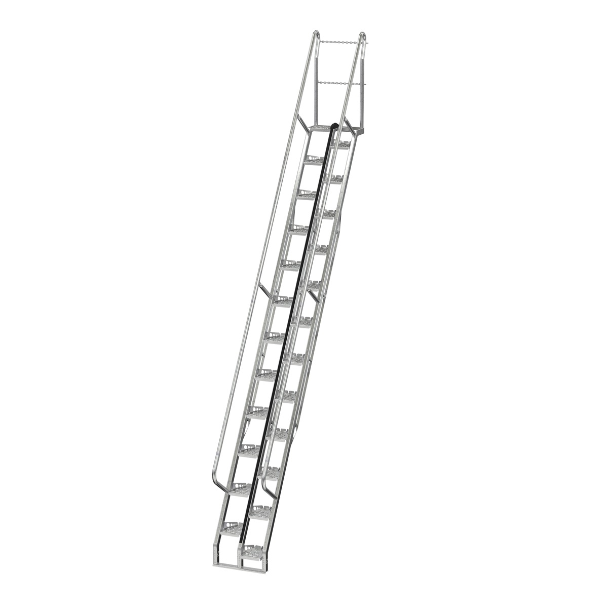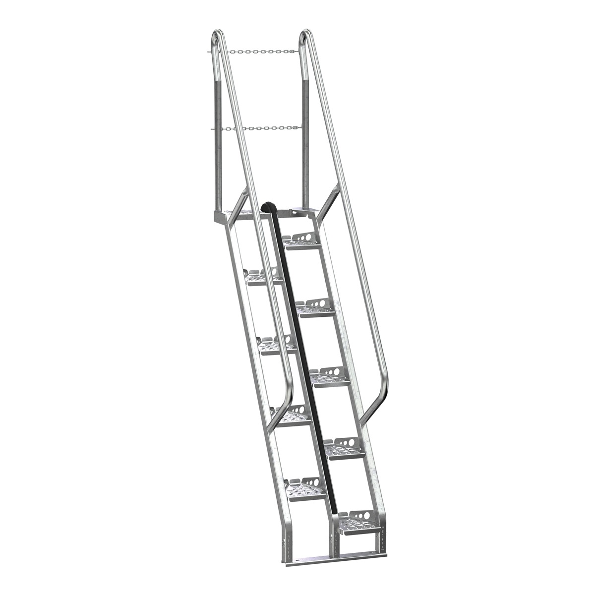 Alternating-Tread Stair design offers a shorter span than traditional steps. Features handrail on each side of unit, dual safety chain at the top of the stair and formed steel steps with raised surfaces for better traction. Welded steel construction with bolt-on handrails. Hot Dip Galvanized Finish