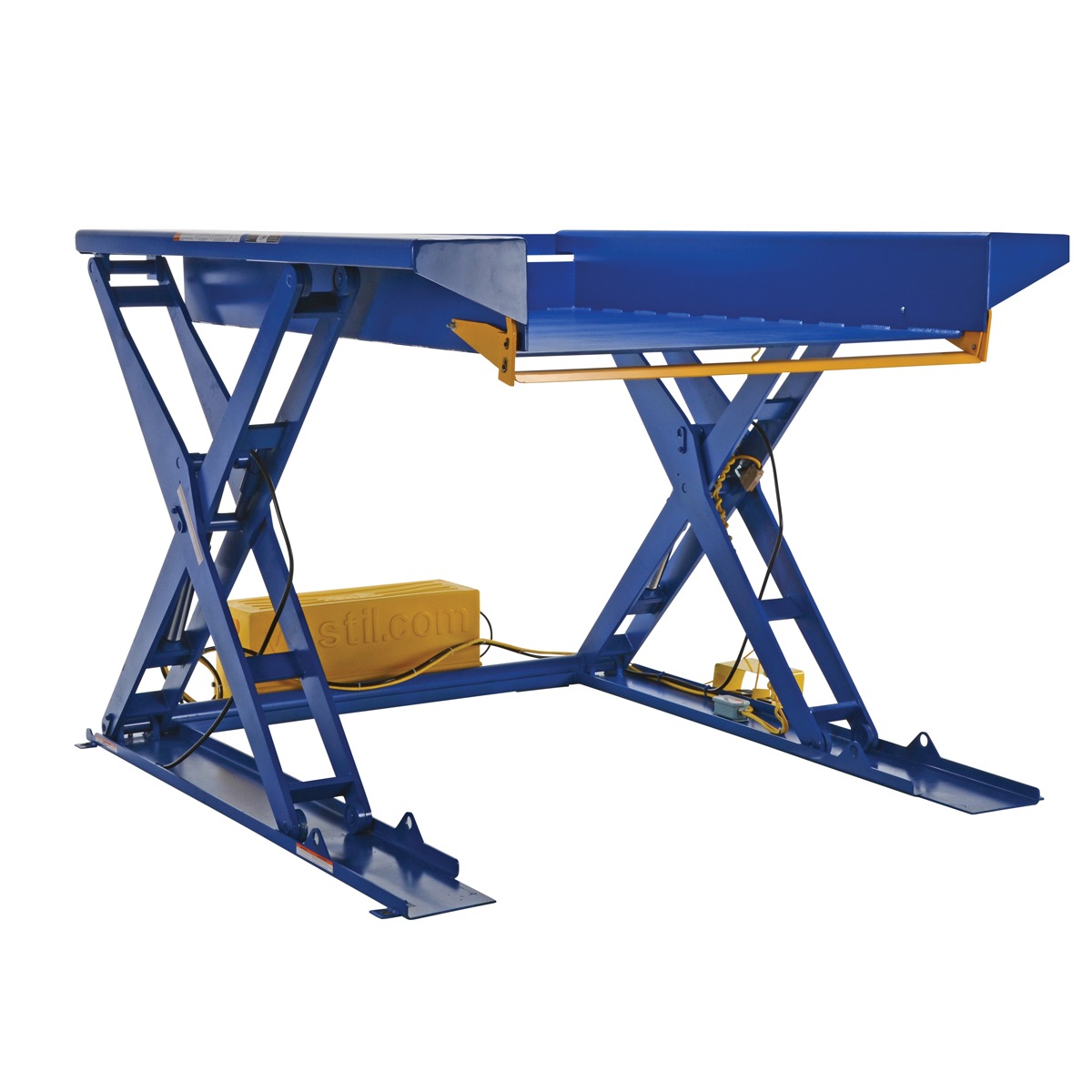 The Ground Lift Scissor Table is designed for use when fork trucks are not available. The pallets can be loaded onto the platform with pallet trucks and raised to an ergonomic working height. The safety features include: entry-side electric toe guard to protect pinch points during lowering of the table, velocity fuse to maintain platform height in the event of a hose or fitting failure, foot control, maintenance prop, and upper travel limit switch to stop table at maximum height reducing motor wear. The motor is totally enclosed standard with optional voltages available. The remote power unit can be located up to eight (8) feet away from the table. Optional accordion skirting is available.