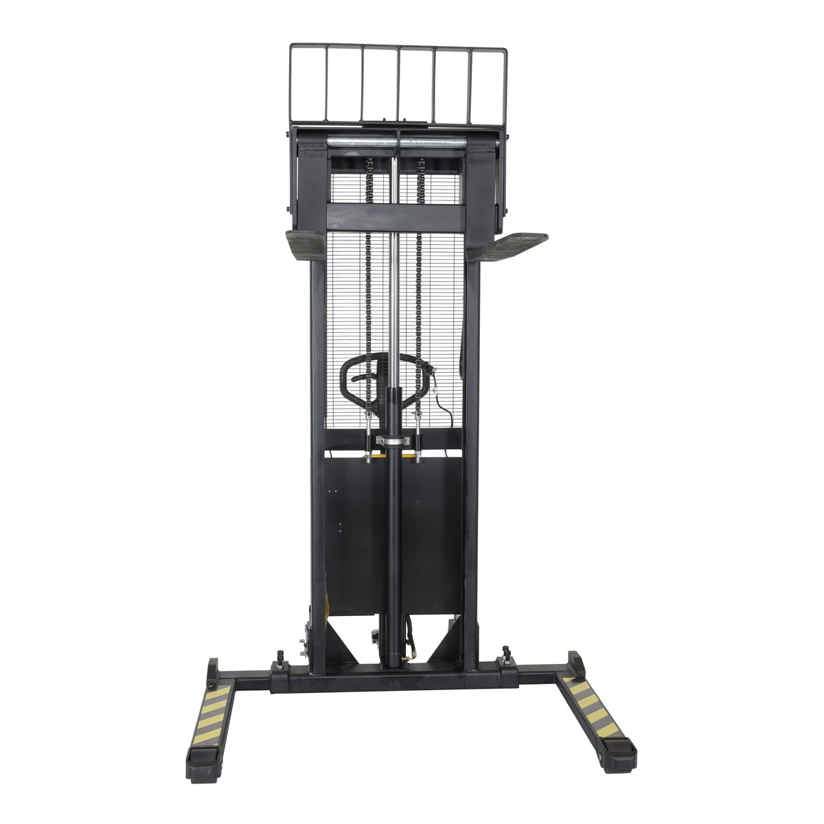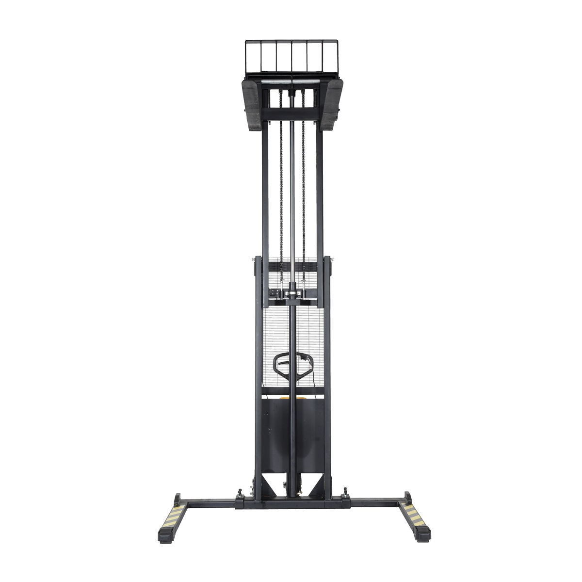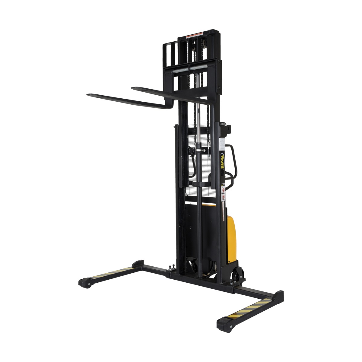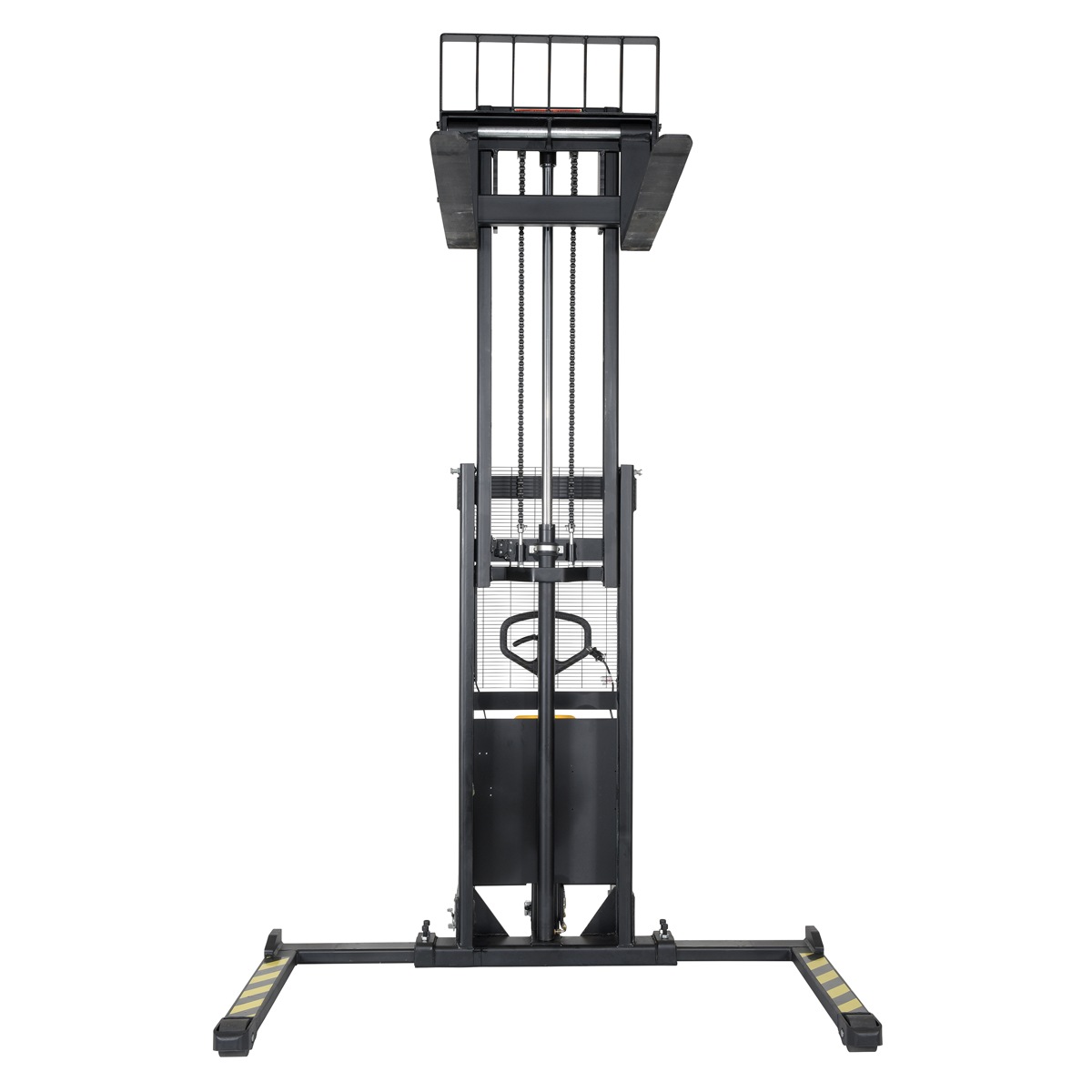 An economical alternative DC powered lift stacker. Ideal for maintenance and commercial applications. This unit can be used as manual hand pump lift or electric powered lift. Ideal when power is not available. High quality hydraulic pump and DC lift system. Compact design and strong steel construction. An economical lift to handle tasks such as transporting dies, molds, and skids. Powered with two (2) 12V AGM batteries. Integral battery charger, battery level gauge, and adjustable lowering speed. All models are easily maneuverable using the standard pull handle. Forks measures 26.” wide by 42″ long. Individual forks are 6″ wide.