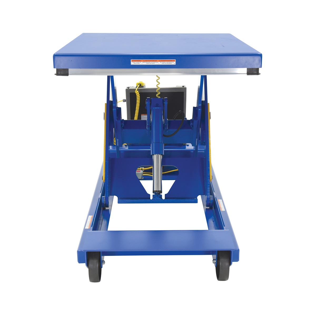 Heavy Duty Portable Lift Scissor Tables can easily transport and elevate heavy loads. Featuring glass nylon filled casters (2 swivel and 2 rigid), floor lock, patented electric pinch point guards, and magnetic hand controls. Key-operated ON/OFF control for better security is built into the power unit. Heavy duty 12V DC powered unit with deep cycle battery, an on-board battery charger and battery charge indicator gauge comes standard.