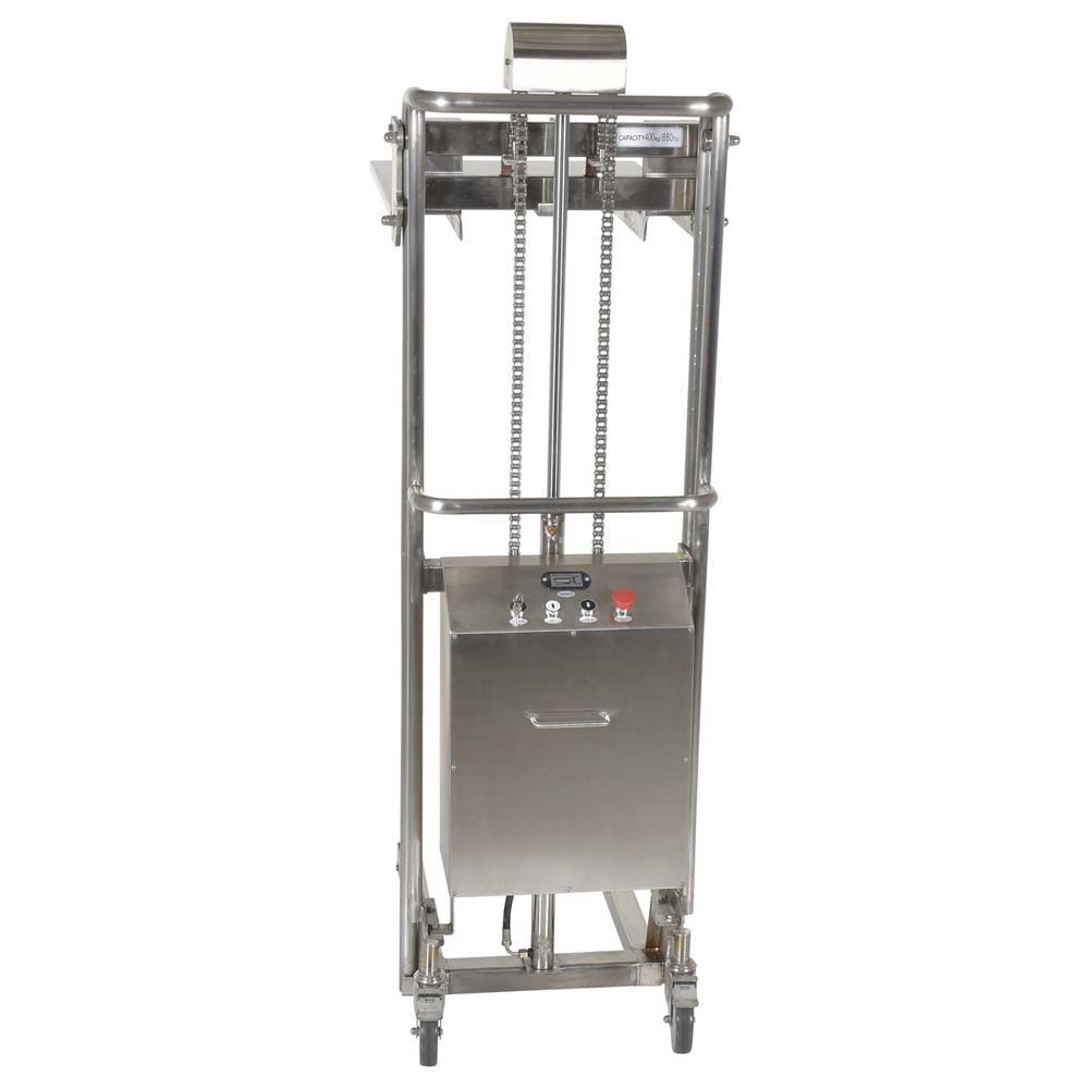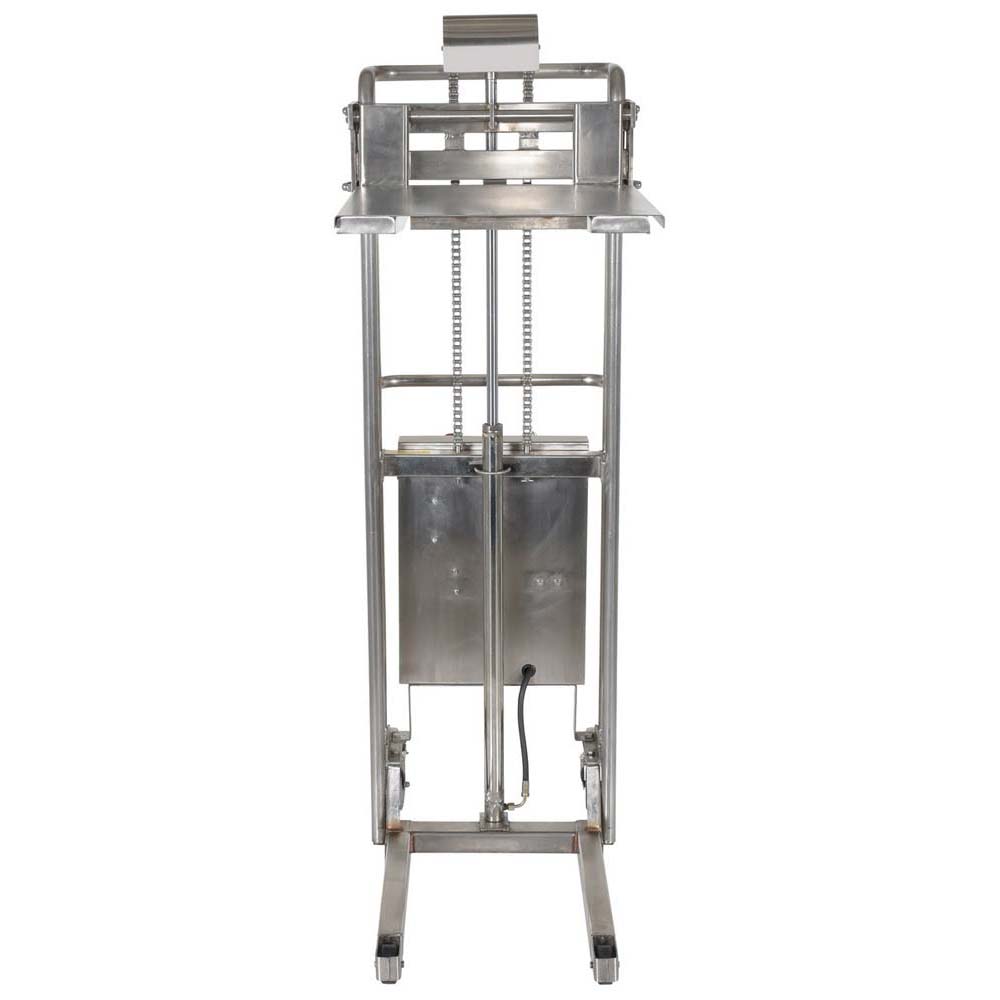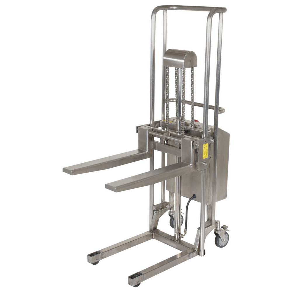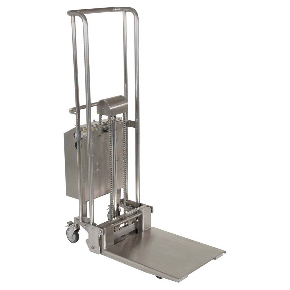 The Hefti-Lift is a user friendly, portable hydraulic lift. The lift provides reliable, power lifting when moving and positioning loads. It includes a removable platform for operation requiring forks. The non-slip chain is used for accurate positioning while the Lift rolls easily on two rigid and two swivel poly-on-steel casters that includes a foot operated brake. The unit has an all welded construction with a chrome platform and uprights. Not for use with pallets.