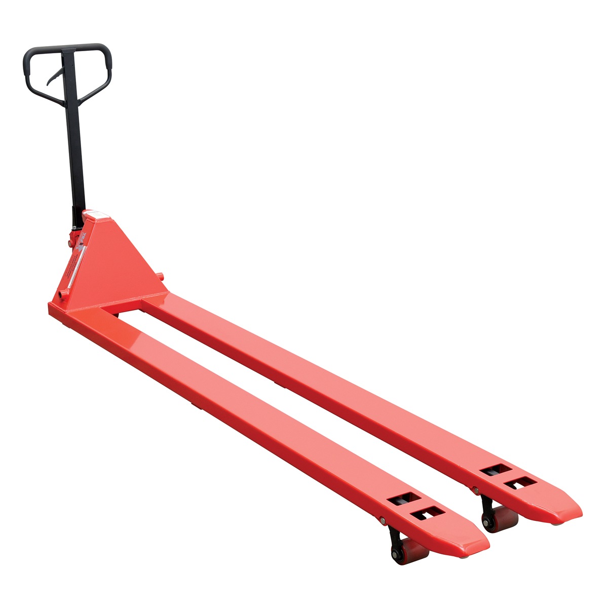 The Low Profile Pallet Truck can enter a pallet from all four sides. The all steel frame is reinforced to handle heavy loads. Wide loop handle control with lift, neutral, and lower functions provides fingertip control. The unit has lifetime lubricated bearings and a hydraulic system that has a hard chrome plated pump piston with polyurethane seals. The suspension system has heavy-duty thrust bearing. This Pallet Truck comes complete with adjustable push rods, polyurethane wheels, steel load rollers, and a red powder coat finish.