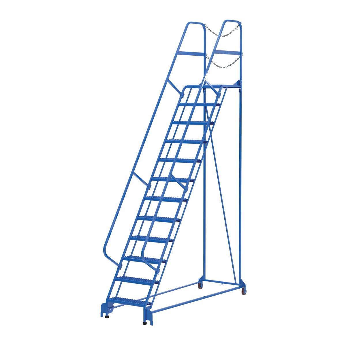 Portable Maintenance Ladder for use around warehouses, hardware stores or inventory rooms. Tilt the unit to allow for portability. Constructed of square tubing framework. Features removable hand railing, access chain, grip strut steps and an industrial blue powder coat finish.