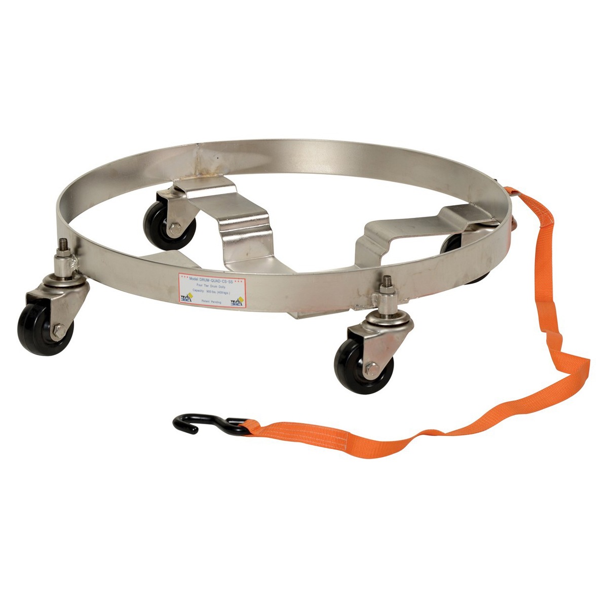 This Multi-Purpose Quad Drum Dolly has a high polished bright zinc finish for corrosion resistance. The dolly comes with a nylon pull strap that helps in transporting down aisles or over thresholds. Rubber-coated hook allows strap to hook on top of drum for storage.