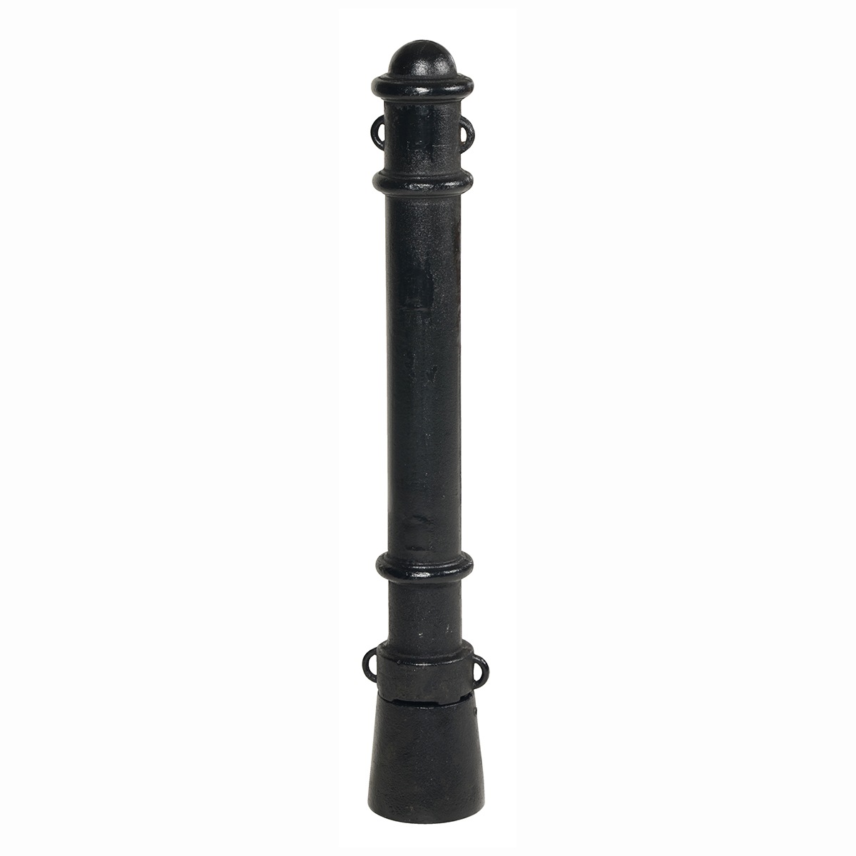 Provide an attractive yet functional barrier to vehicle access and parking with this Removable Ornamental Steel Bollard. Padlock not included. Powder coat black finish. Includes eyes for attaching chain or rope. Locks into galvanized steel socket that is cemented into the ground. When the bollard is removed, a cover plate protects the hole leaving no protrusion above the surface. Galvanized base is included with bollard.