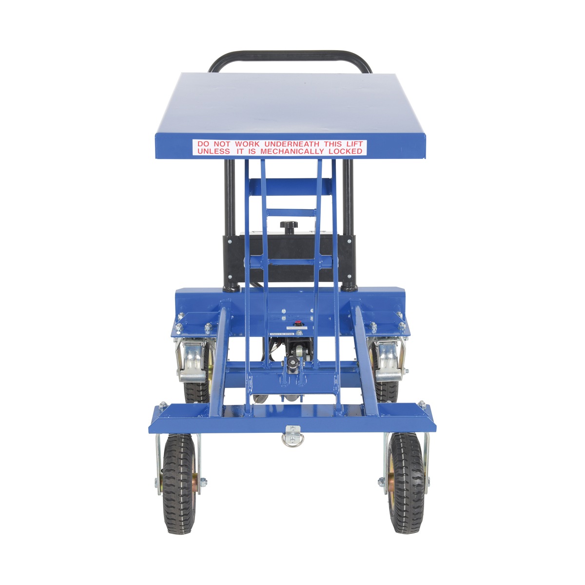 The Pneumatic Tire Hydraulic Elevating Carts are designed to be ergonomically friendly for use in landscaping and construction sites. The unit is constructed of powder coated welded steel for long lasting durability, while moving smoothly on pneumatic tires over the roughest of conditions. The cart can be elevated or lowered with the foot actuated pump and can be held in place while in use with the additional safety stops.