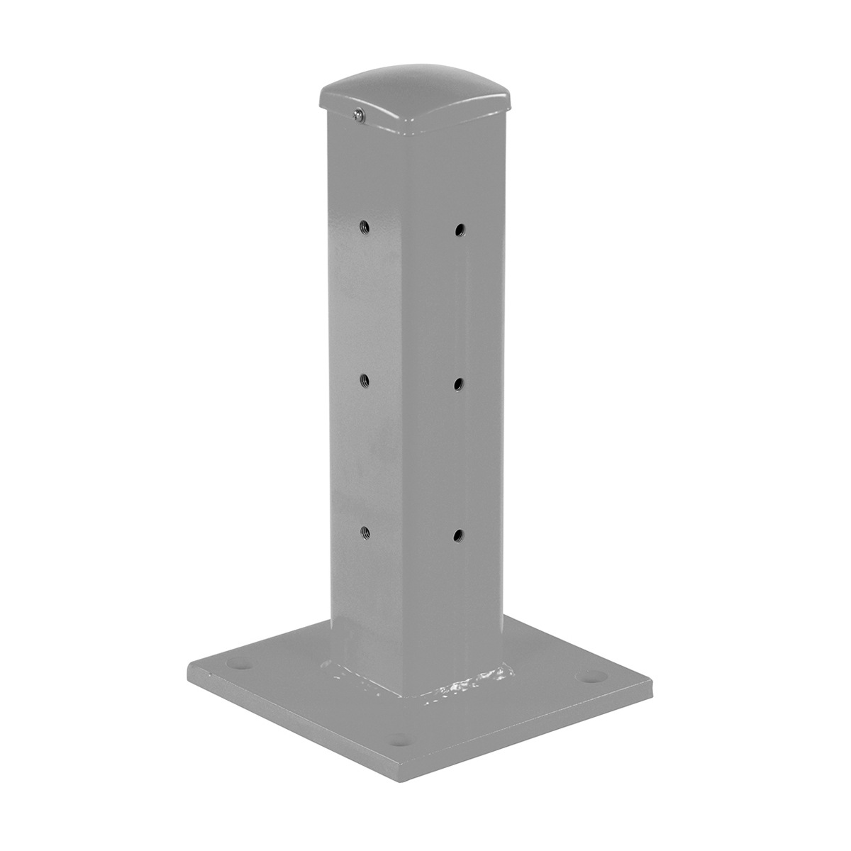 Create a modular system to protect equipment, inventory, and individuals from damage or injury with this highly visible powder coat yellow Structural Guard Rail. Triple ridge corrugated rails are constructed from 1/8″ thick material, made for high impact resistance indoors or out. Posts are constructed of round corner 1/4″ thick material. The steel base plate measures 10″ square and is 5/8″ thick. Bolts and washers are provided with individual rail sections. Concrete mounting kit is available separately. Provide a strong barrier with easy accessibility with our Drop-In Style rails. Slide rail sections into post saddles for simple assembly. Each Drop-In Style rail section includes two brackets. Bolt-On Style rails are designed for permanent installation. Models GR-TP-YL and GR-TP-GAL posts include mounting holes on all four sides for use in corners or center posts.