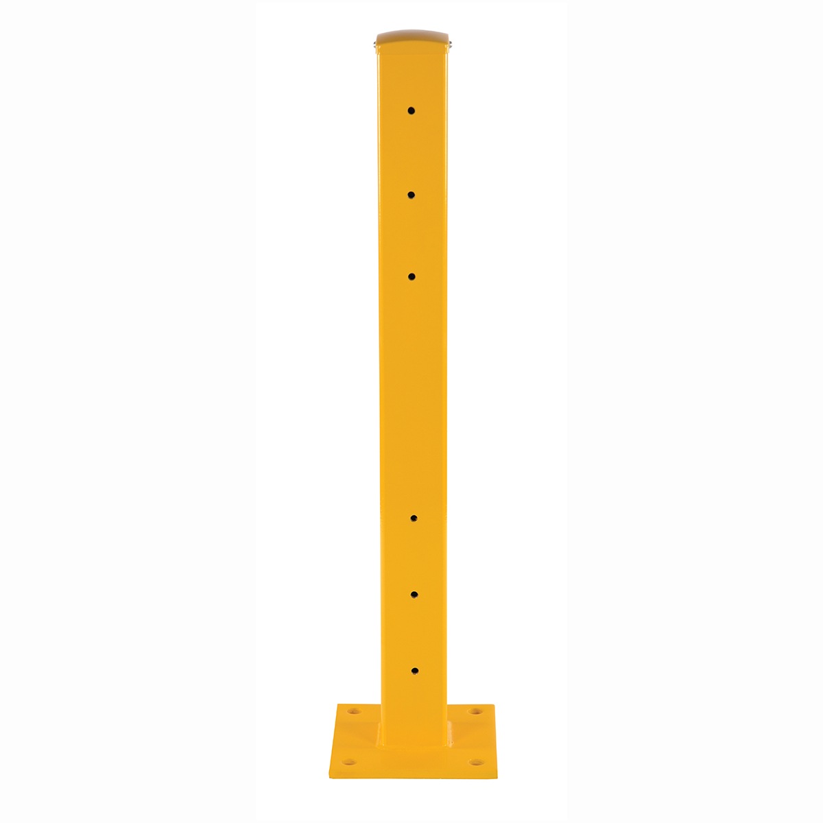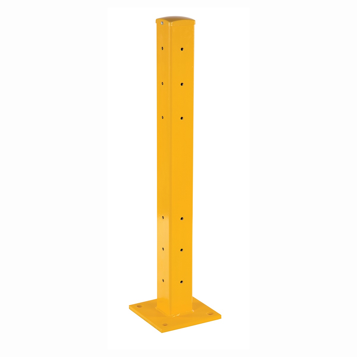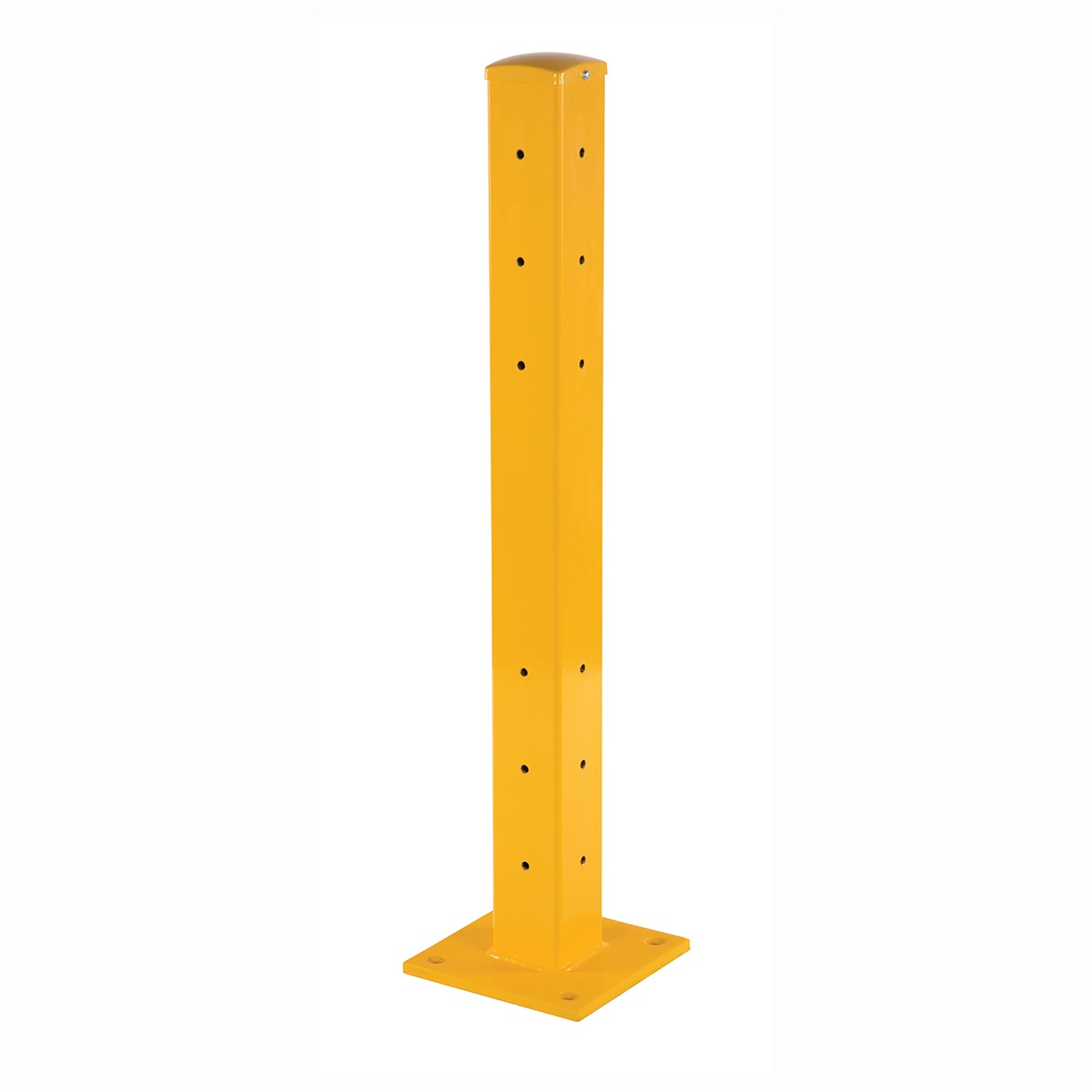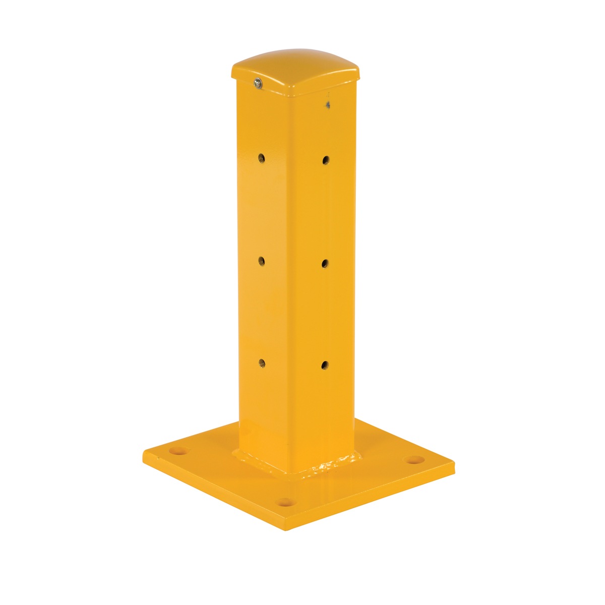 Create a modular system to protect equipment, inventory, and individuals from damage or injury with this highly visible powder coat yellow Structural Guard Rail. Triple ridge corrugated rails are constructed from 1/8″ thick material, made for high impact resistance indoors or out. Posts are constructed of round corner 1/4″ thick material. The steel base plate measures 10″ square and is 5/8″ thick. Bolts and washers are provided with individual rail sections. Concrete mounting kit is available separately. Provide a strong barrier with easy accessibility with our Drop-In Style rails. Slide rail sections into post saddles for simple assembly. Each Drop-In Style rail section includes two brackets. Bolt-On Style rails are designed for permanent installation. Models GR-TP-YL and GR-TP-GAL posts include mounting holes on all four sides for use in corners or center posts.