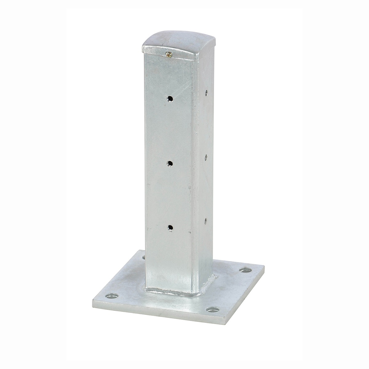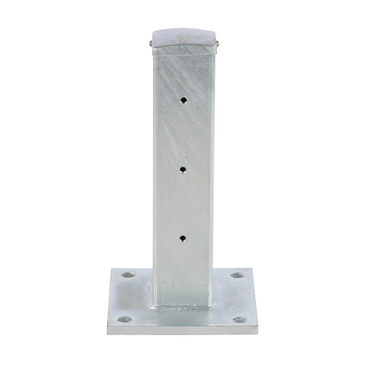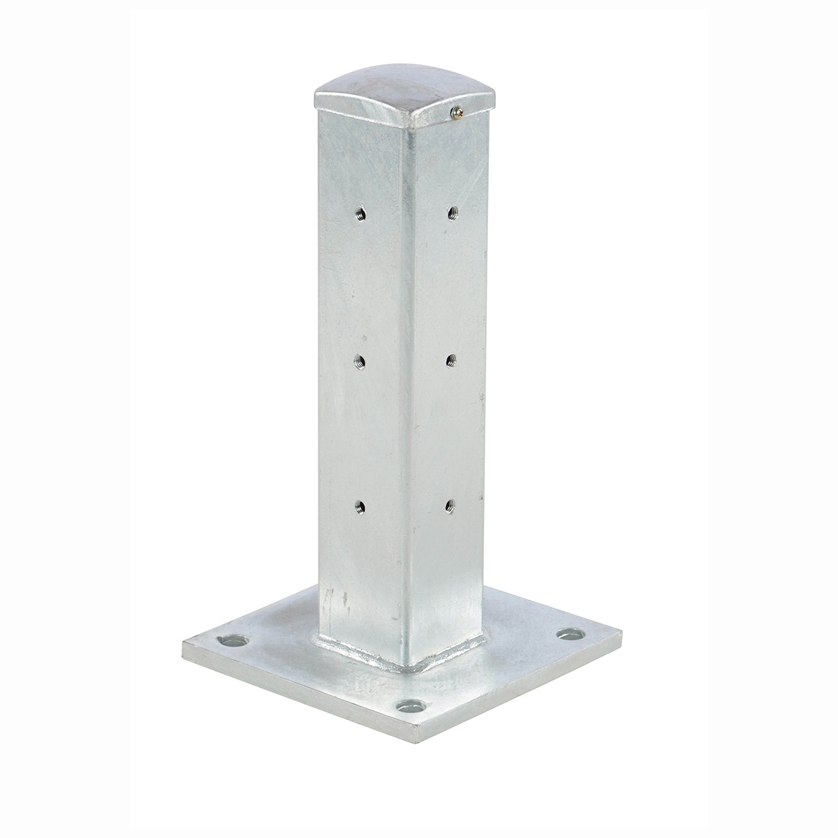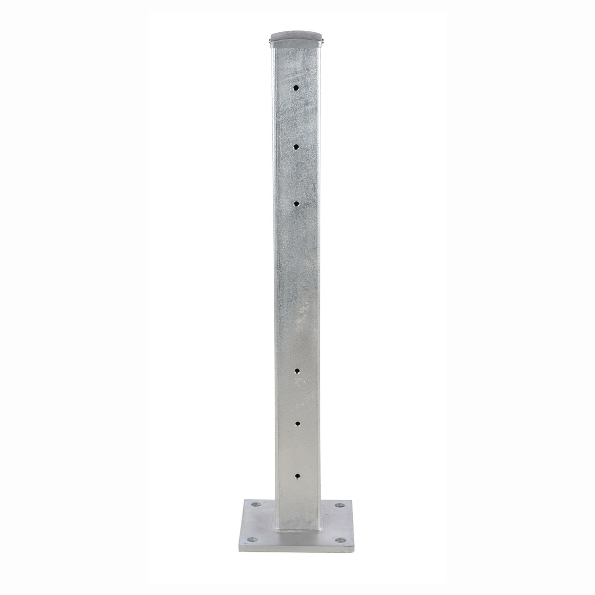 Create a modular system to protect equipment, inventory, and individuals from damage or injury with this highly visible powder coat yellow Structural Guard Rail. Triple ridge corrugated rails are constructed from 1/8″ thick material, made for high impact resistance indoors or out. Posts are constructed of round corner 1/4″ thick material. The steel base plate measures 10″ square and is 5/8″ thick. Bolts and washers are provided with individual rail sections. Concrete mounting kit is available separately. Provide a strong barrier with easy accessibility with our Drop-In Style rails. Slide rail sections into post saddles for simple assembly. Each Drop-In Style rail section includes two brackets. Bolt-On Style rails are designed for permanent installation. Models GR-TP-YL and GR-TP-GAL posts include mounting holes on all four sides for use in corners or center posts.