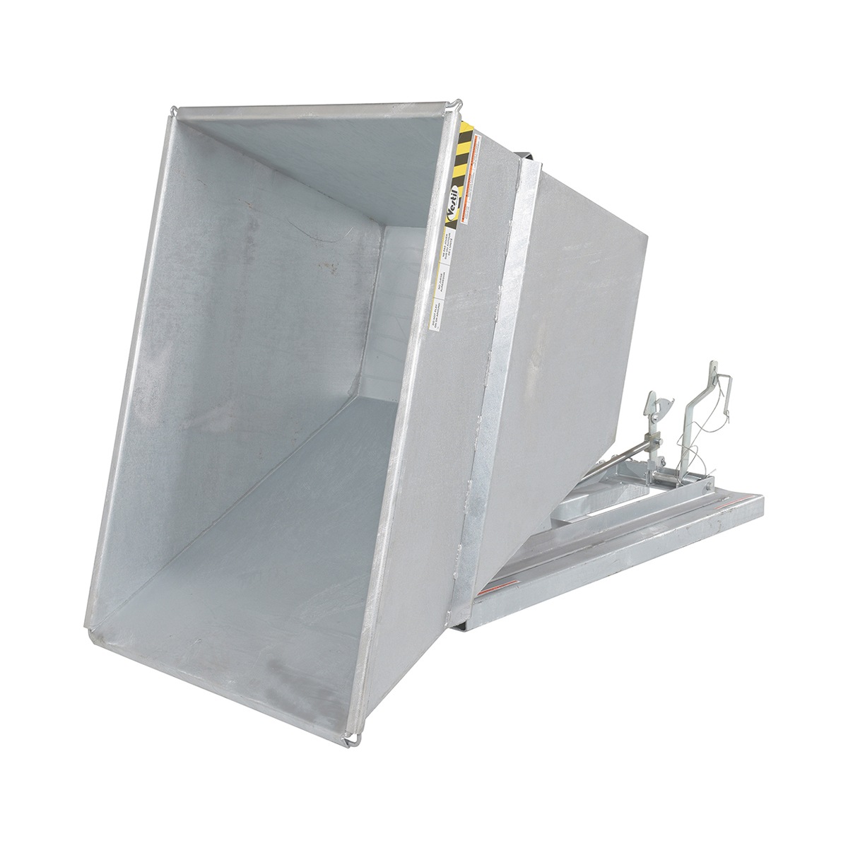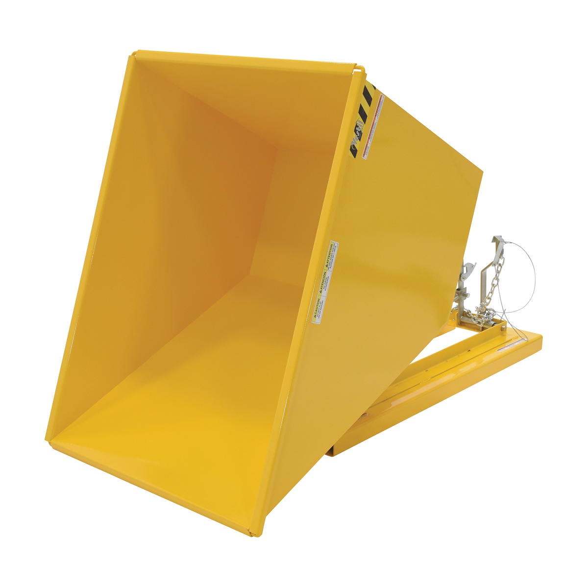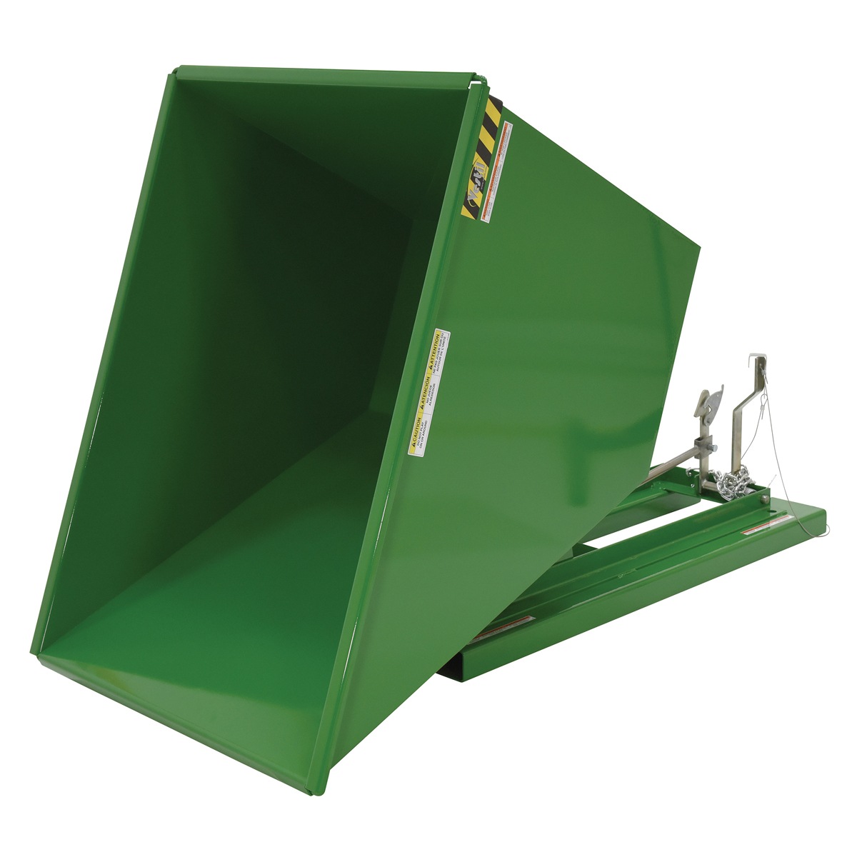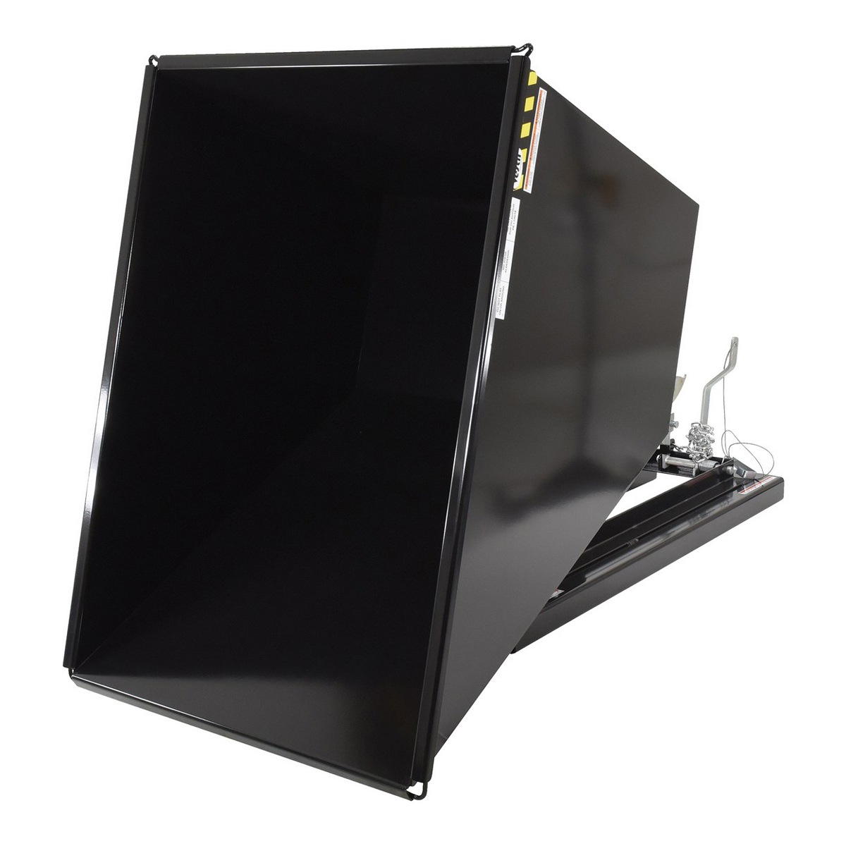 This Heavy Duty Self-Dumping Steel Hopper with Bumper Release automatically dumps when bumper release contacts the front of the dumpster. Hopper returns to an upright and locked position automatically after it dumps. Also includes a cable that may be operated from the seat of the fork truck to manually dump the hopper. The included safety restraint should be properly secured to a fork truck before dumping. (Length Dimension is measured at top of chute.) Hopper is stackable if you stack the top hopper turned ninety (90) degrees from the bottom. Self-dumping hoppers facilitate compliance with OSHA General Industry rule 29 CFR 1910.178(m)(5)(iii) by allowing lift truck operators to remain at the controls of their truck throughout the dumping process.