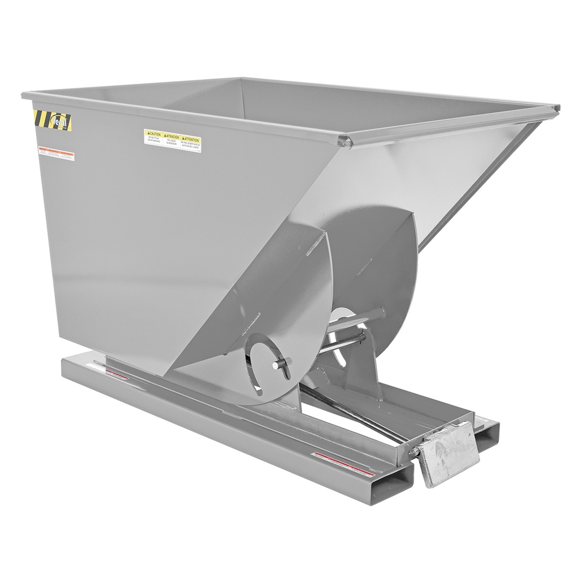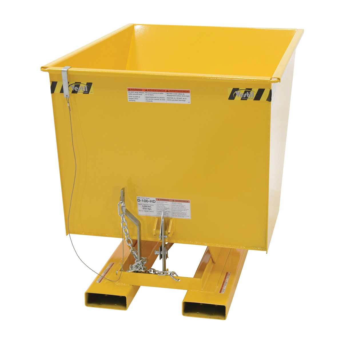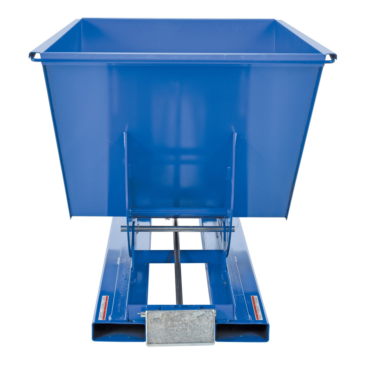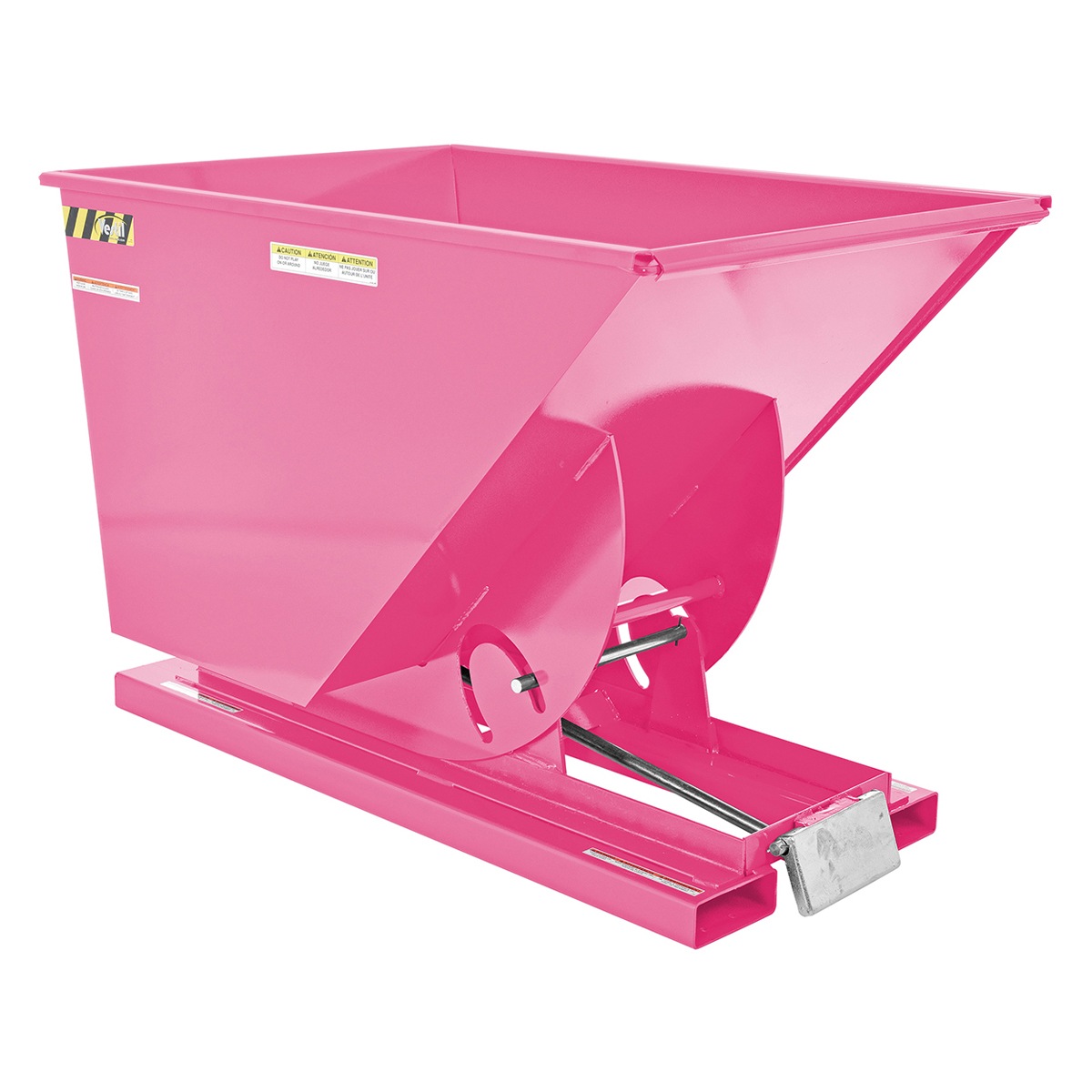 This Heavy Duty Self-Dumping Steel Hopper with Bumper Release automatically dumps when bumper release contacts the front of the dumpster. Hopper returns to an upright and locked position automatically after it dumps. Also includes a cable that may be operated from the seat of the fork truck to manually dump the hopper. The included safety restraint should be properly secured to a fork truck before dumping. (Length Dimension is measured at top of chute.) Hopper is stackable if you stack the top hopper turned ninety (90) degrees from the bottom. Self-dumping hoppers facilitate compliance with OSHA General Industry rule 29 CFR 1910.178(m)(5)(iii) by allowing lift truck operators to remain at the controls of their truck throughout the dumping process.