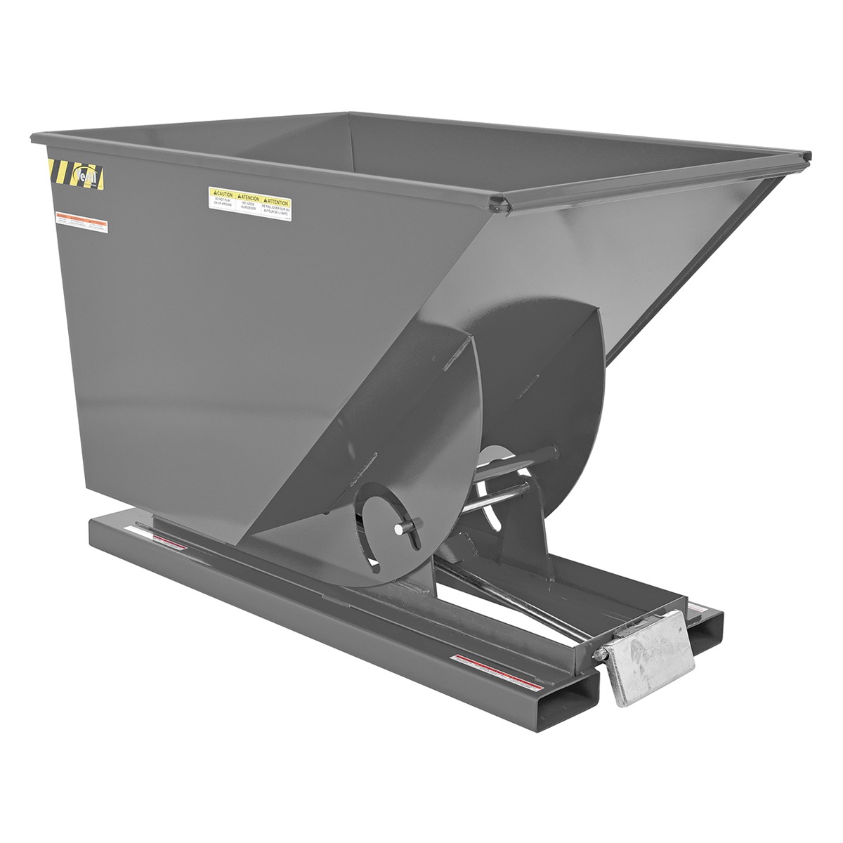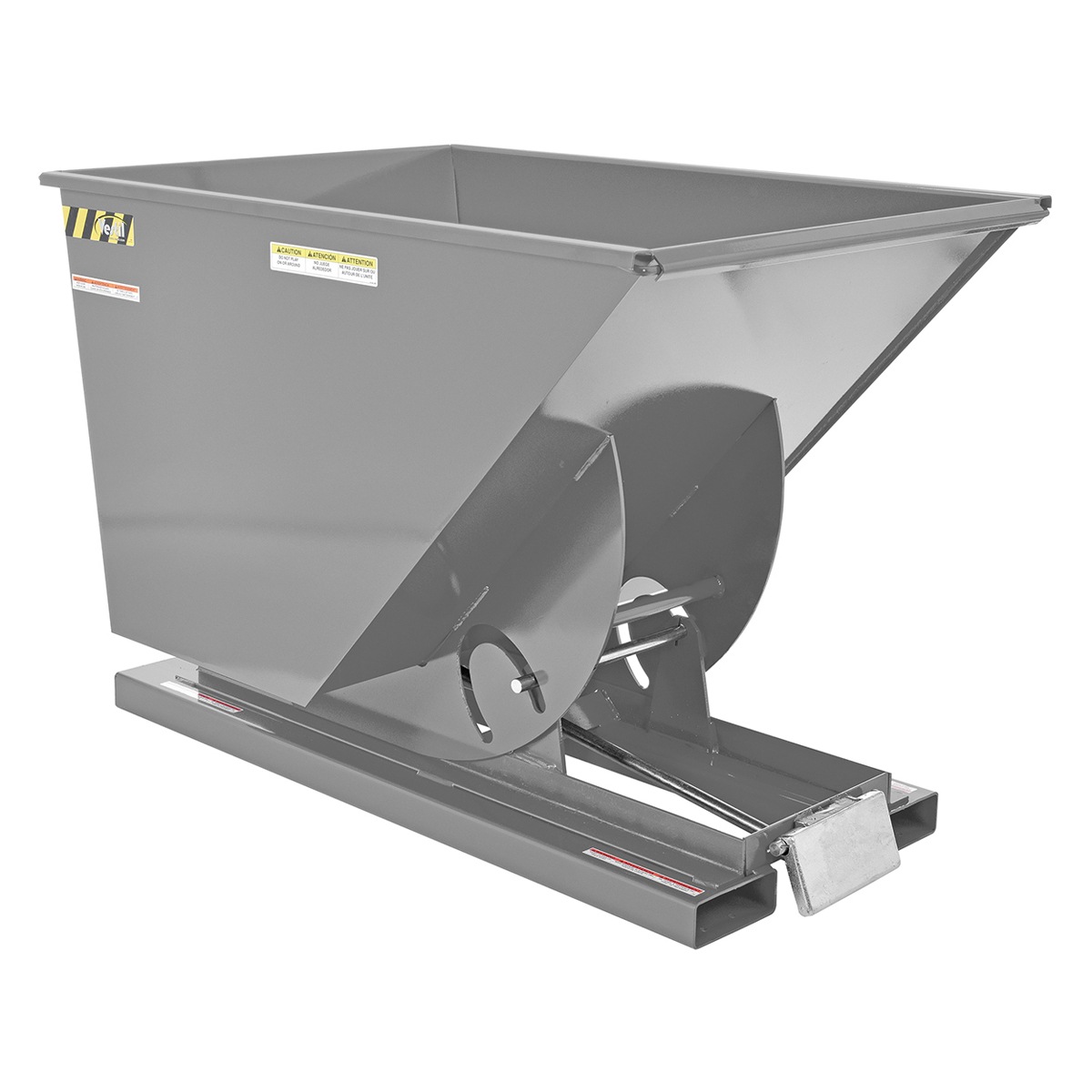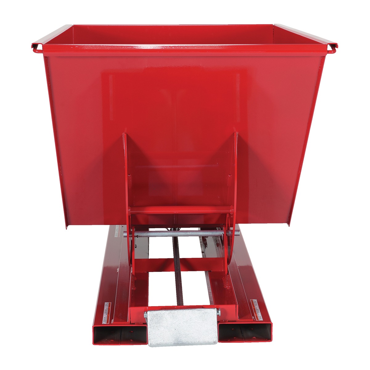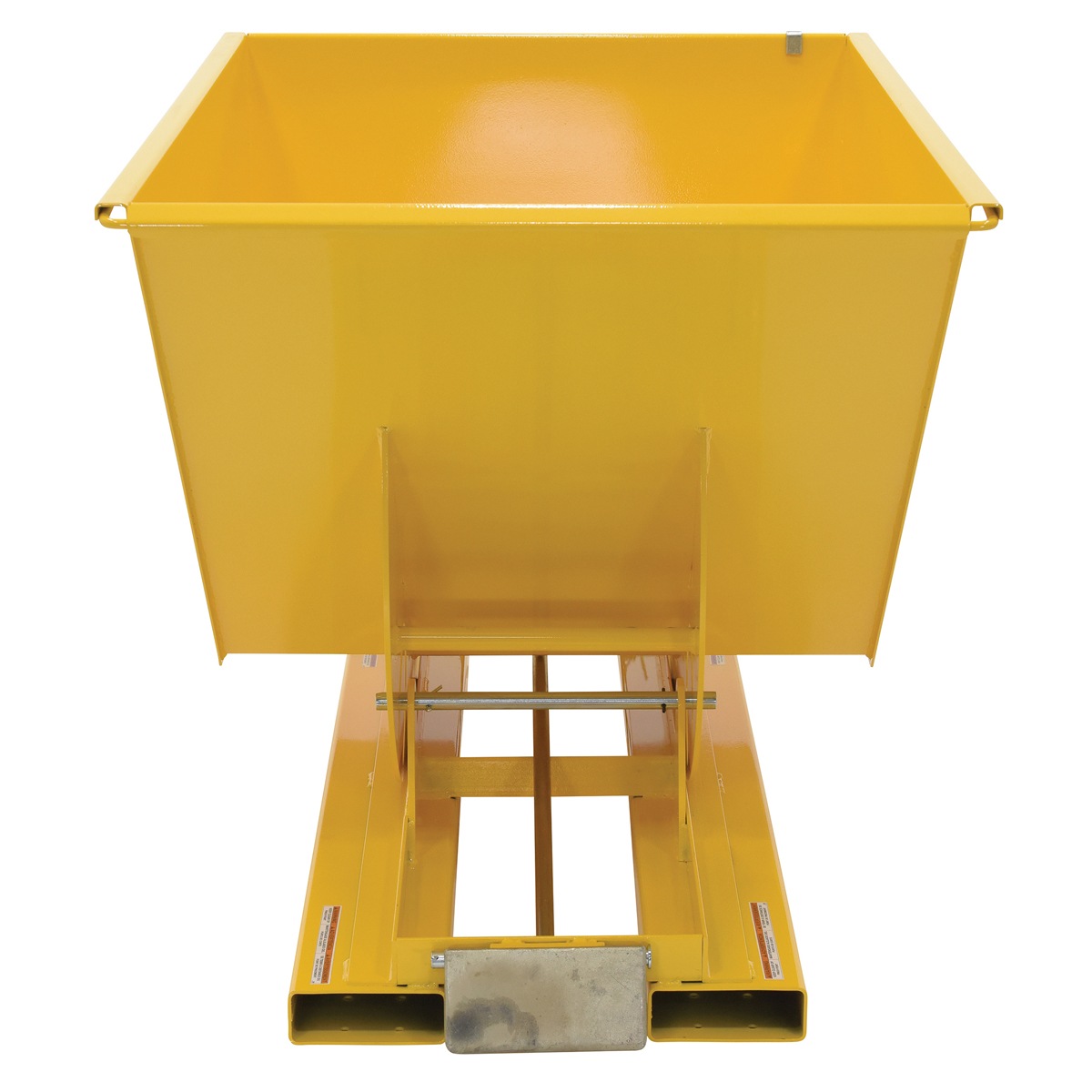 This Heavy Duty Self-Dumping Steel Hopper with Bumper Release automatically dumps when bumper release contacts the front of the dumpster. Hopper returns to an upright and locked position automatically after it dumps. Also includes a cable that may be operated from the seat of the fork truck to manually dump the hopper. The included safety restraint should be properly secured to a fork truck before dumping. (Length Dimension is measured at top of chute.) Hopper is stackable if you stack the top hopper turned ninety (90) degrees from the bottom. Self-dumping hoppers facilitate compliance with OSHA General Industry rule 29 CFR 1910.178(m)(5)(iii) by allowing lift truck operators to remain at the controls of their truck throughout the dumping process.