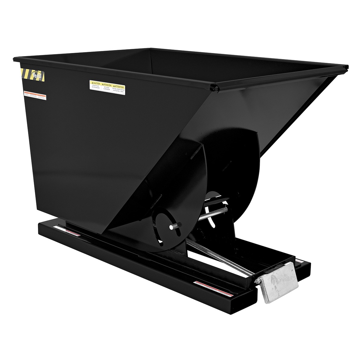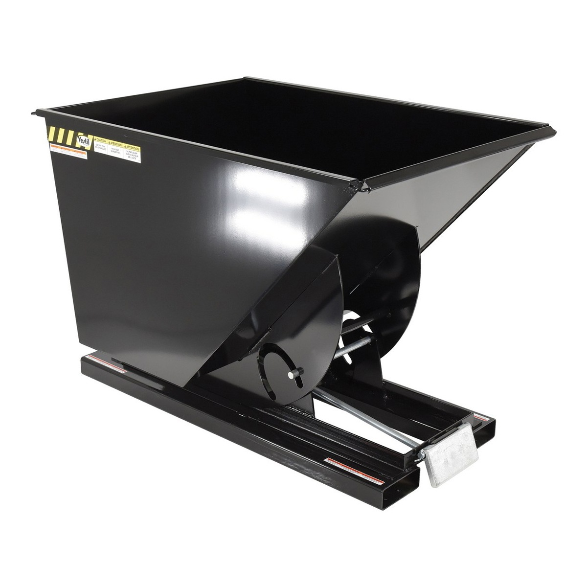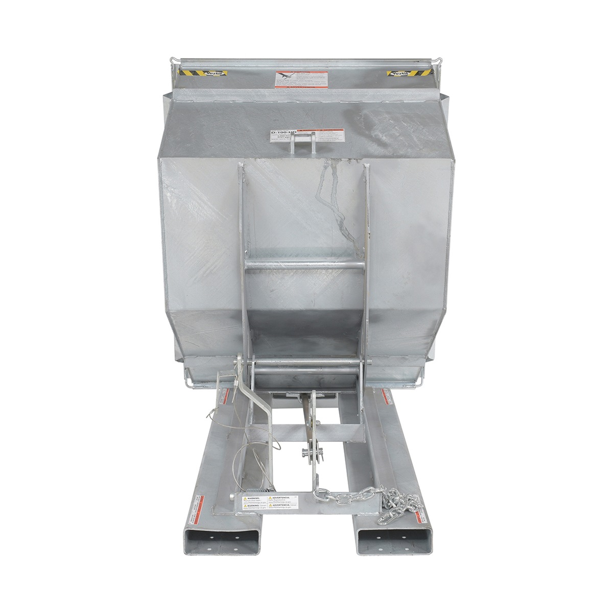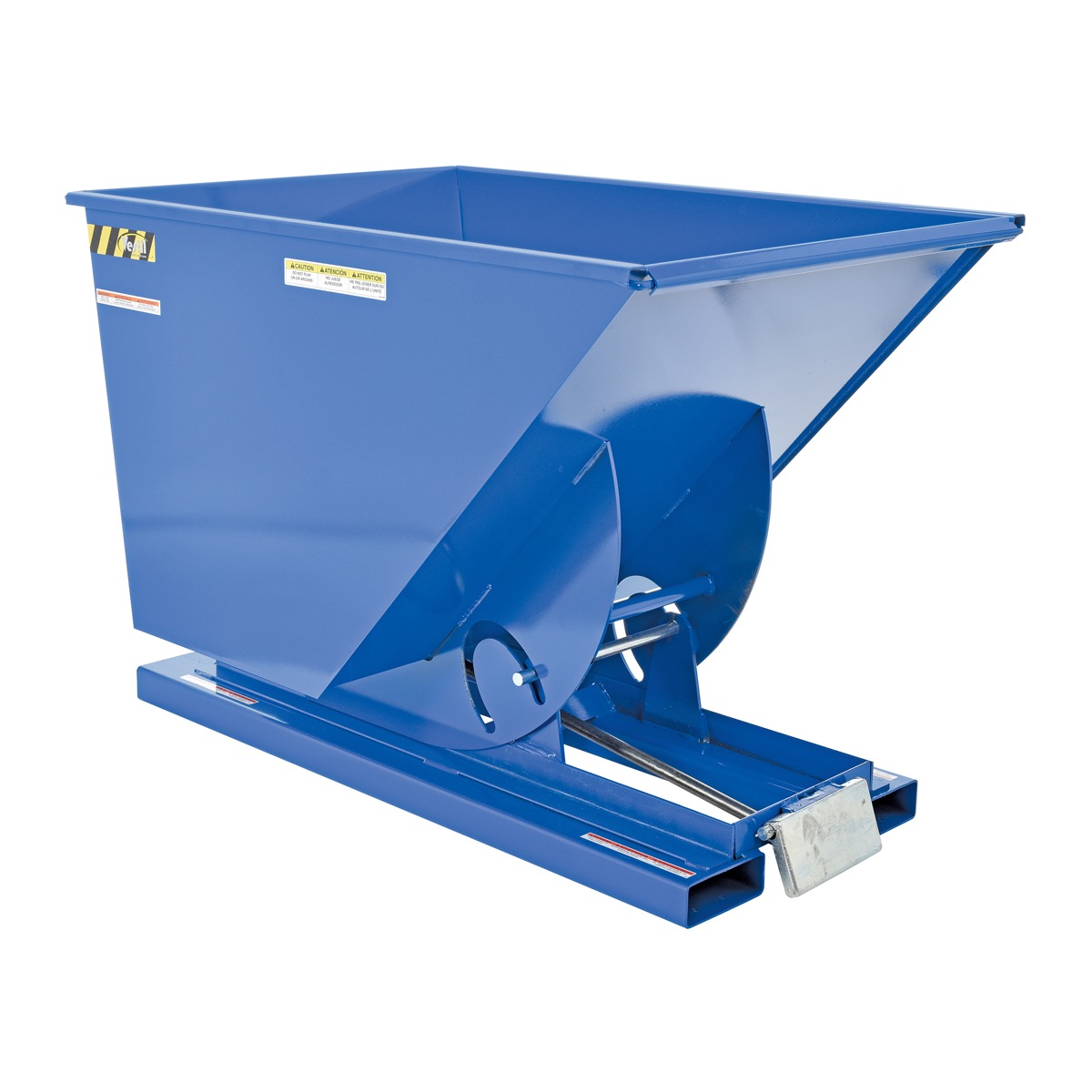 This Heavy Duty Self-Dumping Steel Hopper with Bumper Release automatically dumps when bumper release contacts the front of the dumpster. Hopper returns to an upright and locked position automatically after it dumps. Also includes a cable that may be operated from the seat of the fork truck to manually dump the hopper. The included safety restraint should be properly secured to a fork truck before dumping. (Length Dimension is measured at top of chute.) Hopper is stackable if you stack the top hopper turned ninety (90) degrees from the bottom. Self-dumping hoppers facilitate compliance with OSHA General Industry rule 29 CFR 1910.178(m)(5)(iii) by allowing lift truck operators to remain at the controls of their truck throughout the dumping process.