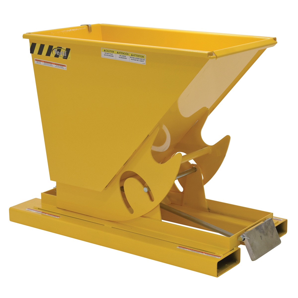 This Medium Duty Self-Dumping Steel Hopper with Bumper Release automatically dumps when bumper release contacts the front of the dumpster. Hopper returns to an upright and locked position automatically after it dumps. Also includes a cable that may be operated from the seat of the fork truck to manually dump the hopper. The included safety restraint should be properly secured to a fork truck before dumping. (Length Dimension is measured at top of chute.) Hopper is stackable if you stack the top hopper turned ninety (90) degrees from the bottom. Self-dumping hoppers facilitate compliance with OSHA General Industry rule 29 CFR 1910.178(m)(5)(iii) by allowing lift truck operators to remain at the controls of their truck throughout the dumping process.