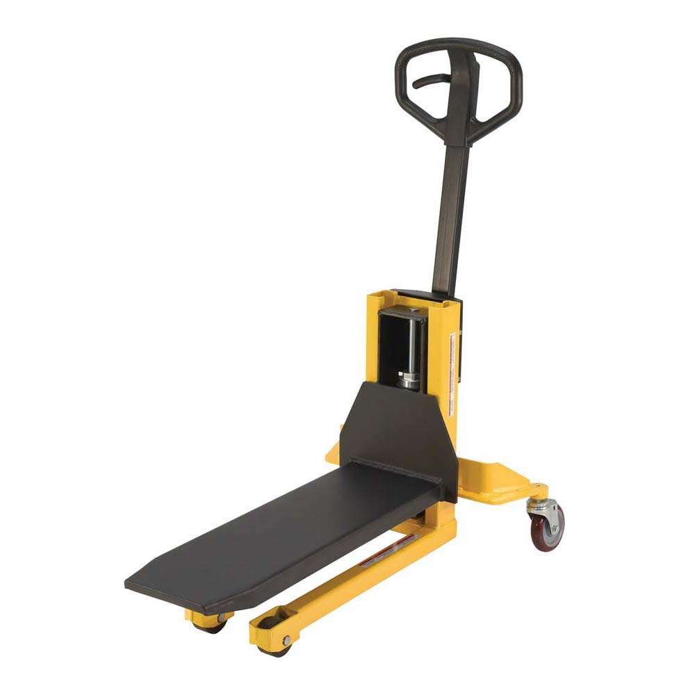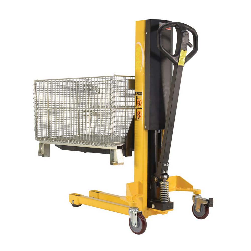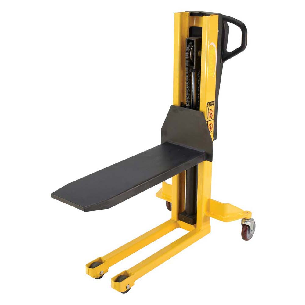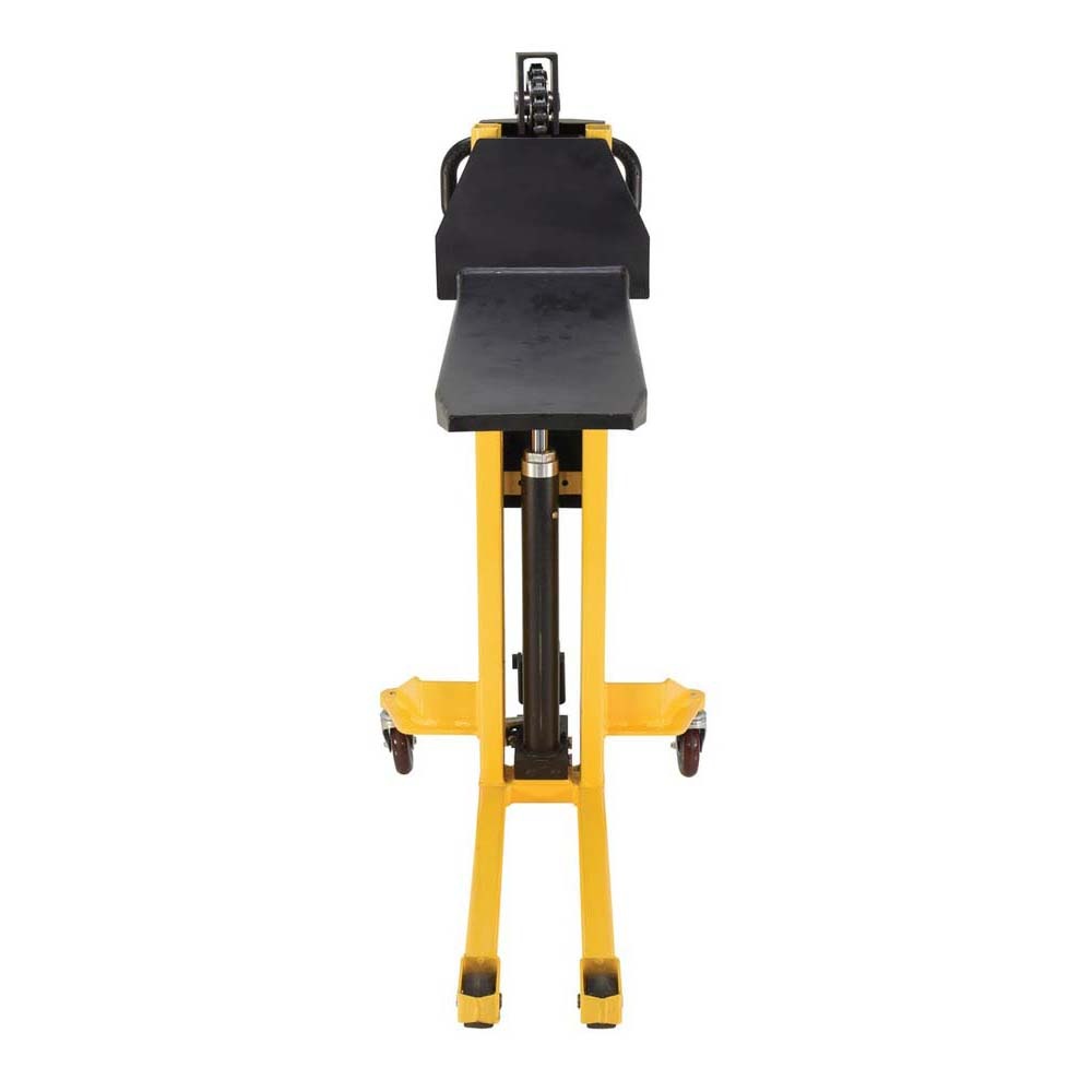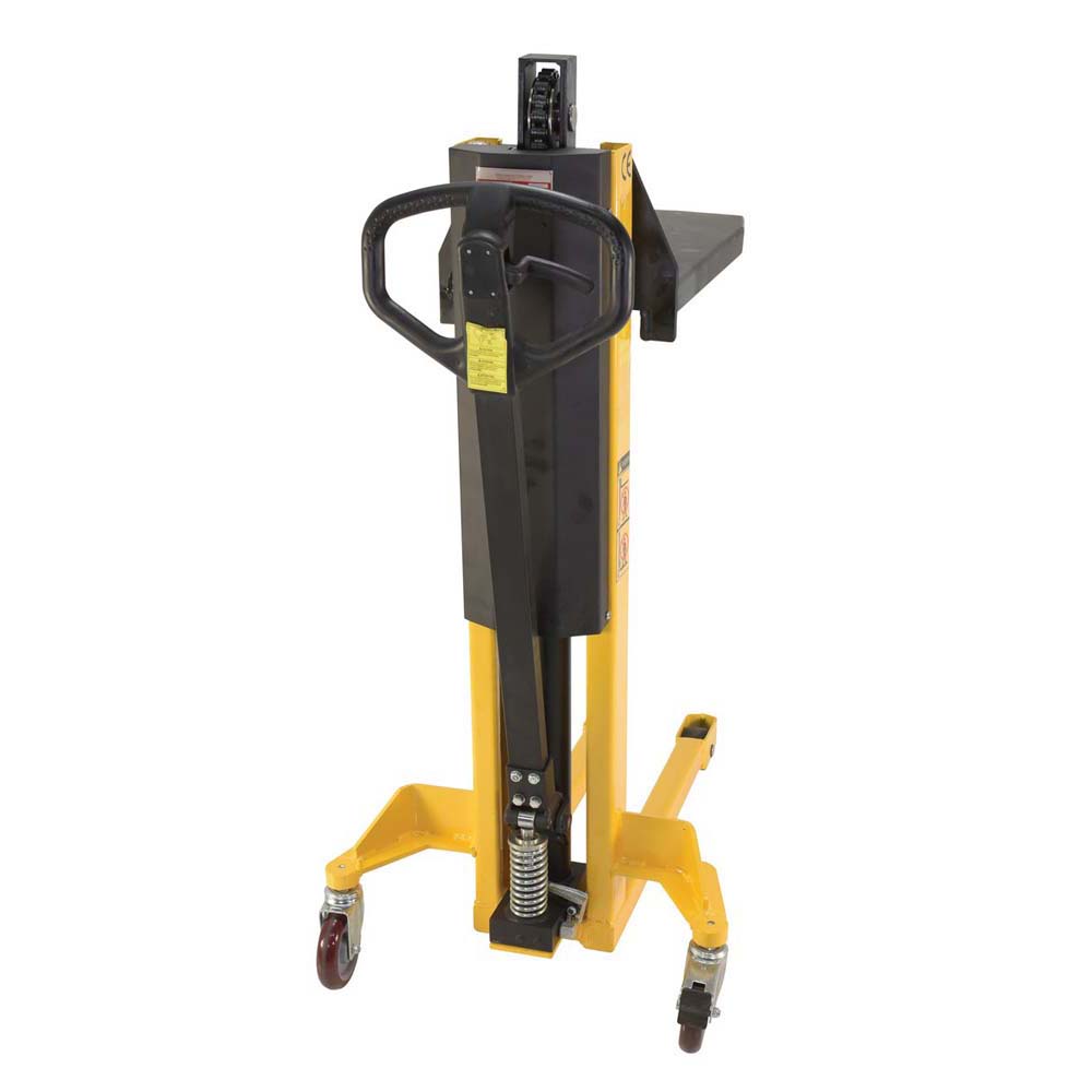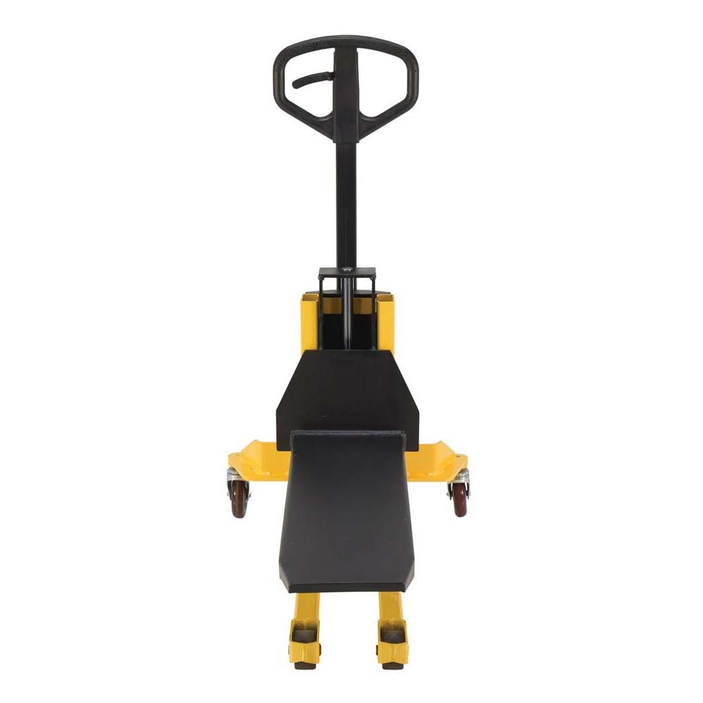 A single fork skid positioner lifter is a new design of an old classic. Instead of the usual two skinny forks to lift open bottom skids, crates, and baskets this model has one large centered fork. The fork is open on 3 sides for easy loading and unloading of products. The high handle not only allows for steering, but as the pumping mechanism to raise and lower the height of the fork. Unit rolls on casters and includes a foot brake for secured positioning during transition periods. The compact design takes up minimal storage space, when not in use.