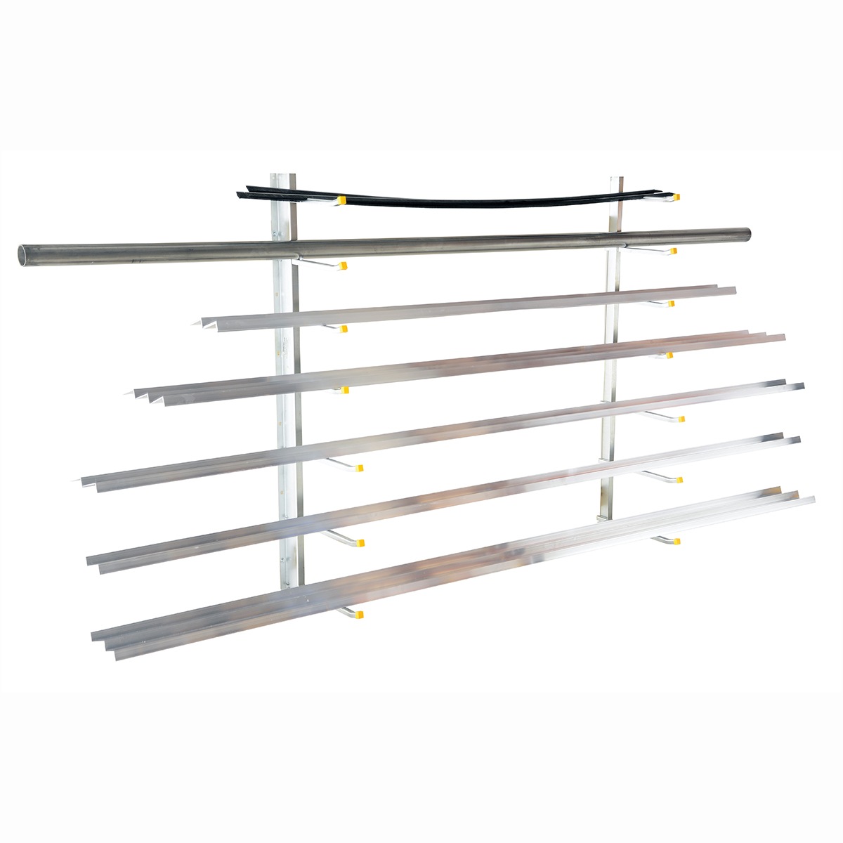 This Economical Material Rack is a wall mounted unit with dual supports. It comes with three (3) long arms and four (4) short arms. The bright zinc plating provides a long term, attractive appearance.