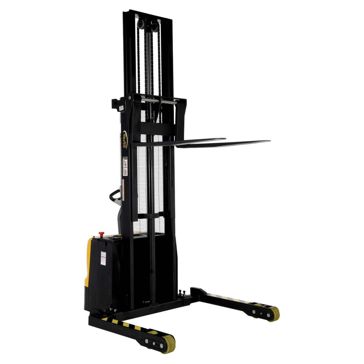 The Double Mast Fully Powered Electric Stacker transports loads throughout warehouse facilities quickly and with less effort. High torque drive and lift motor handles heavy duty jobs. Ergonomic handle features lift/lower controls, proprietary safety enhancing emergency reverse function, and horn. The unit includes an electromagnetic disc brake with automatic dead-man feature that activates when user releases the handle. Powered lifter has two batteries, integral battery charger, and a battery level gauge.