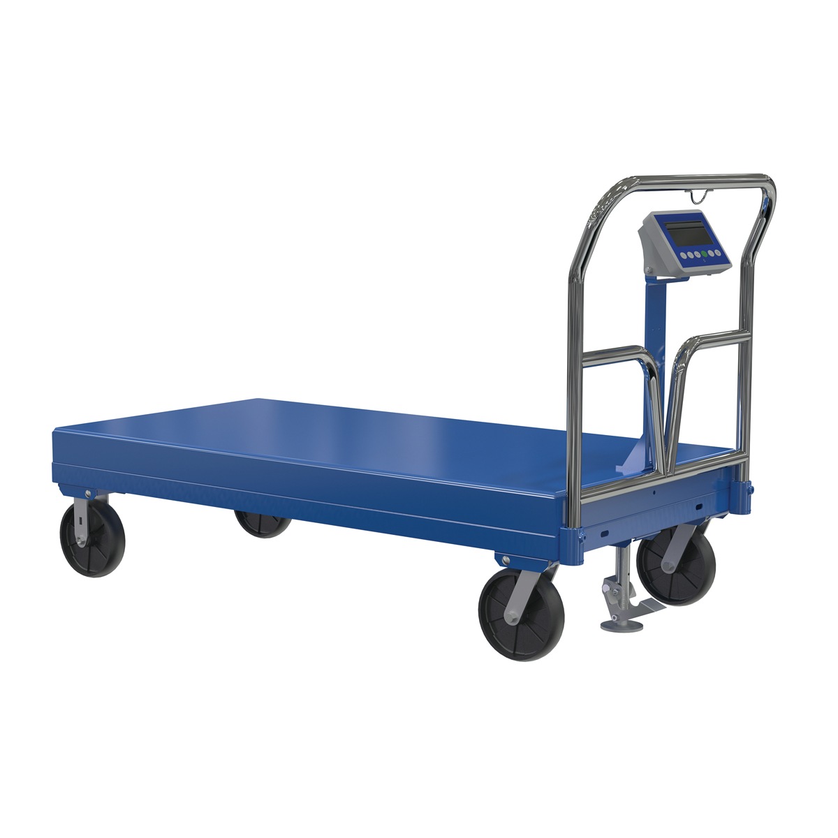 This Steel Platform Truck with solid, smooth steel deck is all welded and features structural reinforcement underneath for extra strength. Includes one (1) removable high-polished steel handle, scale, and rolls smoothly on two rigid and two swivel casters. Comes standard with a floor lock and a durable blue powder coat finish.