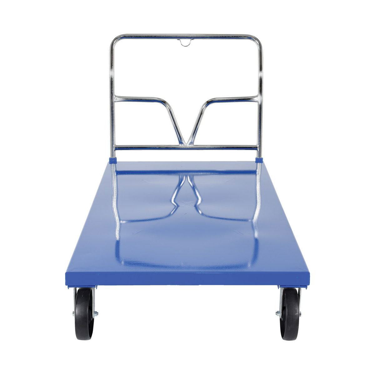 This Steel Platform Truck with solid, smooth steel deck is all welded and features structural reinforcement underneath for extra strength. Includes one (1) removable high-polished steel handle and rolls smoothly on two rigid and two swivel casters. Comes standard with a floor lock and a durable blue powder coat finish.