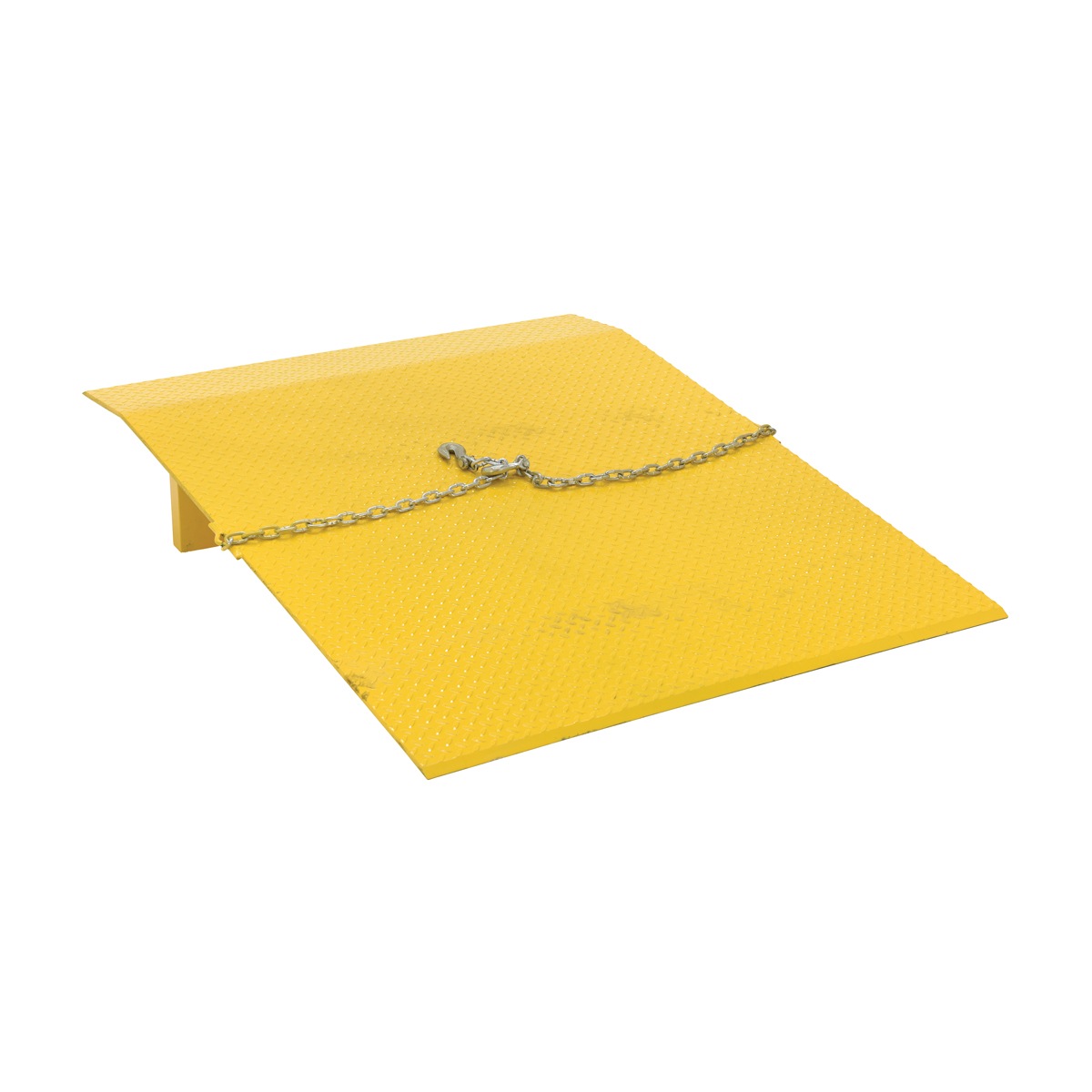 The Steel Truck Dockplate is constructed of high strength INX-55 (55,000 psi) steel. Safety locking legs prevent slippage between truck and dock. Safety tread plate helps provide positive traction. Beveled edges for smooth entry and exit. Chain pickup comes standard. Designed with an 11° bend located 9″ from the beveled edge. The legs are 10″ from the beveled edge. Manufactured in compliance with OSHA. When using three wheeled pallet trucks, select capacity +20% due to concentrated load center of board.