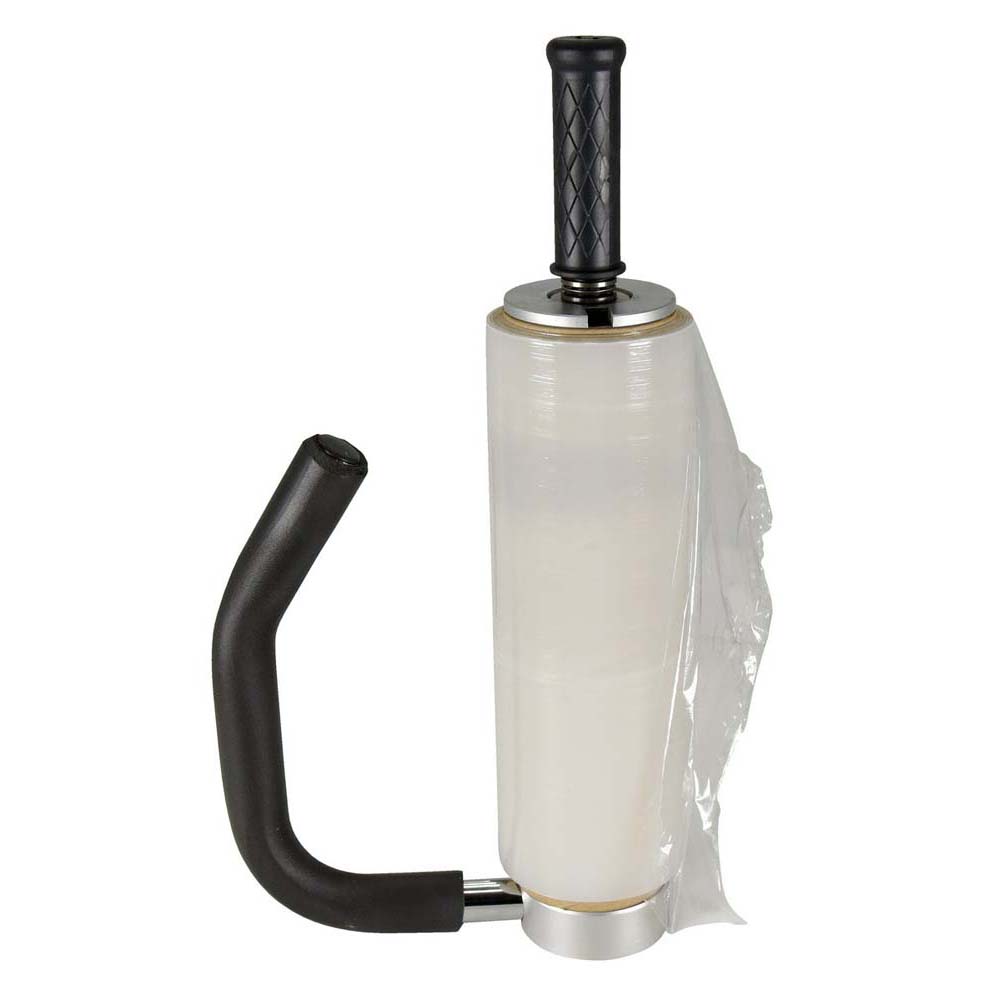 The Hand Held Stretch Wrapper is a lightweight, freewheeling dispenser that maintains precision tension control that insures a tight, smooth application. The ergonomically bent, foam covered handle reduces both bending and fatigue, while allowing operators to apply the bottom row of wrap just as tight as the top.