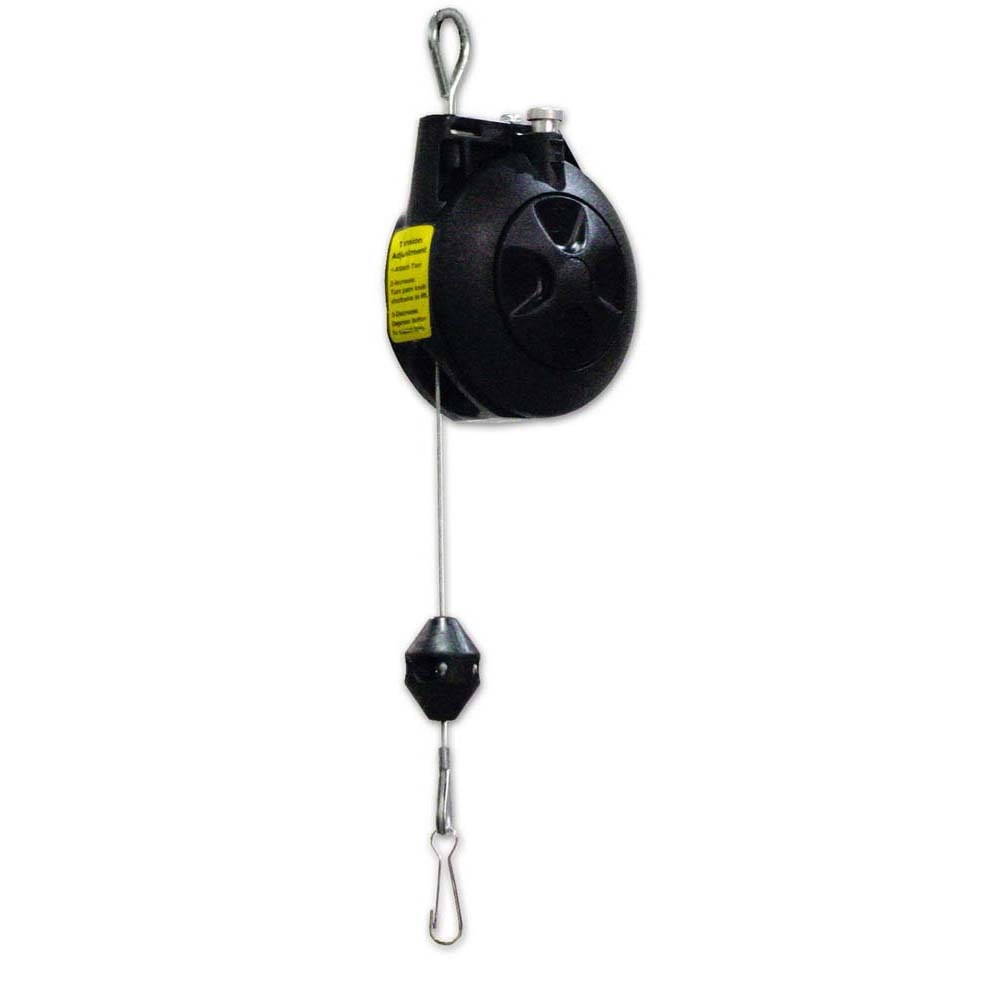 A Tool Balancer is the economical choice for balancing heavy tools. The molded plastic housing has a smooth exterior with rounded edges for maximum ergonomic convenience. Hand-windable spring tension adjustment knob is flush with the housing. Push-button tension release simplifies decrease in tension. Adjustment screw adds drag to spool for fine tuning of tension. Rugged steel upper swivel hook. Oversized cable opening with direct in-line pull to reduce cable wear. Adjustable cable stop and lower safety snap hook. Spring operation – no electricity needed.