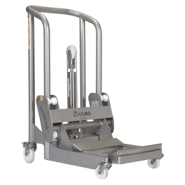 A Stainless Steel Hydraulic Foot Pump Roll Handler is great for an assortment of areas including the food handling service industries. The 304L stainless steel construction, including hydraulic cylinders and piston The design is sleek, smooth, and easily washable for before and after use in hygienic areas. The raising and lowering of the platform to the precise position is made easy by the hydraulic foot pump design, which diminishes needless bending when loading/unloading material. A rounded handle style allows for a proper two handed grip when maneuvering around work areas, while the perfect open cradle platform lets the user load material from three sides. Cradle adjusts in 1″ increments up to 16″ wide. The handler rolls smoothly on four swivel casters with two attached rear brakes for safe functionality when in a resting position.