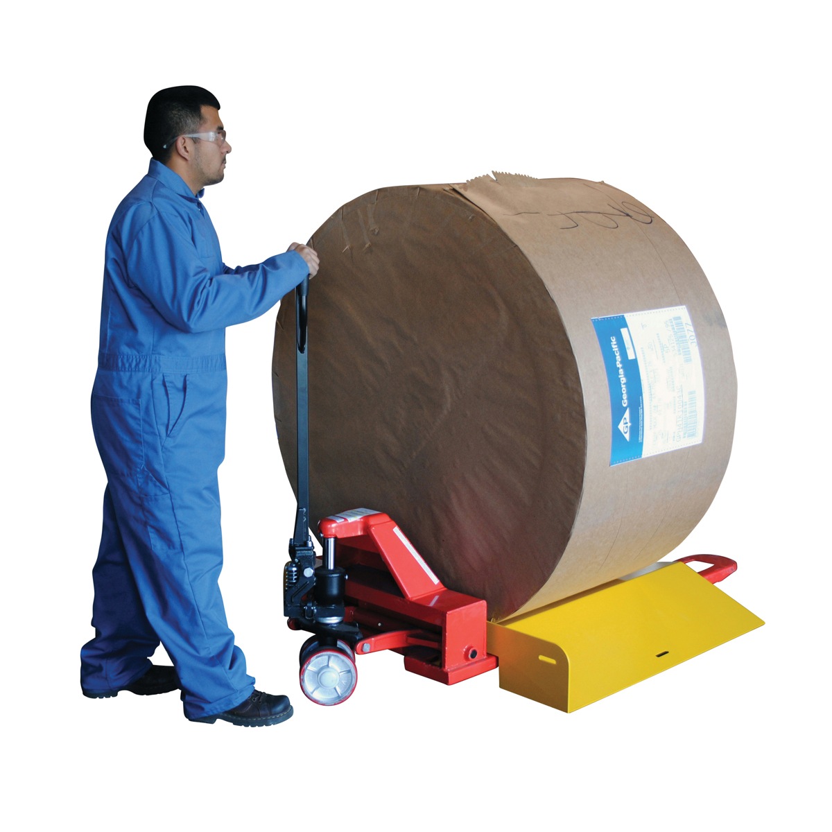 The Pallet Roll Adapter holds and transports rolls of material with standard pallet trucks. The sloped ends allow for manually rolling material into position. V-shaped center holds rolls in position. The built-in fork pockets allow for movement with a standard pallet truck. Unit has a heavy-duty welded construction with a painted finish.