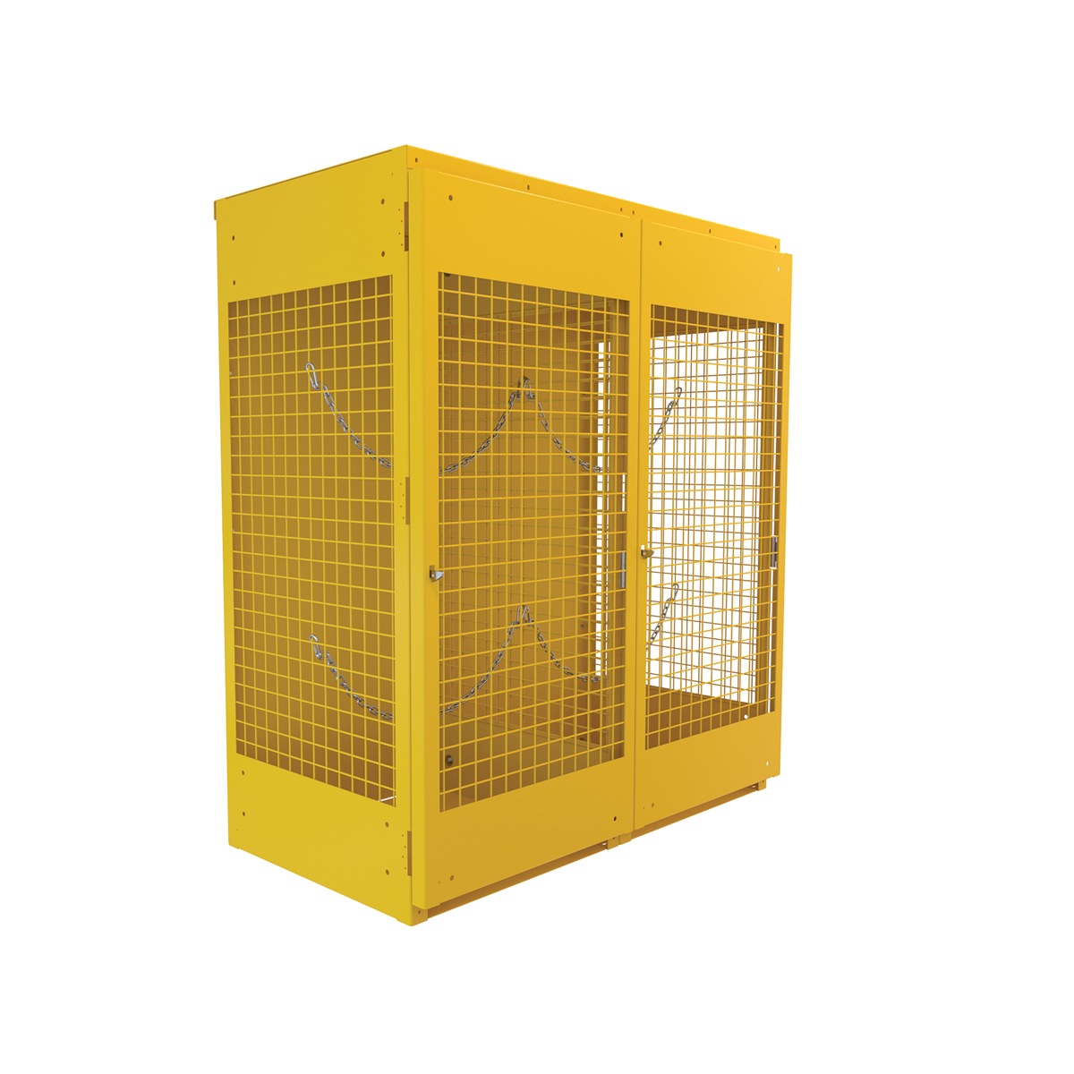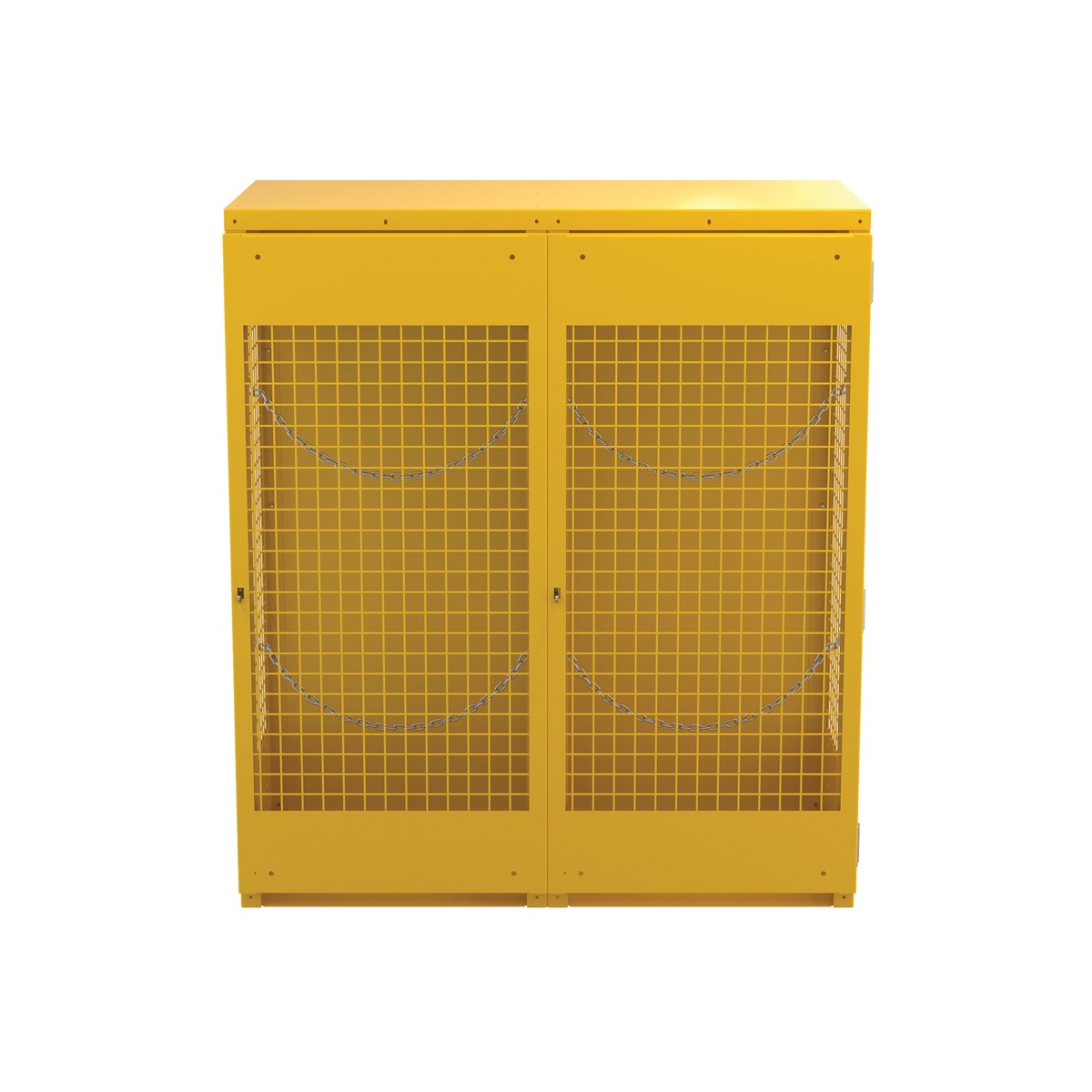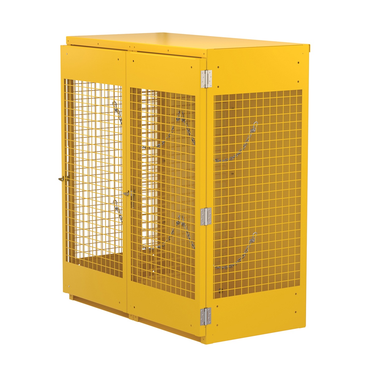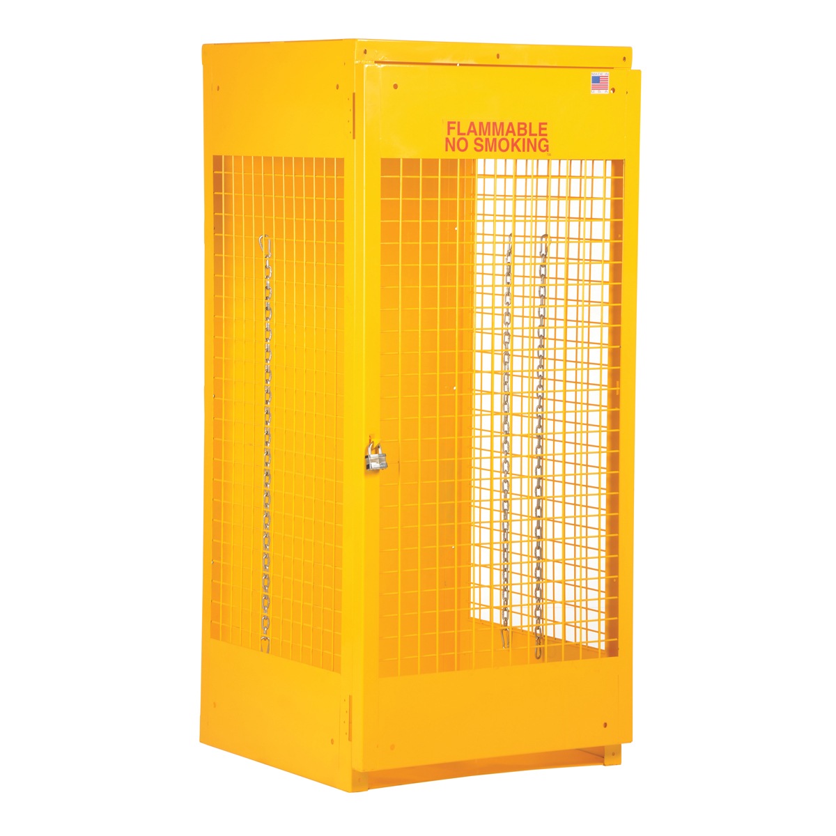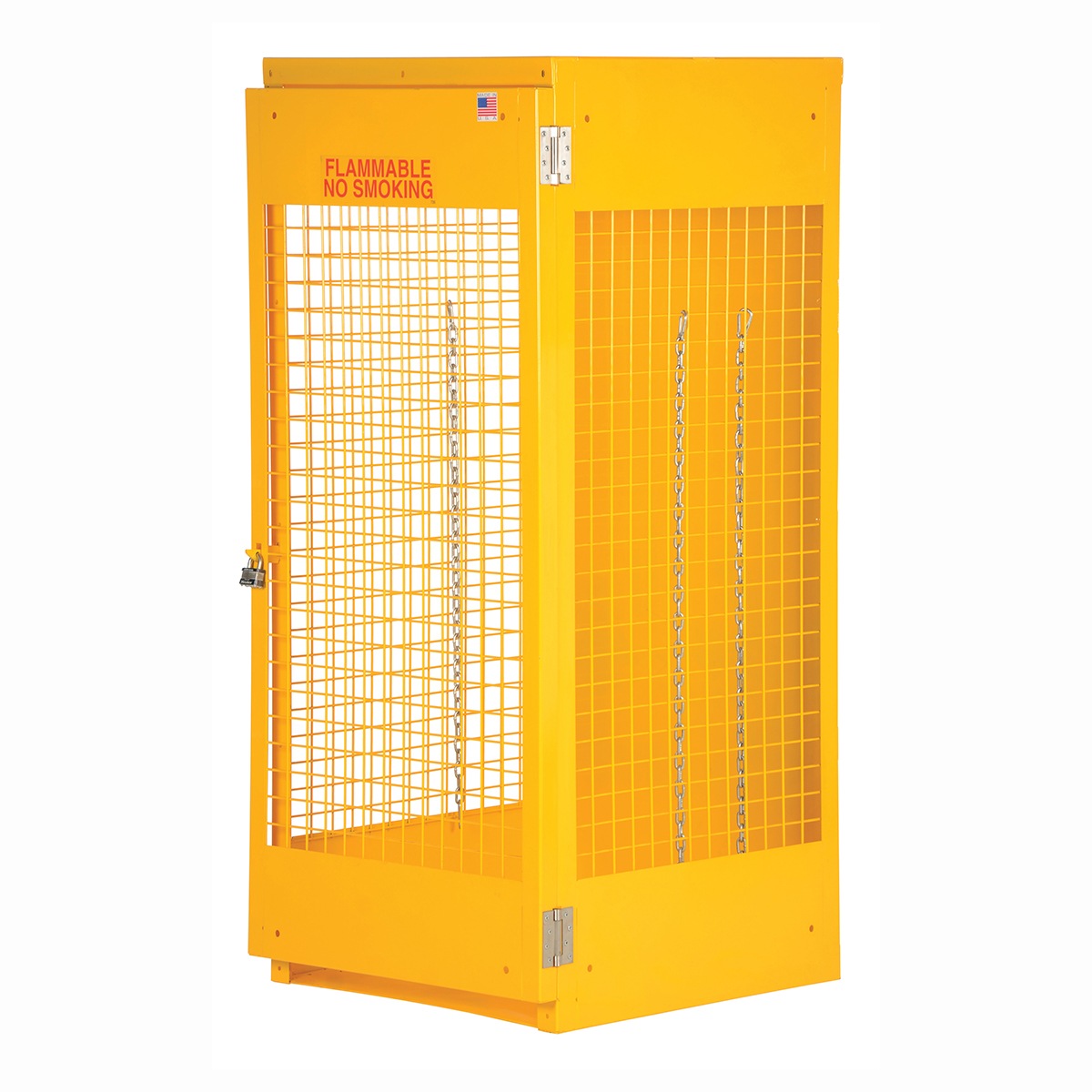 Steel cabinet for storage of cylinders. Cylinder storage capacity is based on cylinder size. Sides and door are made of expanded steel mesh. Bottom, back and top is made of solid sheet steel. Lockable doors protect cylinders (padlock not included). Base includes lag holes for securing cylinders. Include chains for securing cylinders. Includes red lettered signage noting “Flammable – No Smoking” contents. Rugged steel construction with safety yellow finish. Powder coat finish.