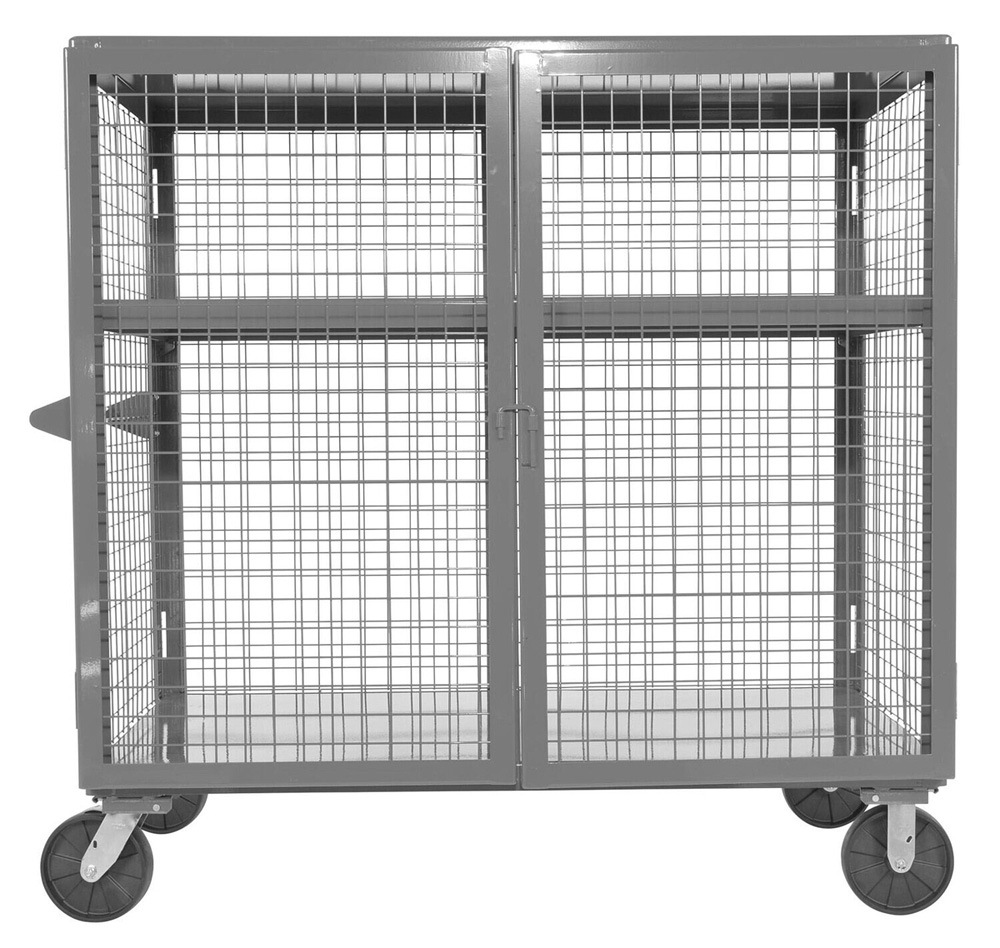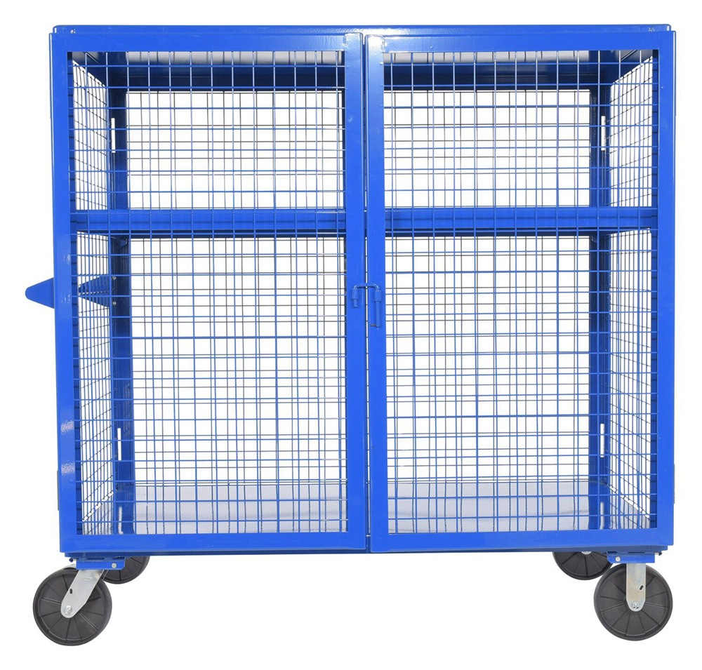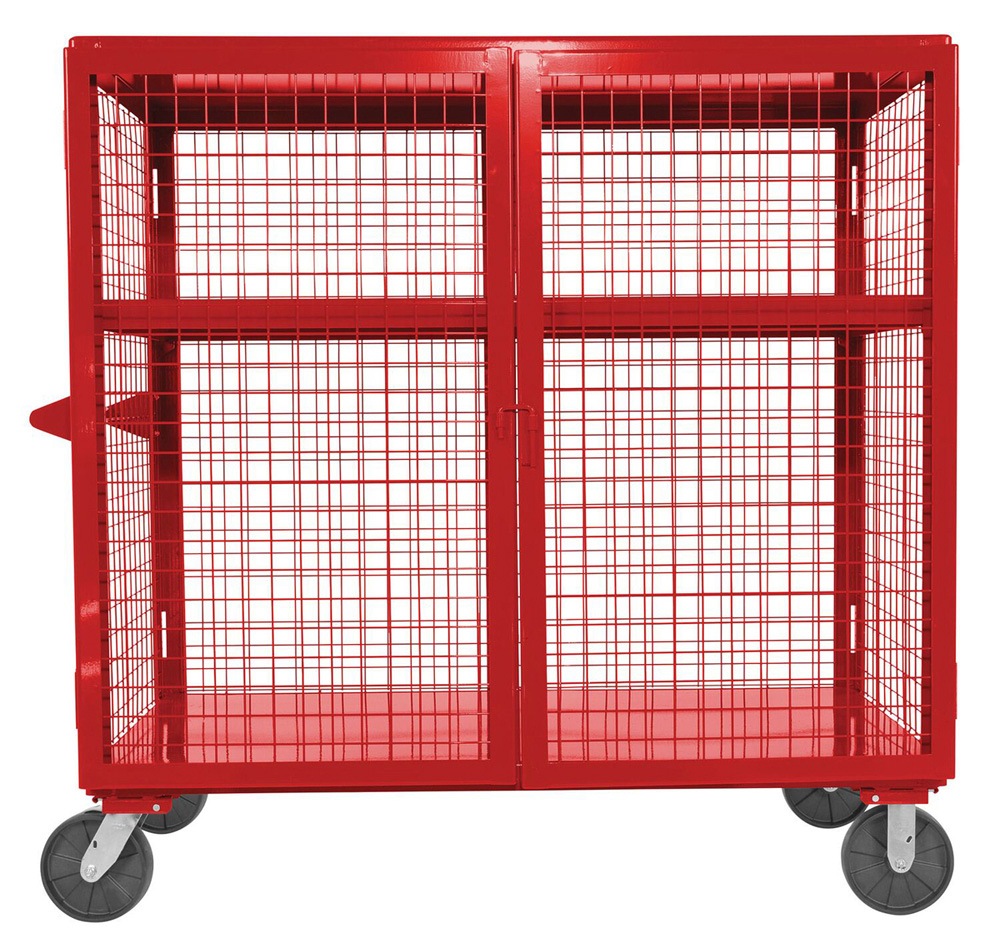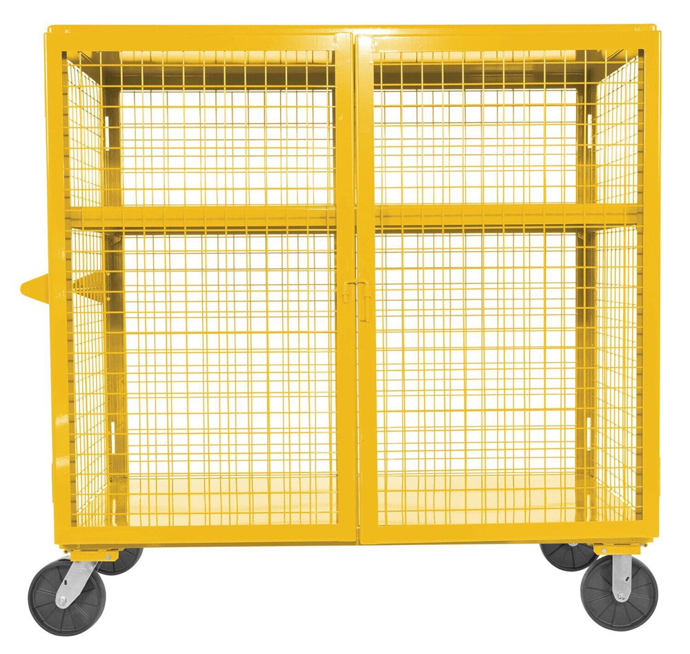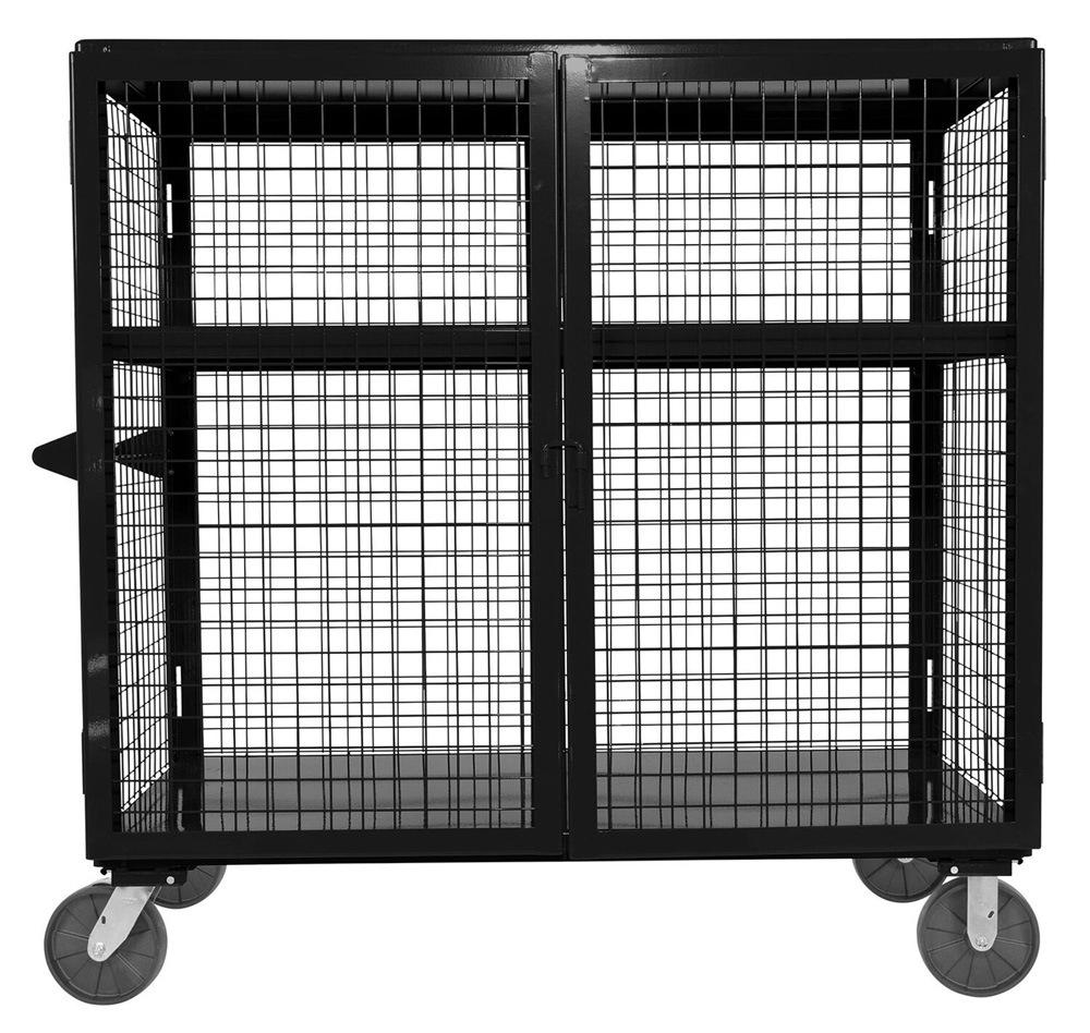 A welded security cart is a durable way to secure goods. The two shelf design, one upper shelf and one bottom platform, gives the user space and options of item placement. The distance between the two shelves allows items both big and small to be protected inside the cart. A hinged door lets the door swing for simpler loading and unloading.