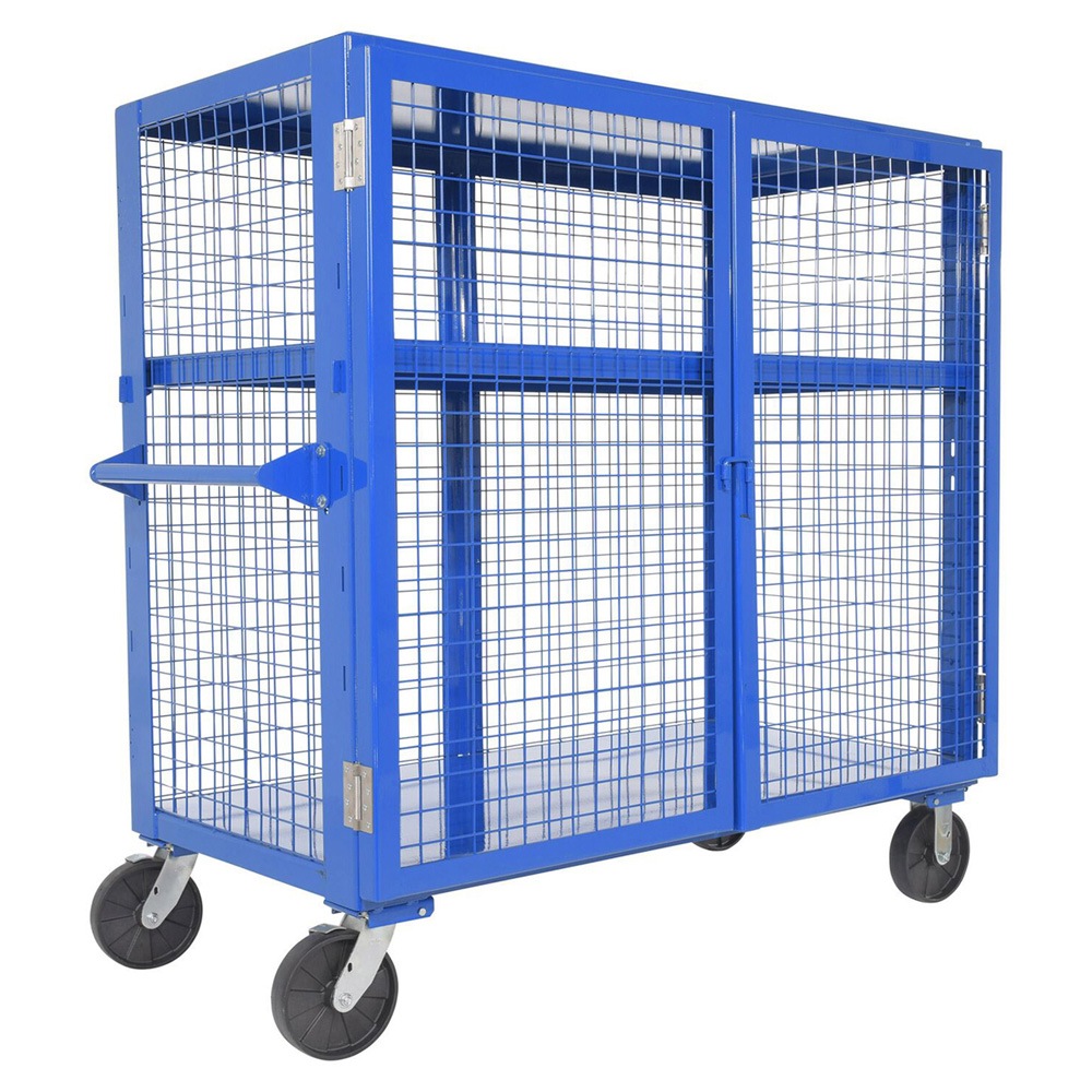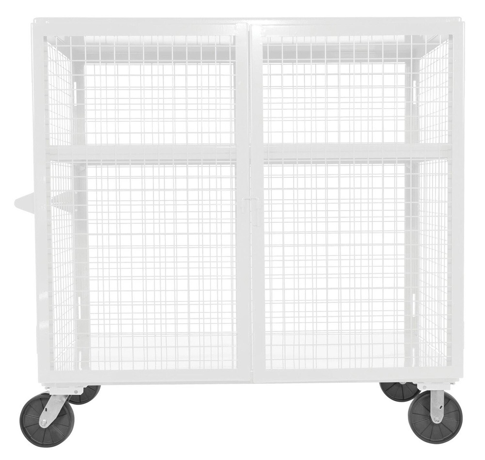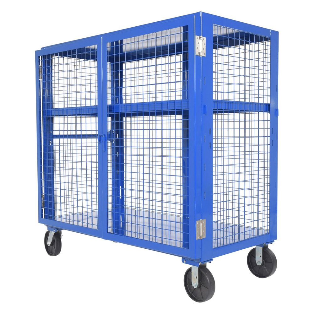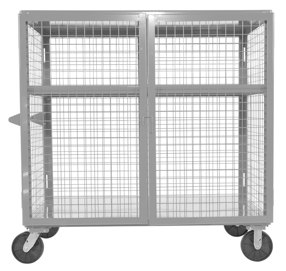 A welded security cart is a durable way to secure goods. The two shelf design, one upper shelf and one bottom platform, gives the user space and options of item placement. The distance between the two shelves allows items both big and small to be protected inside the cart. A hinged door lets the door swing for simpler loading and unloading.